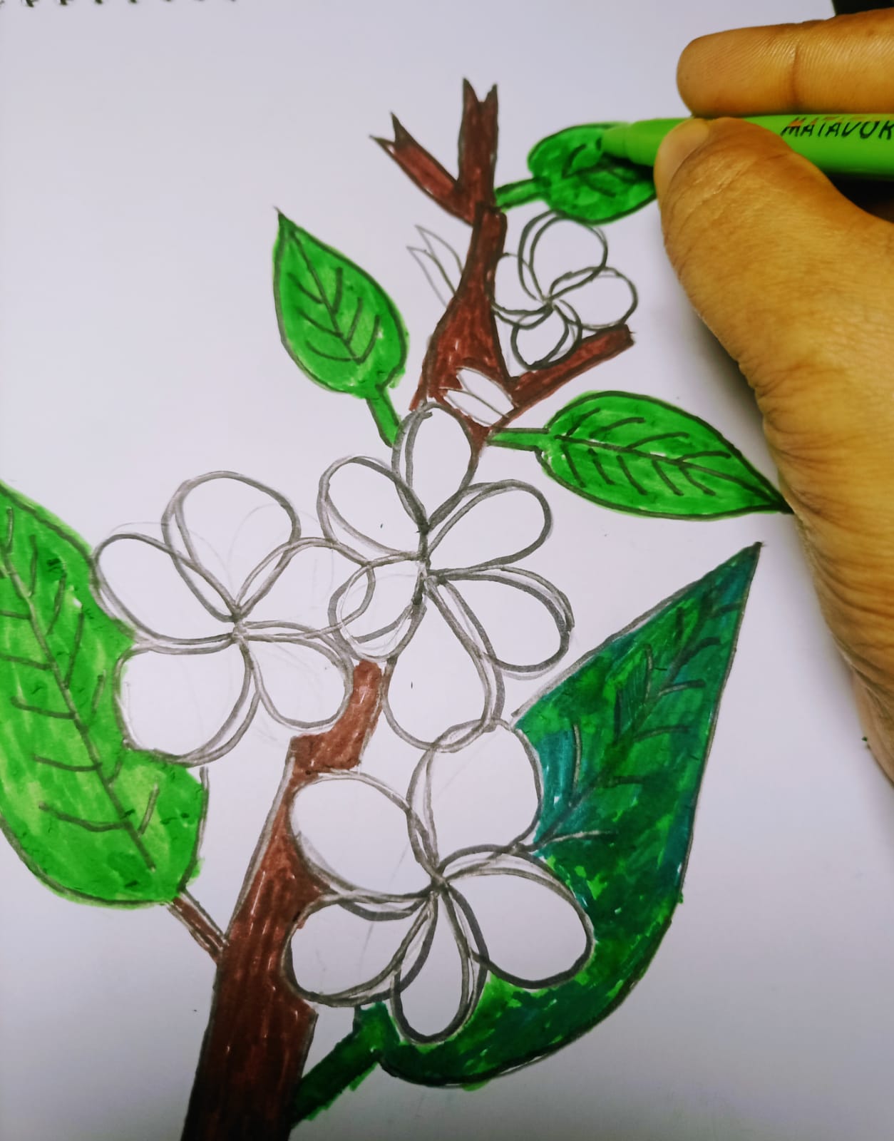 এখন সবুজ কালারের মার্কার পেন নিয়েছি। সবুজ কালারের মার্কার পেন দিয়ে পাতা গুলো কালার করে নিয়েছি।