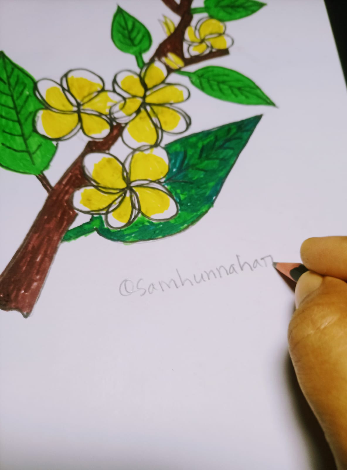 এভাবে যখন আমার অংকনটি রেডি হয়ে যায় পুরো ফুলের অংশ কালারিং করা। তখন পাশে আমার একটি সাইন দিয়ে দিলাম। পুরোপুরি রেডি হয়ে যাওয়ার পরে আমি আপনাদের সাথে উপস্থাপন করলাম। আশা করি আমার আজকের শেয়ার করা কাঠগোলাপ ফুলের খুব সুন্দর একটি আর্ট আপনাদের বেশ ভালই লাগবে। যেখানে ফুল এবং পাতা সেই সাথে গাছের কিছু অংশ আপনাদের সাথে এঁকে কালার করে শেয়ার করেছি। তো বন্ধুরা নিশ্চয়ই ভালো লাগবে। কেমন লেগেছে মতামত দিয়ে জানালে বেশ ভালোই লাগবে।