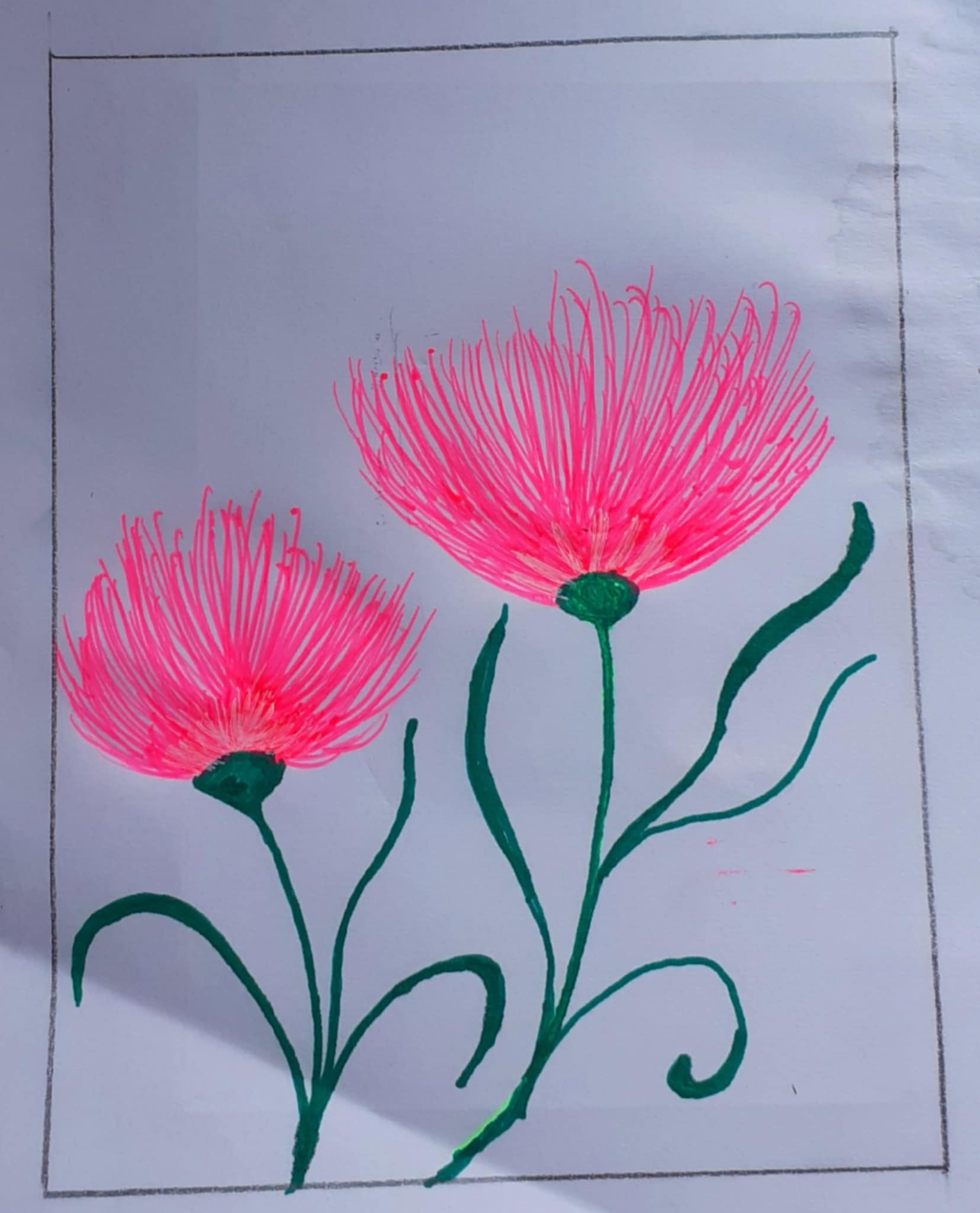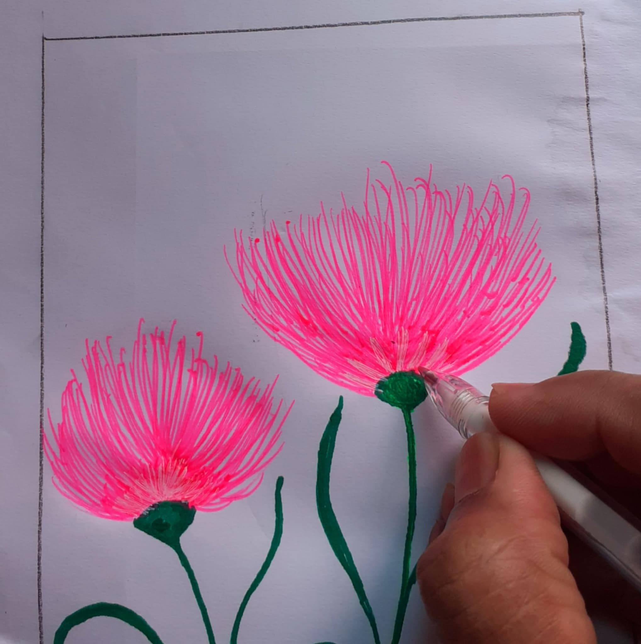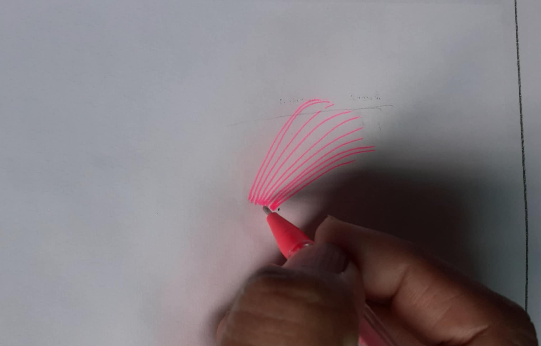 আয়তক্ষেত্রের এক পাশে গোলাপী জেল পেন দিয়ে কিছু দাগ দিয়ে নিয়েছি। একইভাবে অন্যপাশে একইভাবে কিছু দাগ টেনে নিয়েছি গোলাপী জেল পেন দিয়ে। আর এভাবেই কলমের দাগেই এঁকে নিলাম একটি সুন্দর ফুল।