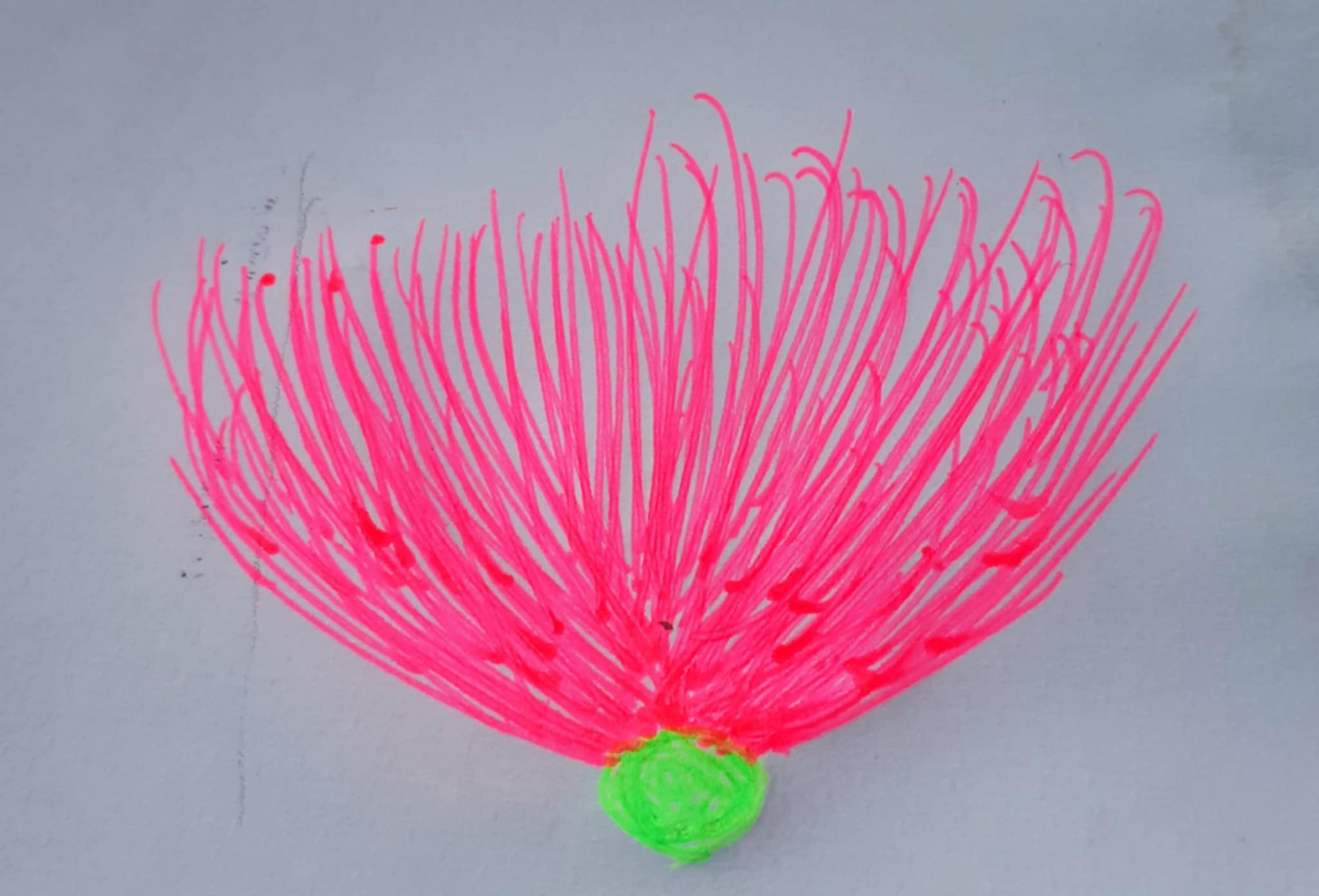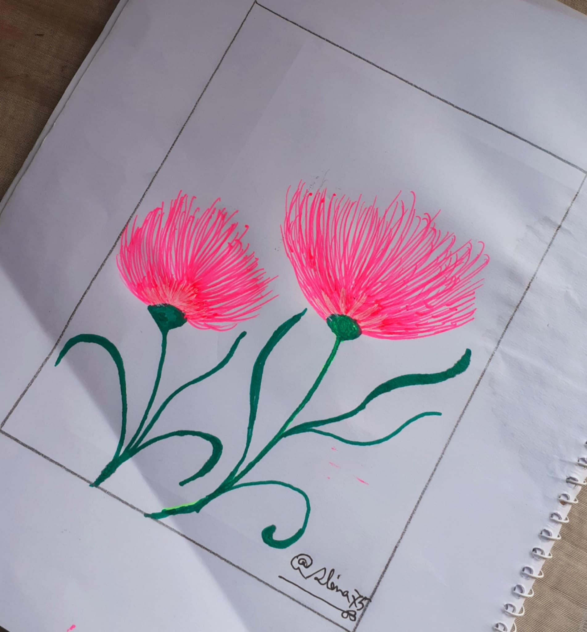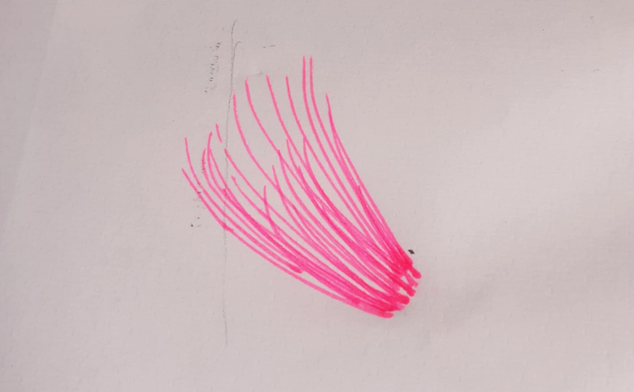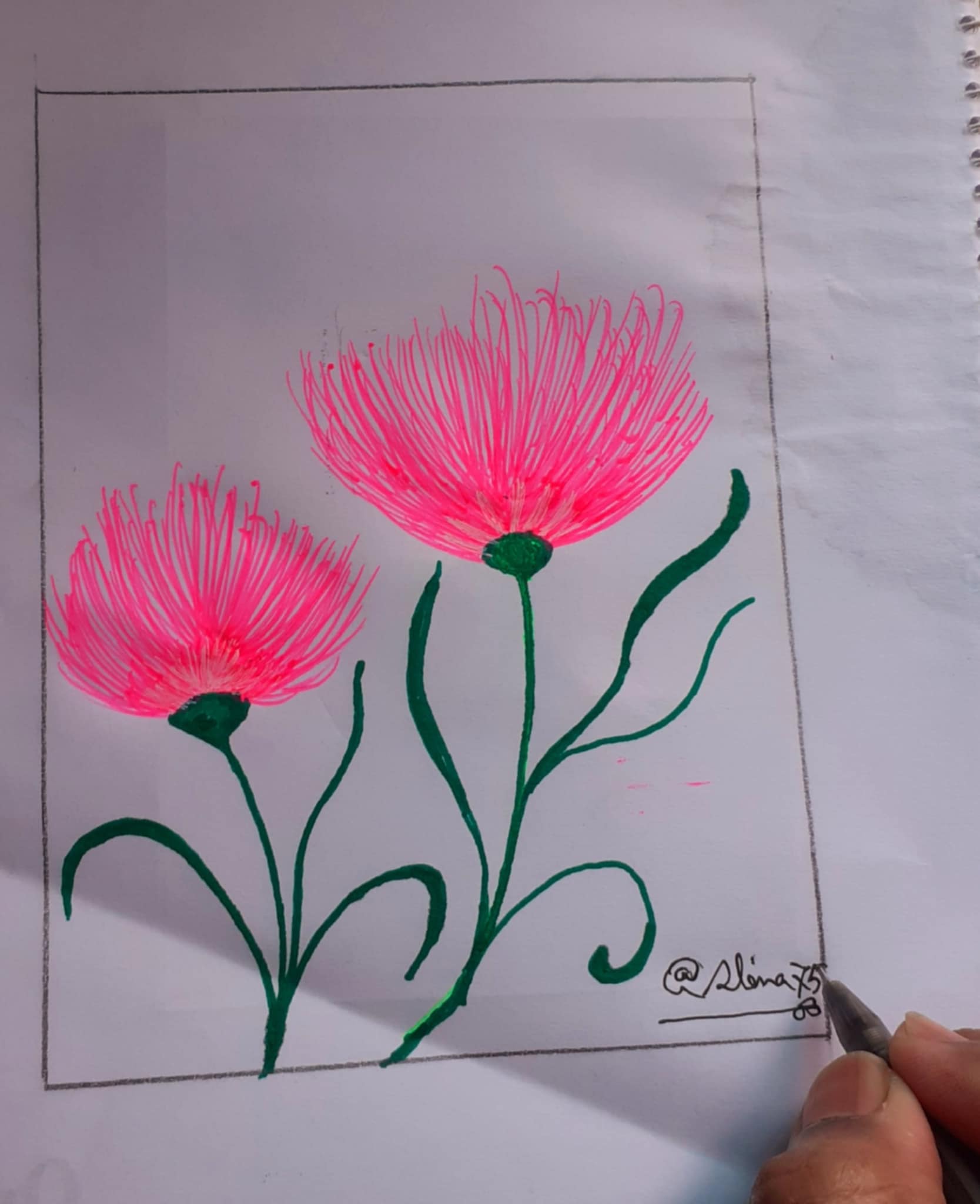 আয়তক্ষেত্রের এক পাশে গোলাপী জেল পেন দিয়ে কিছু দাগ দিয়ে নিয়েছি। একইভাবে অন্যপাশে একইভাবে কিছু দাগ টেনে নিয়েছি গোলাপী জেল পেন দিয়ে। আর এভাবেই কলমের দাগেই এঁকে নিলাম একটি সুন্দর ফুল।
