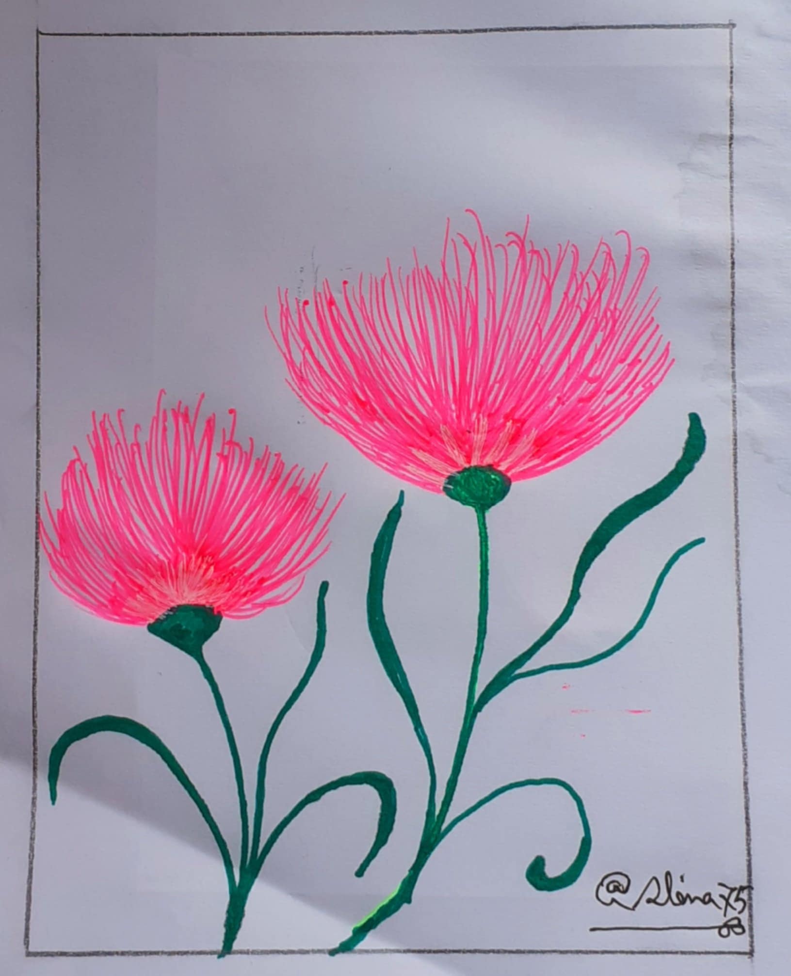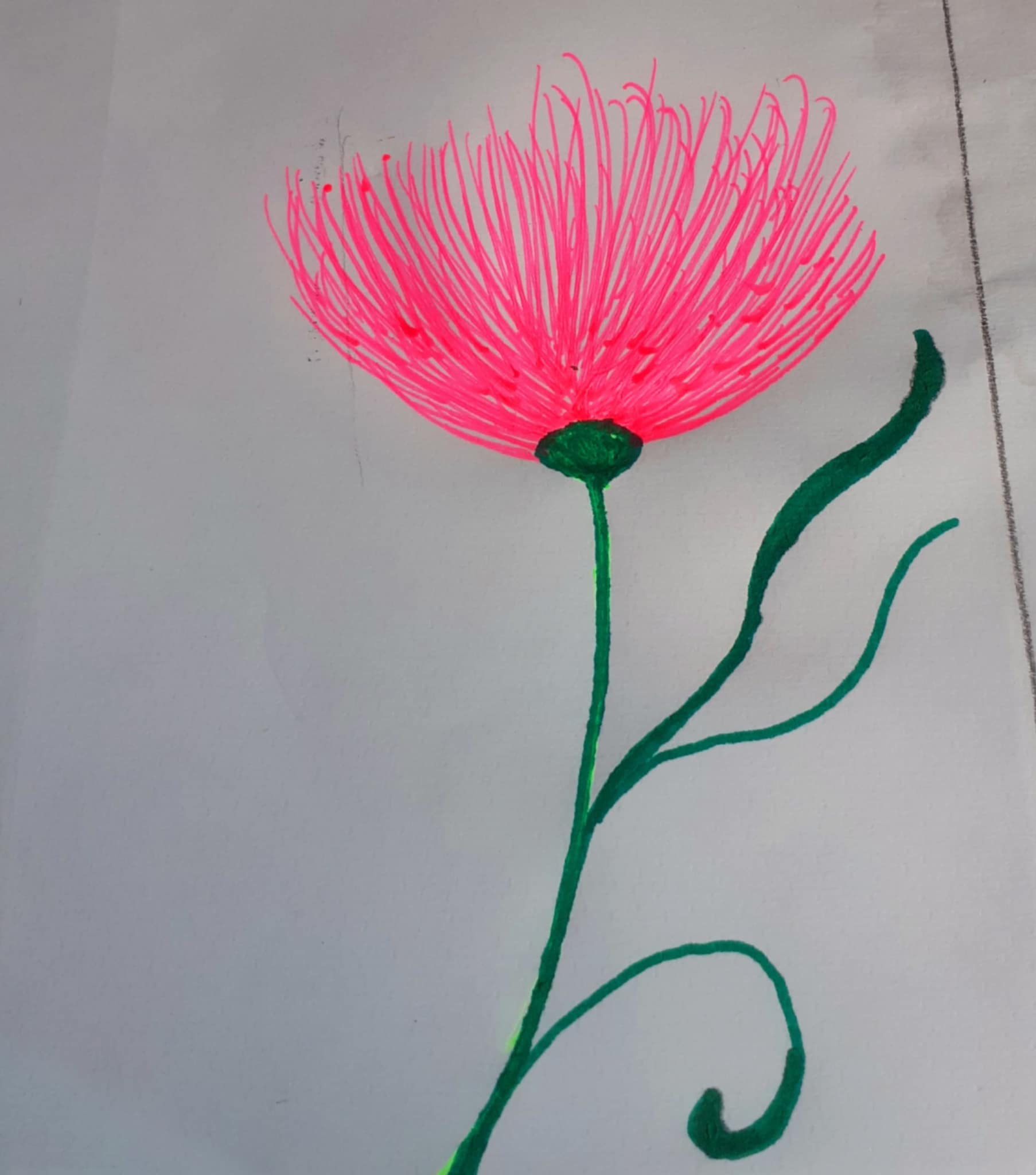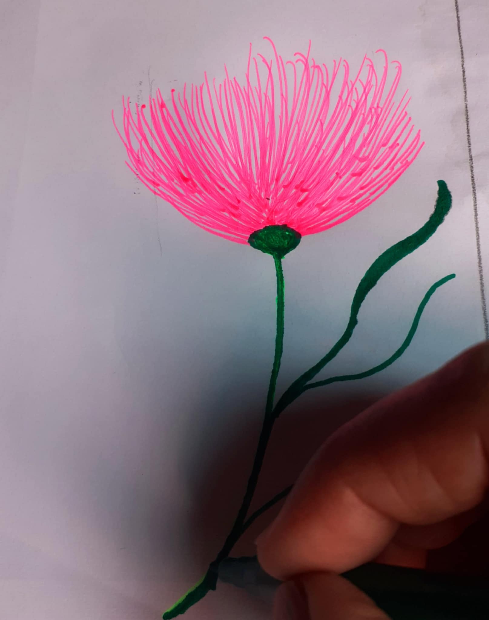প্রথমে হাল্কা সবুজ রং দিয়ে ফুলের বৃন্তটি এঁকে নিয়েছিলাম। কিন্তু ভালো লাগছিলো না বিধায় সবুজ রং এর সাইন পেন দিয়ে ফুলের বৃন্ত,ডাল ও পাতা এঁকে নিয়েছি।