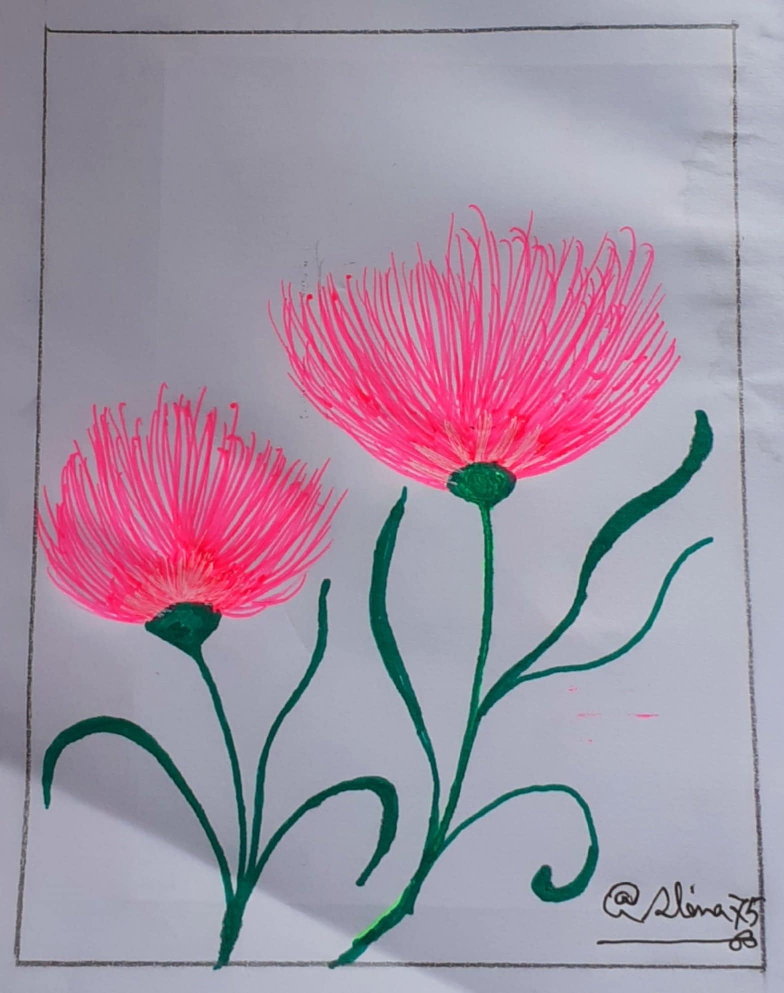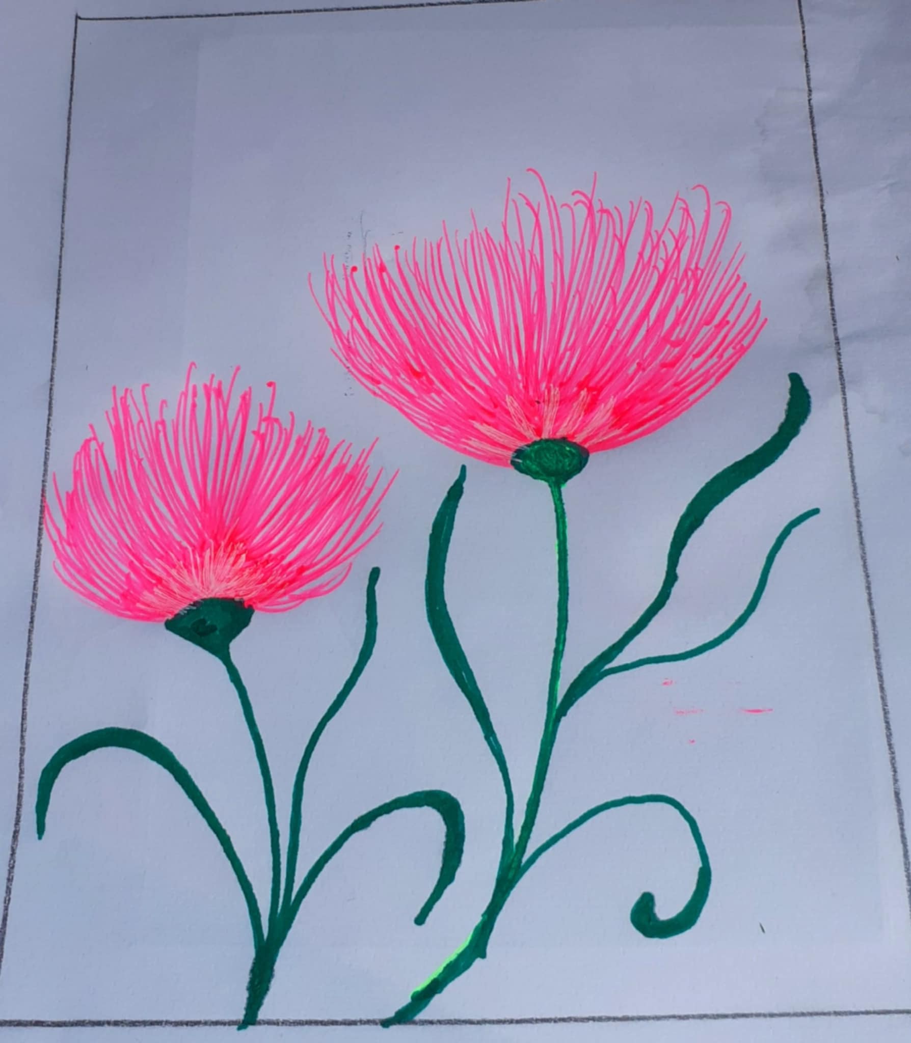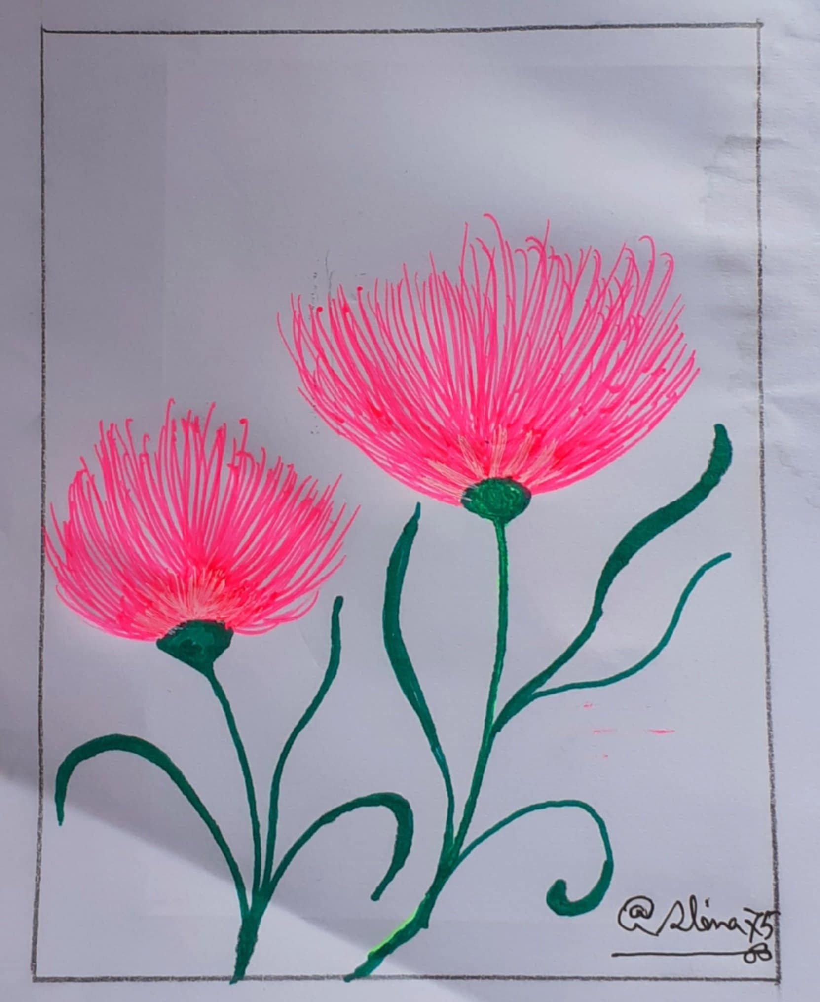 প্রথমে হাল্কা সবুজ রং দিয়ে ফুলের বৃন্তটি এঁকে নিয়েছিলাম। কিন্তু ভালো লাগছিলো না বিধায় সবুজ রং এর সাইন পেন দিয়ে ফুলের বৃন্ত,ডাল ও পাতা এঁকে নিয়েছি।