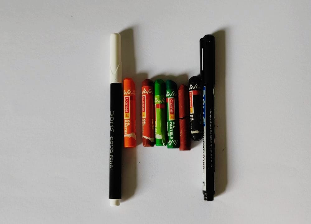 • প্রথমে একটি সাদা খাতা, কালো রংয়ের মার্কার পেন গেরুয়া রং, সাদা রং,সবুজ রং, নীল রং নিয়ে নিলাম।