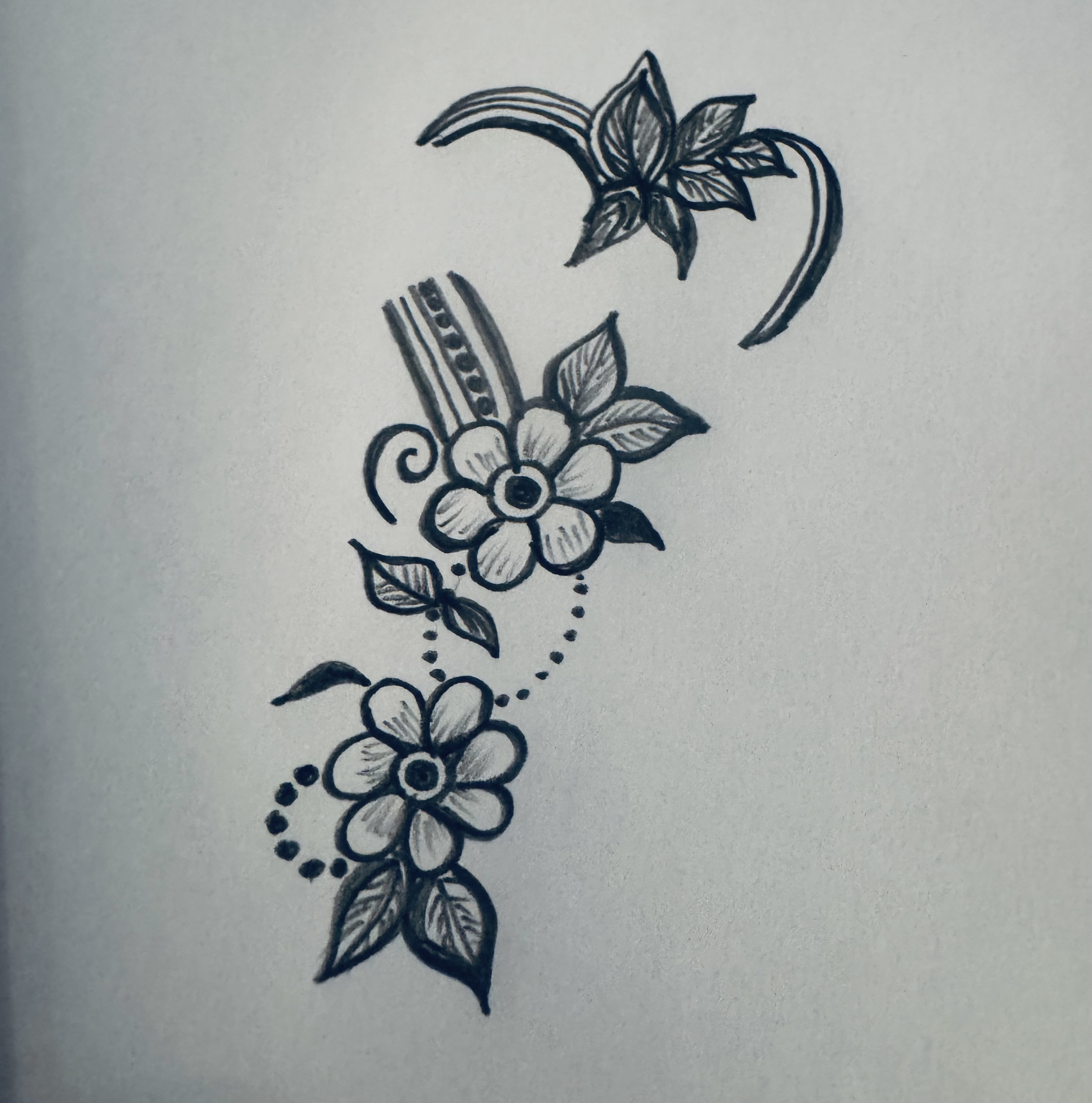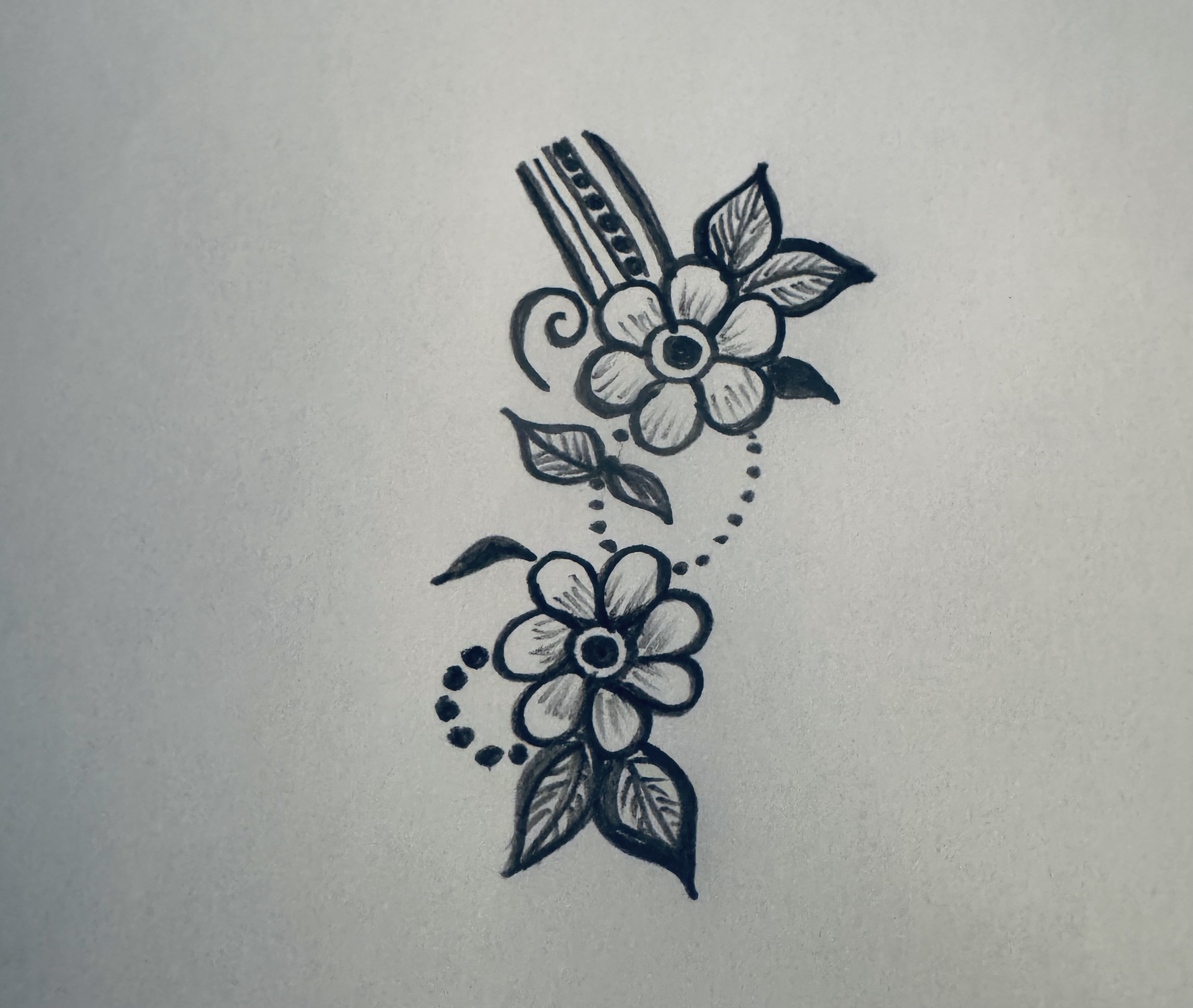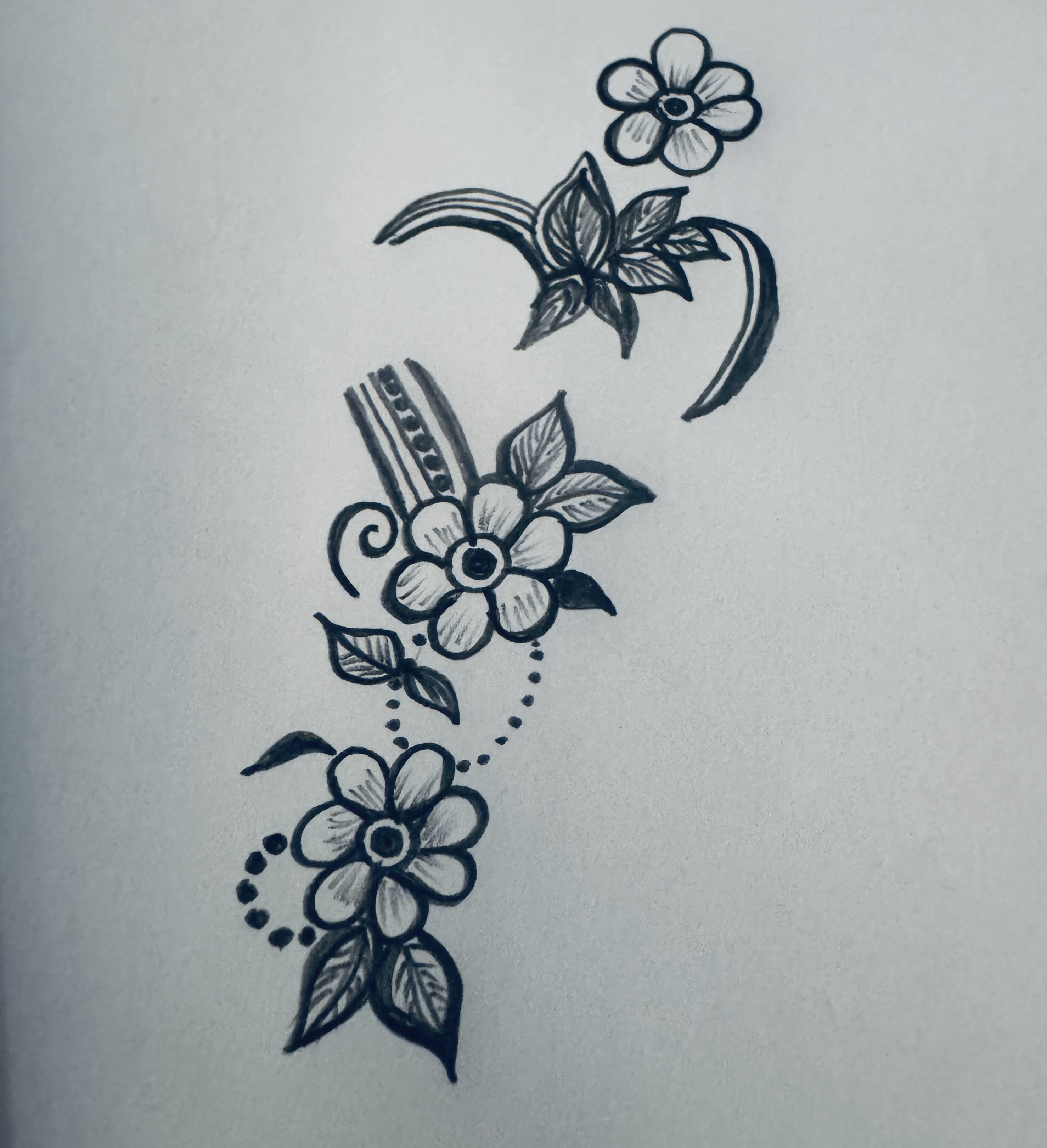 এরপর ফুলটির উপরের দিকে ঠিক একইভাবে একটি ফুল ও পাশে কতগুলো পাতা এঁকে একটু ডিজাইন করে নিয়েছি।