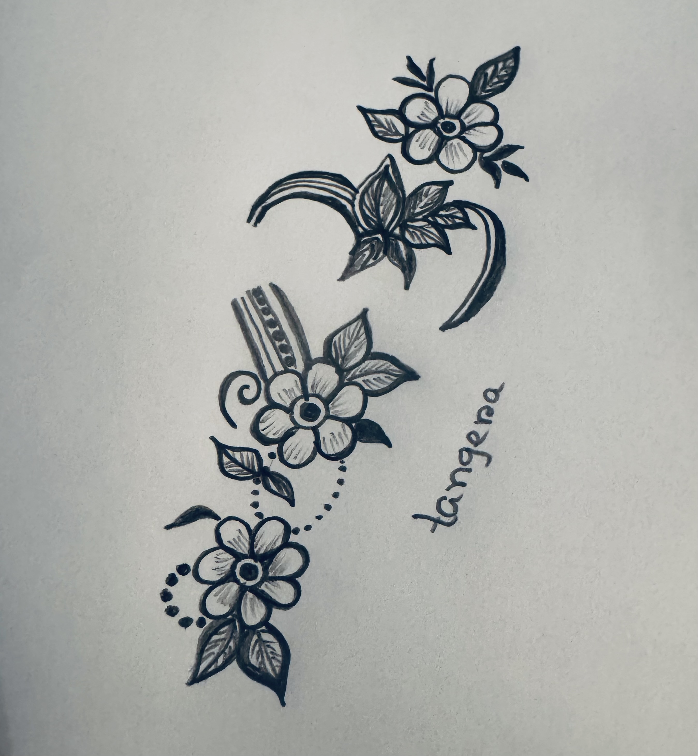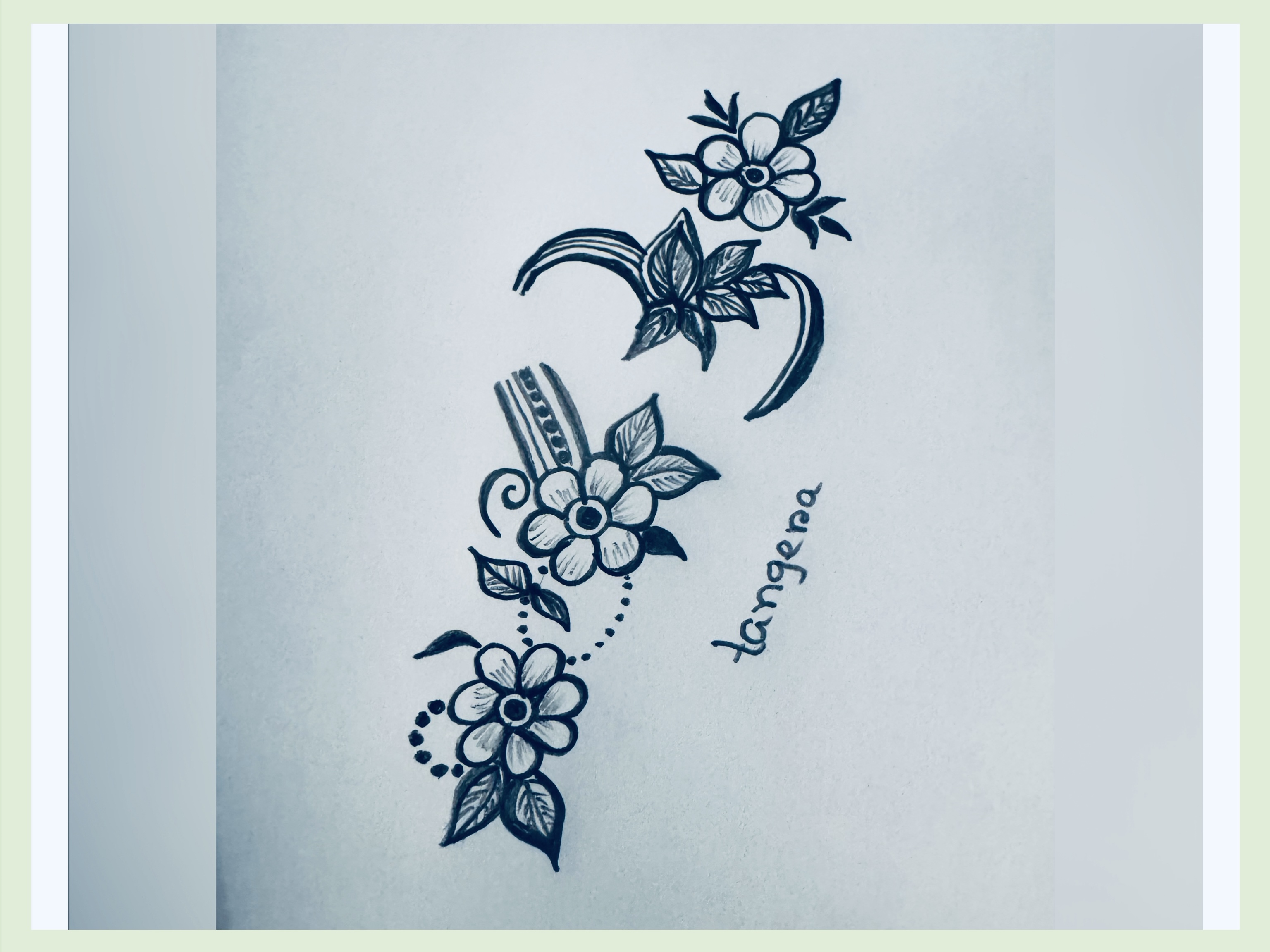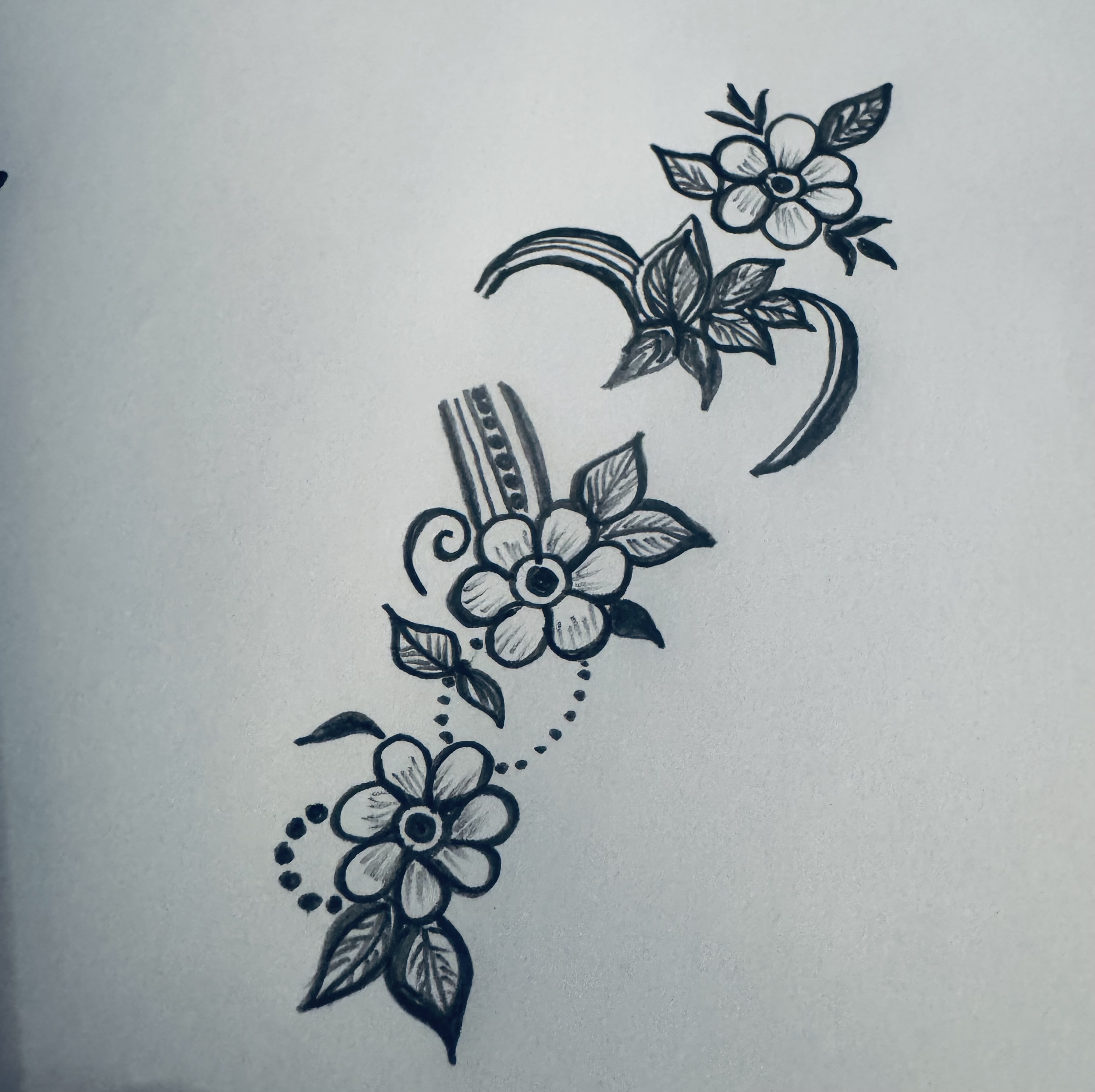এরপর ফুলটির উপরের দিকে ঠিক একইভাবে একটি ফুল ও পাশে কতগুলো পাতা এঁকে একটু ডিজাইন করে নিয়েছি।