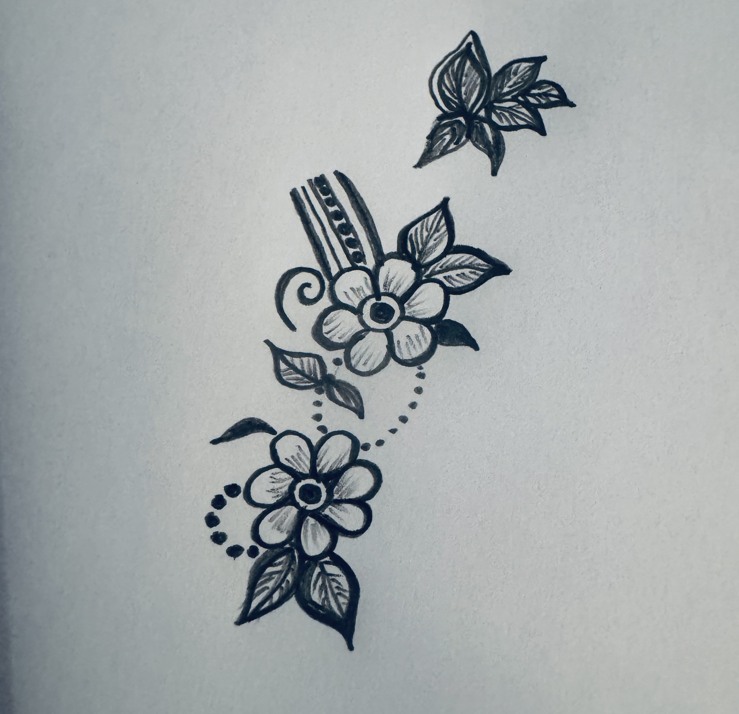 এরপর উপরের ফুলটির পাশে একটুখানি এভাবে ডিজাইন করে পাতা দুটির উপরে আরো কিছু পাতা এঁকে নিয়েছি।