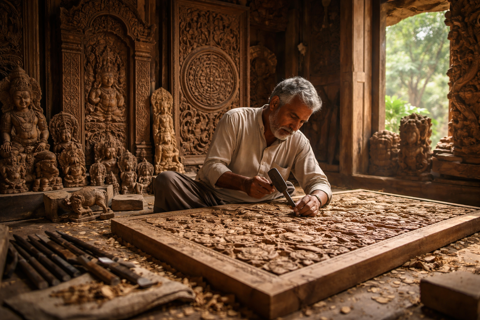 কাঠ হলো মানবসভ্যতার অন্যতম প্রাচীন ও সহজলভ্য উপাদান। এই সাধারণ উপাদানটিকেই শিল্পীর নিপুণ হাতে রূপ দেওয়া হয় বিভিন্ন শিল্পকর্মের মাধ্যমে। আর এটি কাঠখোদাই শিল্প নামে পরিচিত। হাজার বছরের ইতিহাস বহনকারী এই শিল্প শুধু অলংকার নয়, বরং মানুষের সংস্কৃতি, বিশ্বাস, জীবনযাপন এবং নান্দনিকতার জীবন্ত উদাহরণ। প্রাচীন সময়ের থেকে মানুষ যখন ধাতু বা পাথরের জটিল ব্যবহার শিখেনি, তখন থেকেই কাঠ ছিল তাদের প্রধান নির্মাণসামগ্রী। অর্থাৎ ঘরবাড়ি, আসবাবপত্র ইত্যাদি সবকিছুতেই কাঠের ব্যবহার ছিল অপরিহার্য। সময়ের সাথে সাথে মানুষ শুধু ব্যবহারিক প্রয়োজনে নয়, সৌন্দর্য সৃষ্টির জন্যও কাঠে নকশা খোদাই করতে শুরু করে দিয়েছিলো।