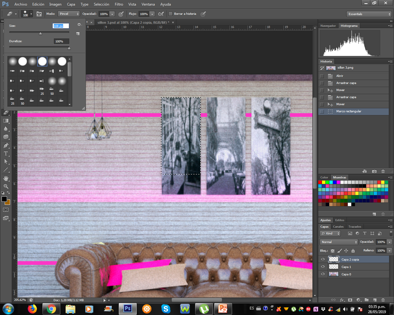 -El primer paso fue colocarle unas lineas rosas que me ayuden a enmarcan y enfatizar todo lo que colocare a la imagen, sin embargo, me parece muy acertado cuando juegas con esas lineas 2D en tu modelo 3D, como si estas pasaran detras de objetos que aparecen en la imagen, simplemente borrandolas donde estos objetos estan, recuerda ser muy preciso en esta parte.