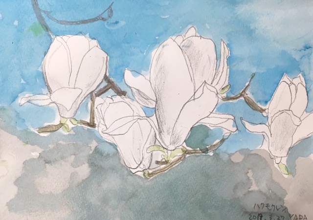ハクモクレンはその白いふんわりした花の姿が好きです。ちょうどほぼ満開という感じでその綿菓子のような姿を堪能しながら描きました。白い花なので紙の白を活かして、またバックに空の色と木々の色を塗って花が浮かんでいるような感じを表現しました。