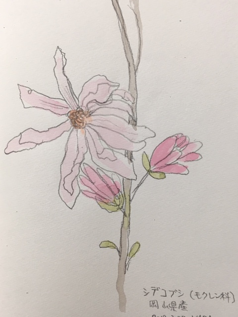 ツバキを3種類も描いたので今日は終わろうと思っていたときに見つけたのがこのシデコブシという花です。コブシと違って花弁が多く、菊のような咲き方に見えました。環境省レッドリストでは準絶滅危惧(NT)種だそうです。