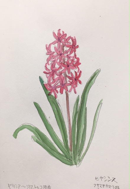 前回はクロッカスを描いた、色々な春の植物(主に球根で育てる植物)が植えられているゾーンで、赤や白、紫、ピンクのヒヤシンスが満開でした。ヒヤシンスはそういえばよく見かける花のわりに描いたことがないので描きました。赤のヒヤシンスを描きました。