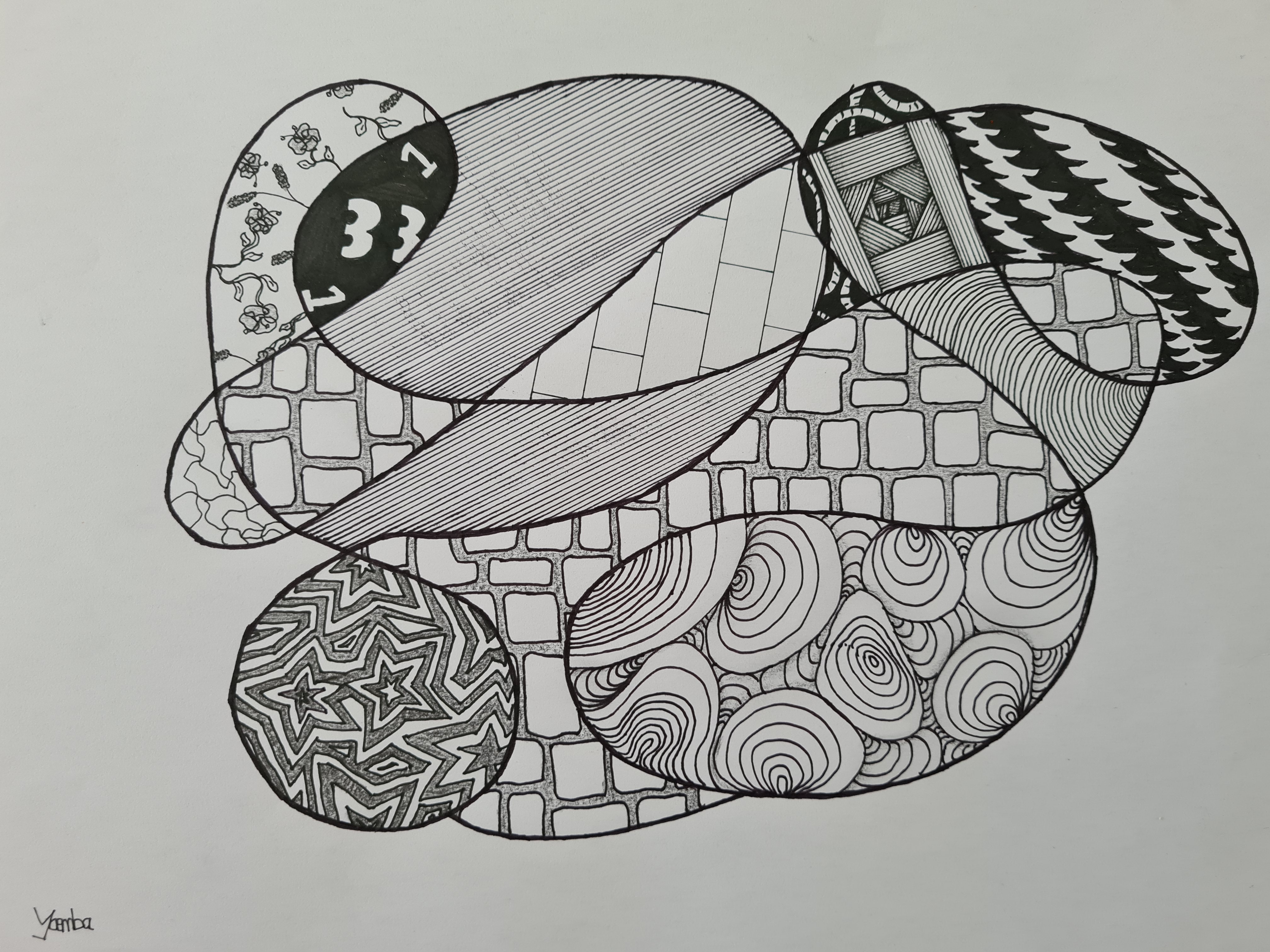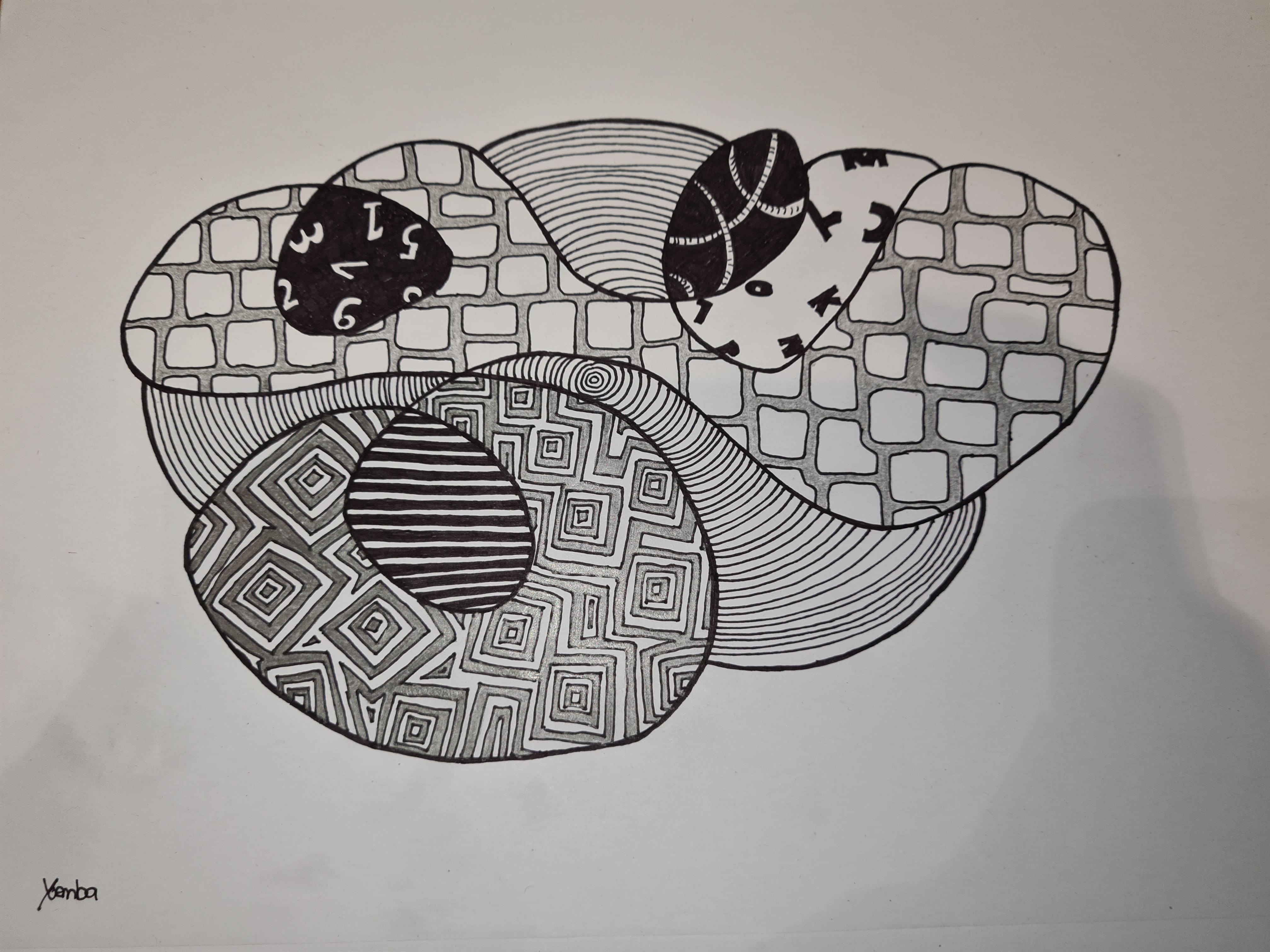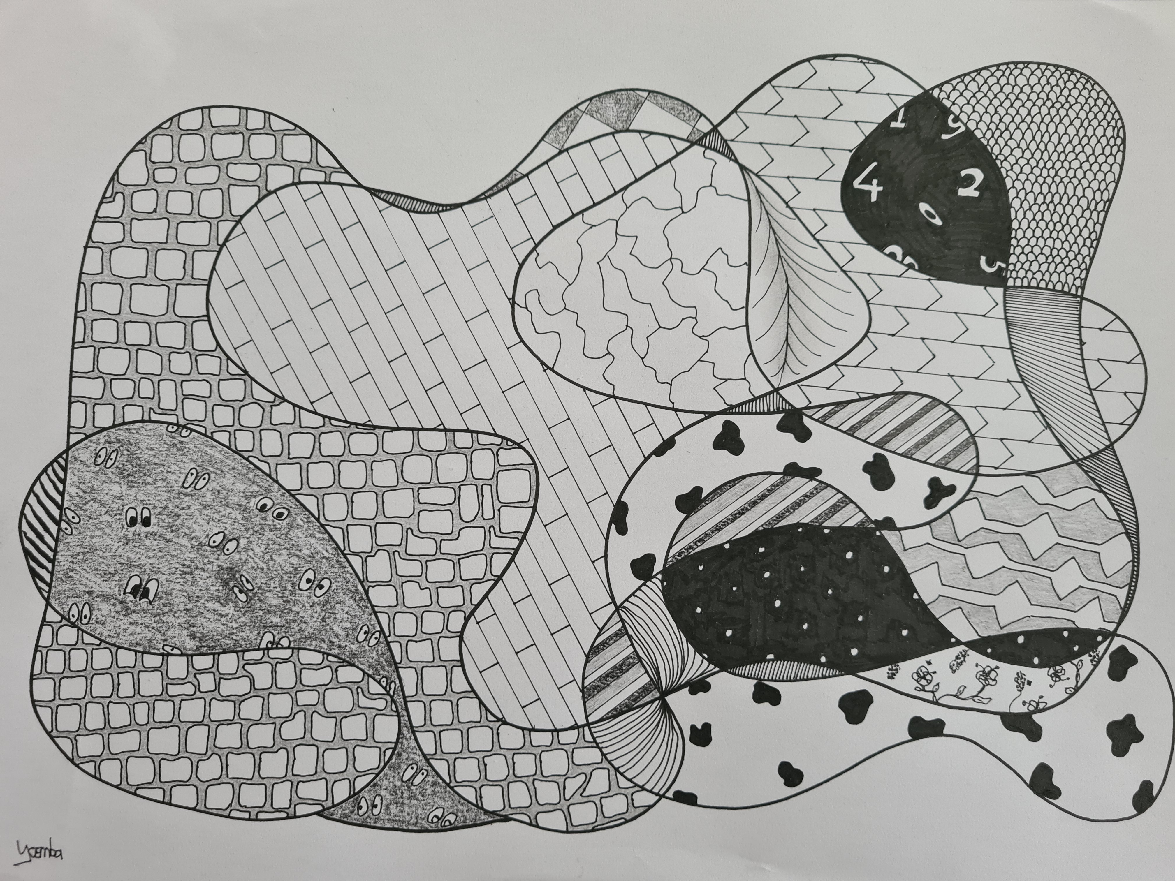 Randomnessyoemba (29)in #art • 4 years ago My serie of 4 random created forms, filled with random patterns and shapes. There are some returning patterns on each of the 4 drawings, to create unity in the serie. #fyp #random #pencil #drawing #shapes #pattern