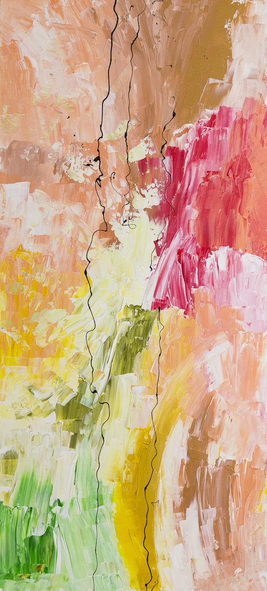 This painting was intended as a gift for a girl I liked, but I ultimately couldn't give it to her. It's not the first time I've painted pictures as gifts for girls, but I consider giving them a very powerful and profound act. In fact, the act of creating them itself is significant. I tried to capture all the sensitivity I could in an abstract painting. I used pastel tones because of the softness they convey. The curved lines in the center of the painting can reveal the profiles of faces, depending on how you look at them—specifically, two faces. I don't have the painting on hand to measure the size, but it's approximately 40 or 60 cm wide by 90 cm long. I hope you like it.