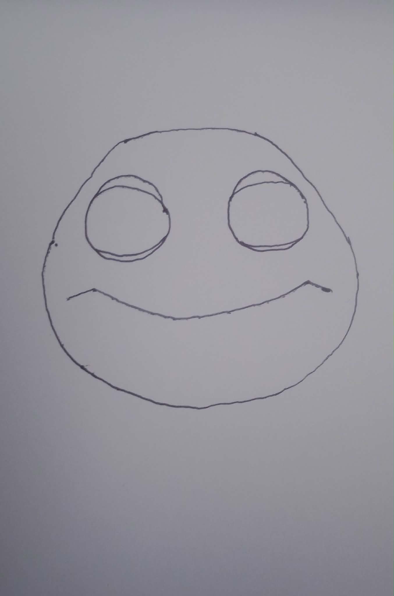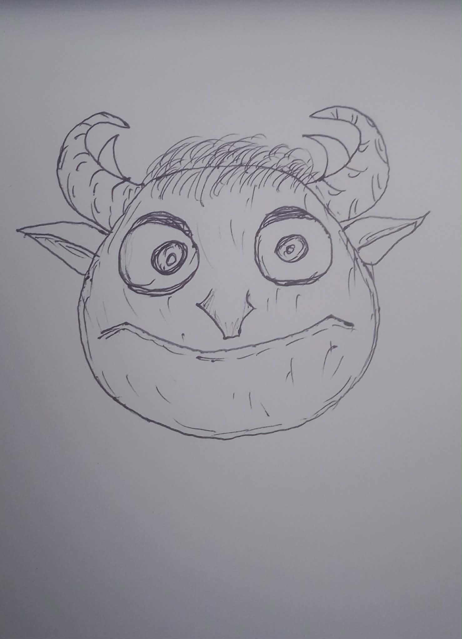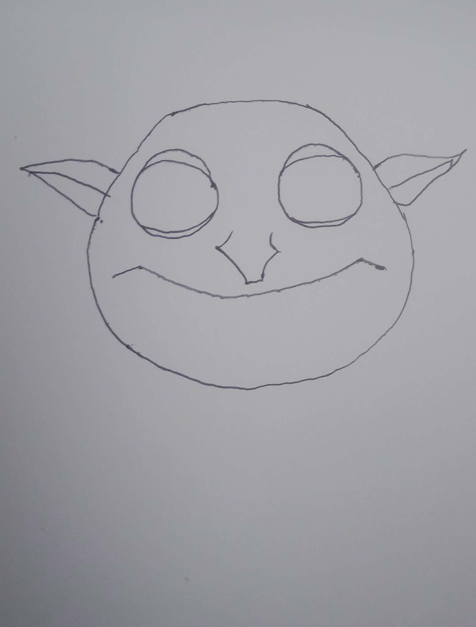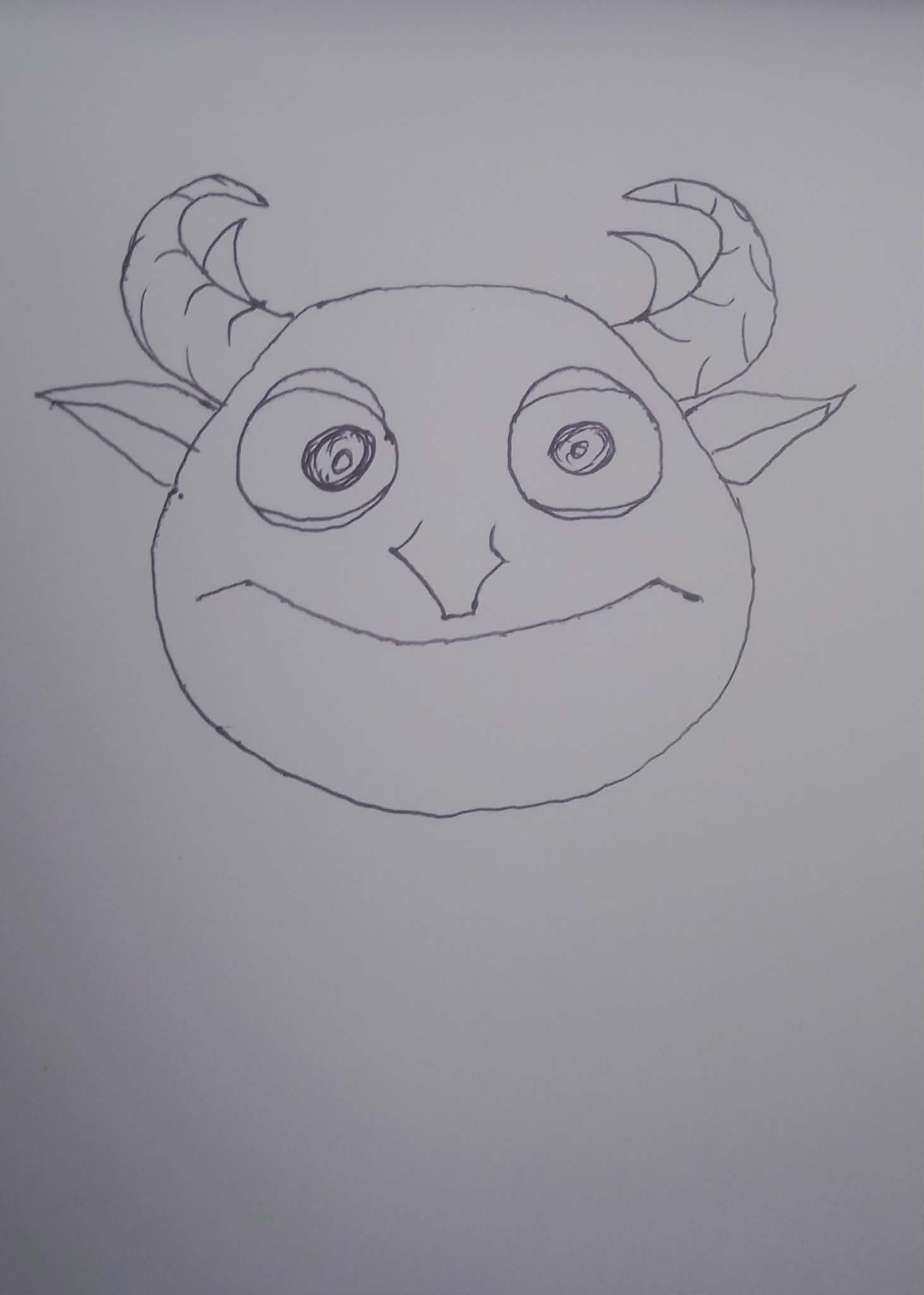 I will draw two ears and a nose on either side of the character, two large horns above the ears, and a small horn.