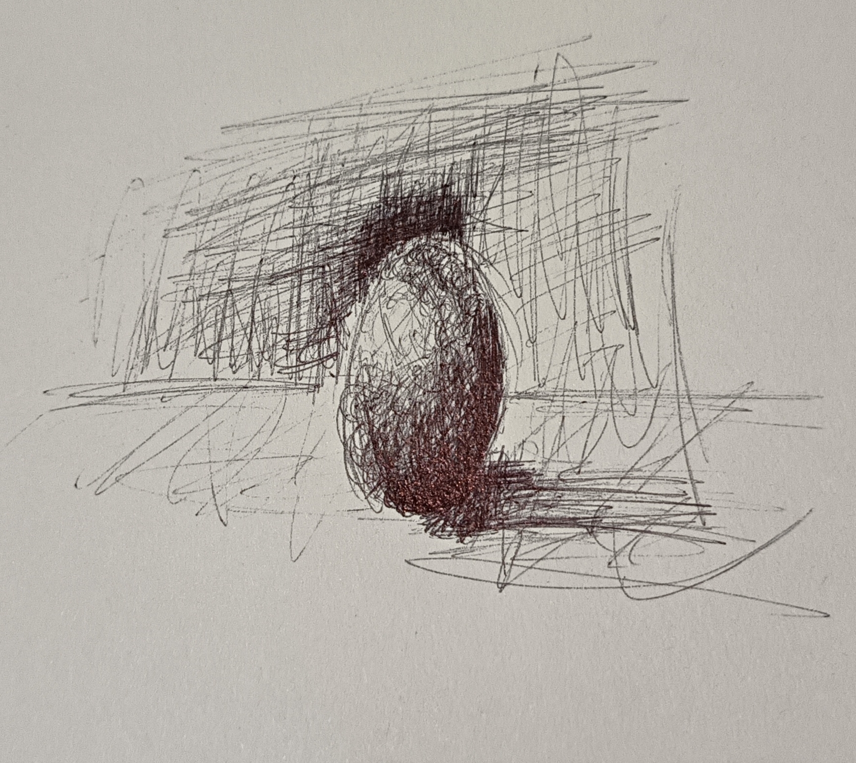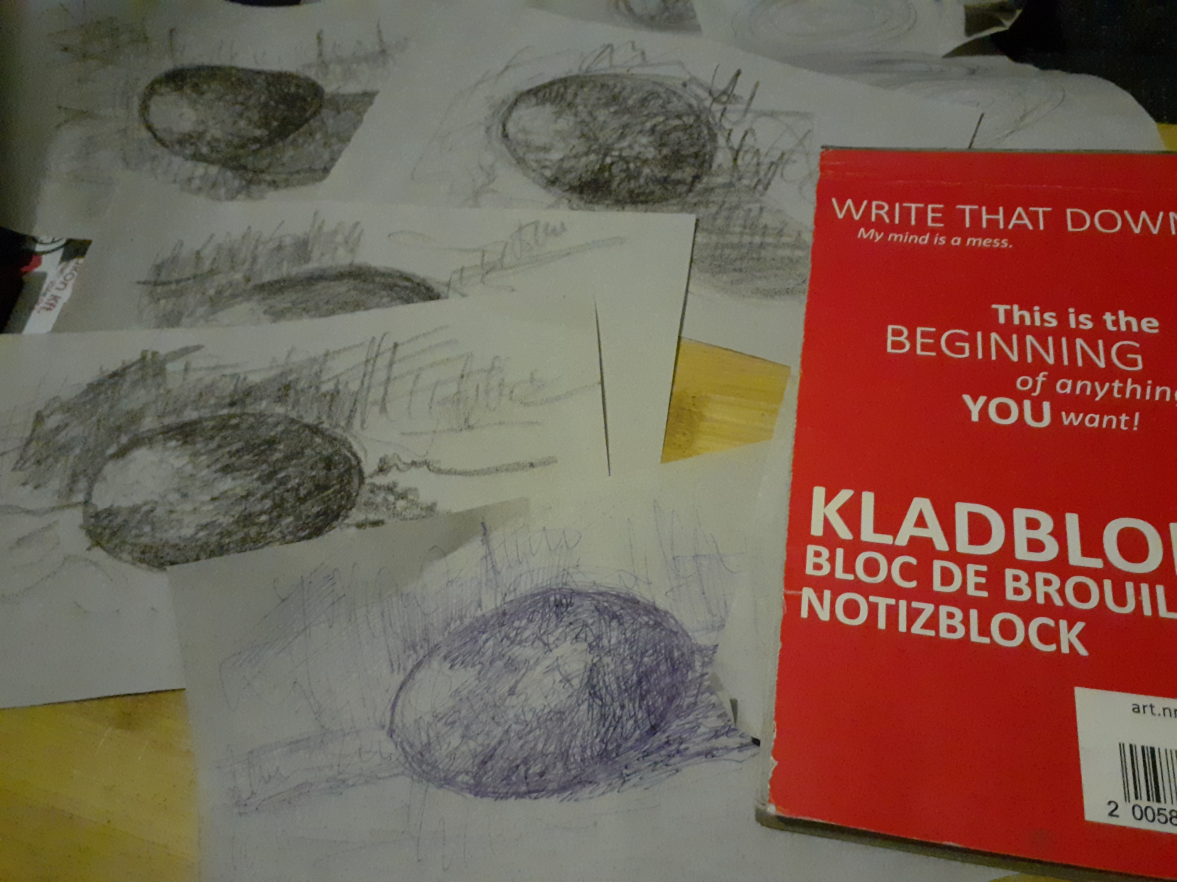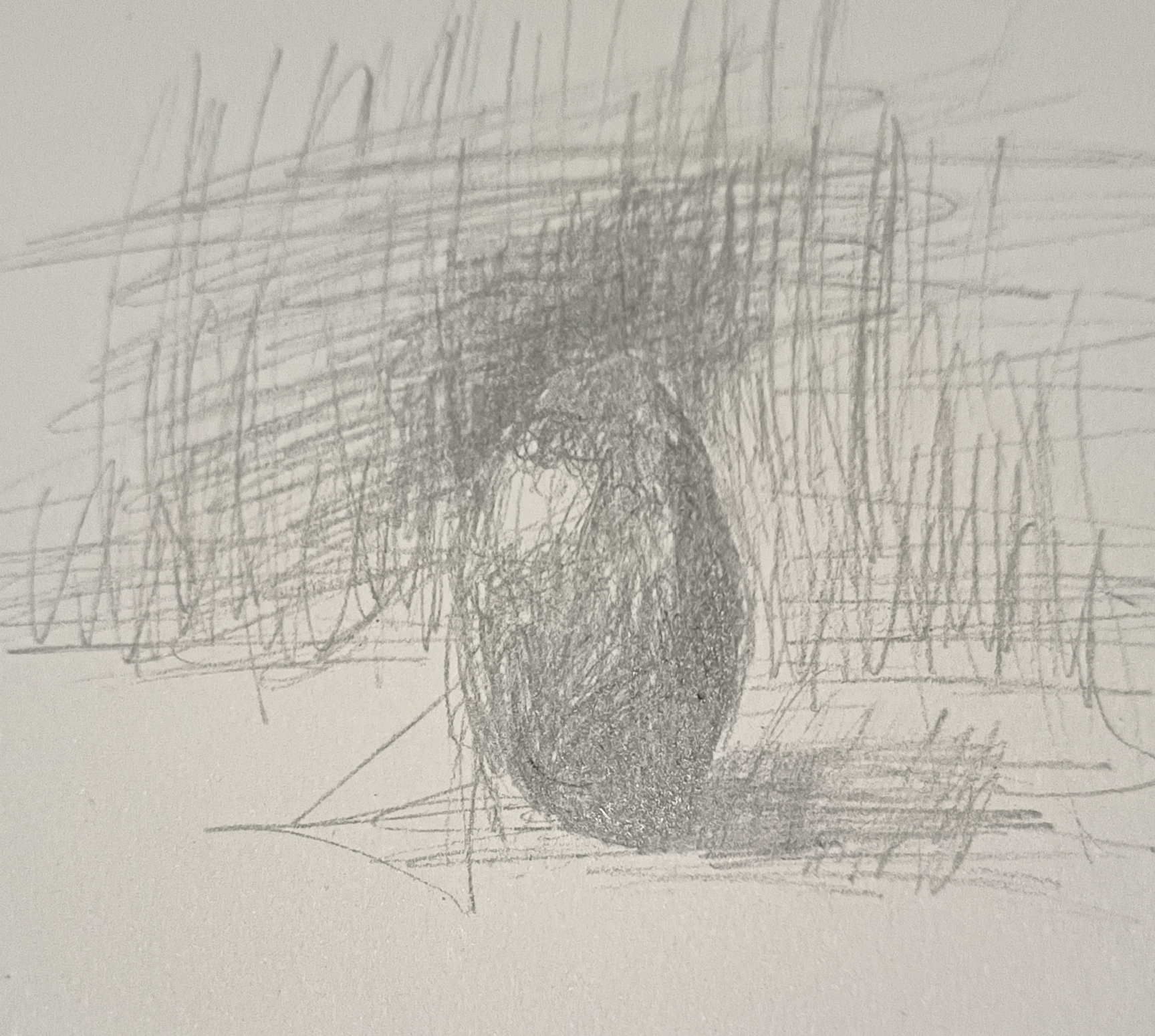 Create an Oval shape with scribble lines. Show us your spotlight, middle tone areas, darkest part, and the shadow cast.