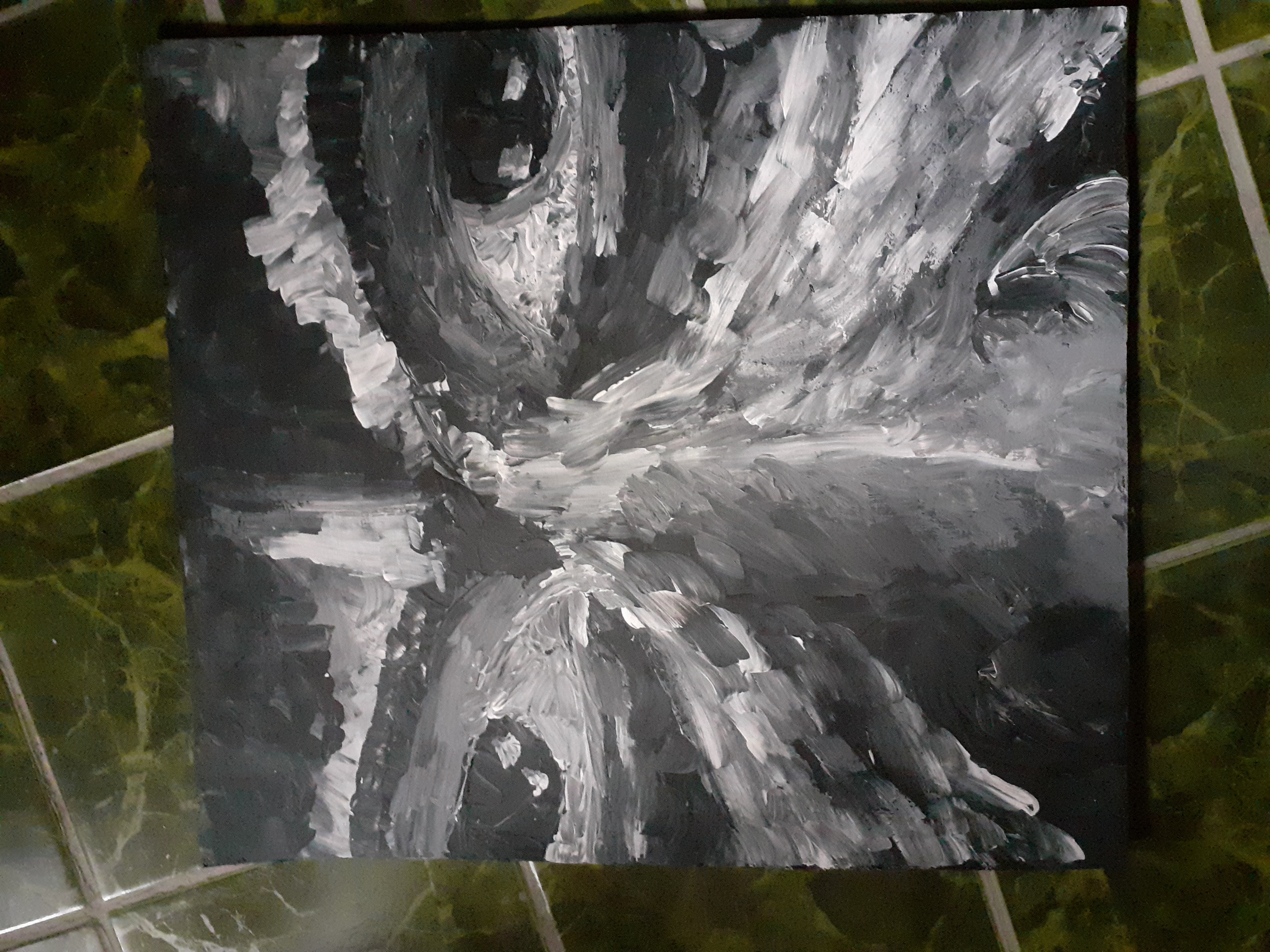 There are artists whose work I really enjoy looking at. For instance, there’s one who applies black and white paint to a canvas or panel and brings an image to the fore by blending just those two. It’s fascinating to watch, so I thought: I’ll paint one of the remaining chipboard shelves black, then apply black and white paint to it and see what I can bring out. I have to say it’s not exactly easy, and yes, I do know what went wrong here, so I’m keeping it as a reminder of what went wrong. I also noticed that the longer I spent mixing this paint and creating an image from it, the more I drifted towards a style of painting that I didn’t actually want. It turned out exactly like that.