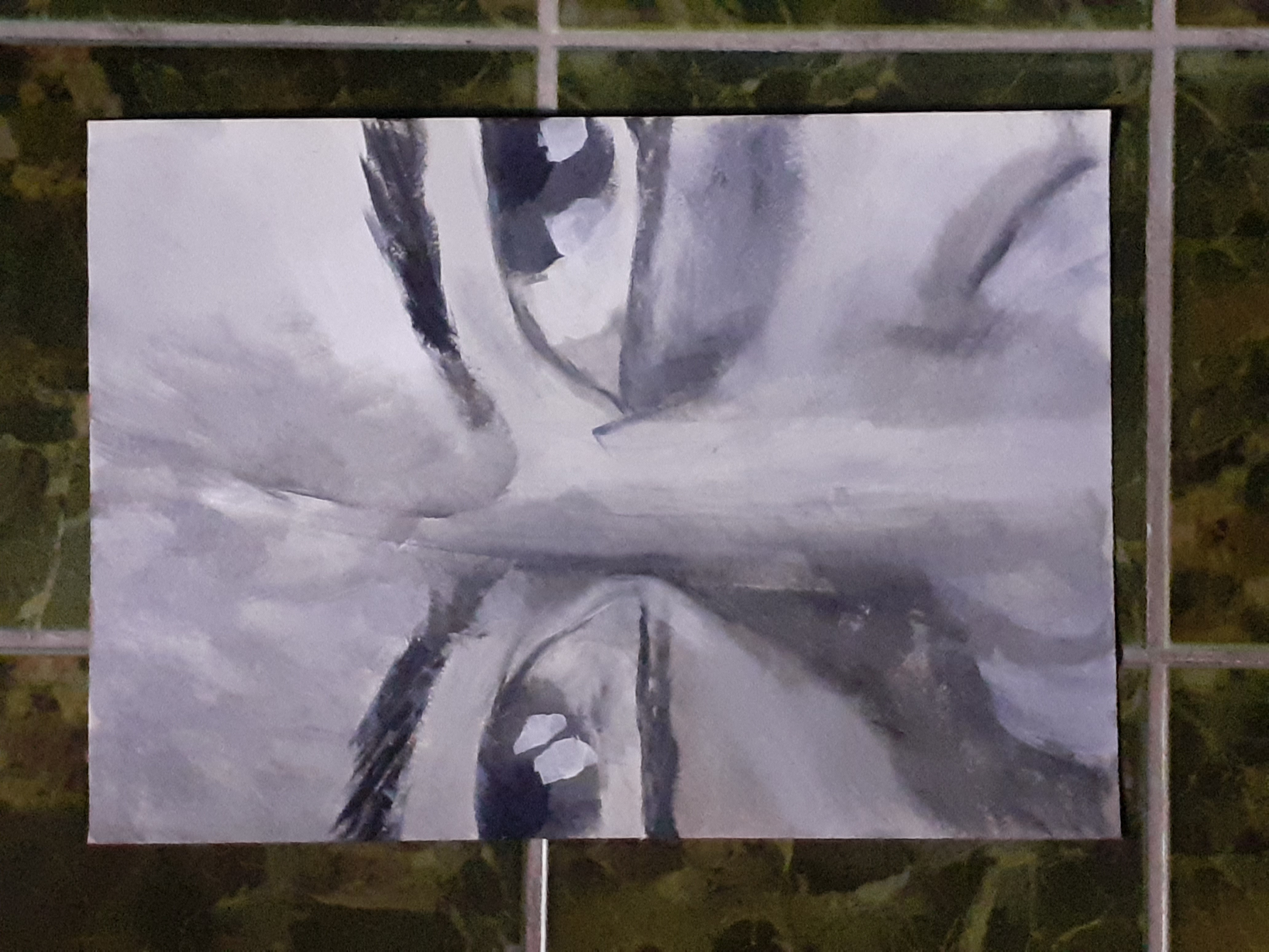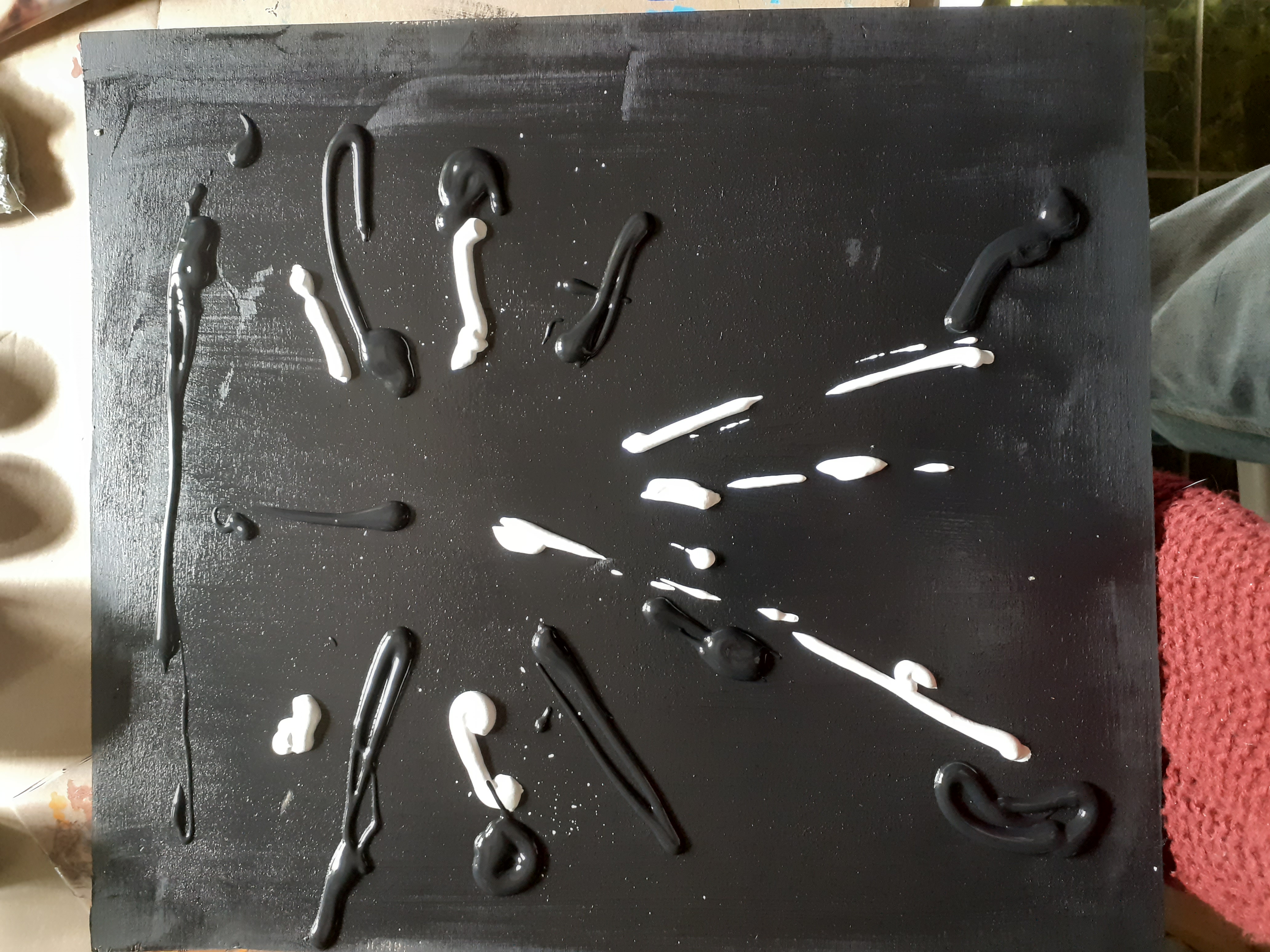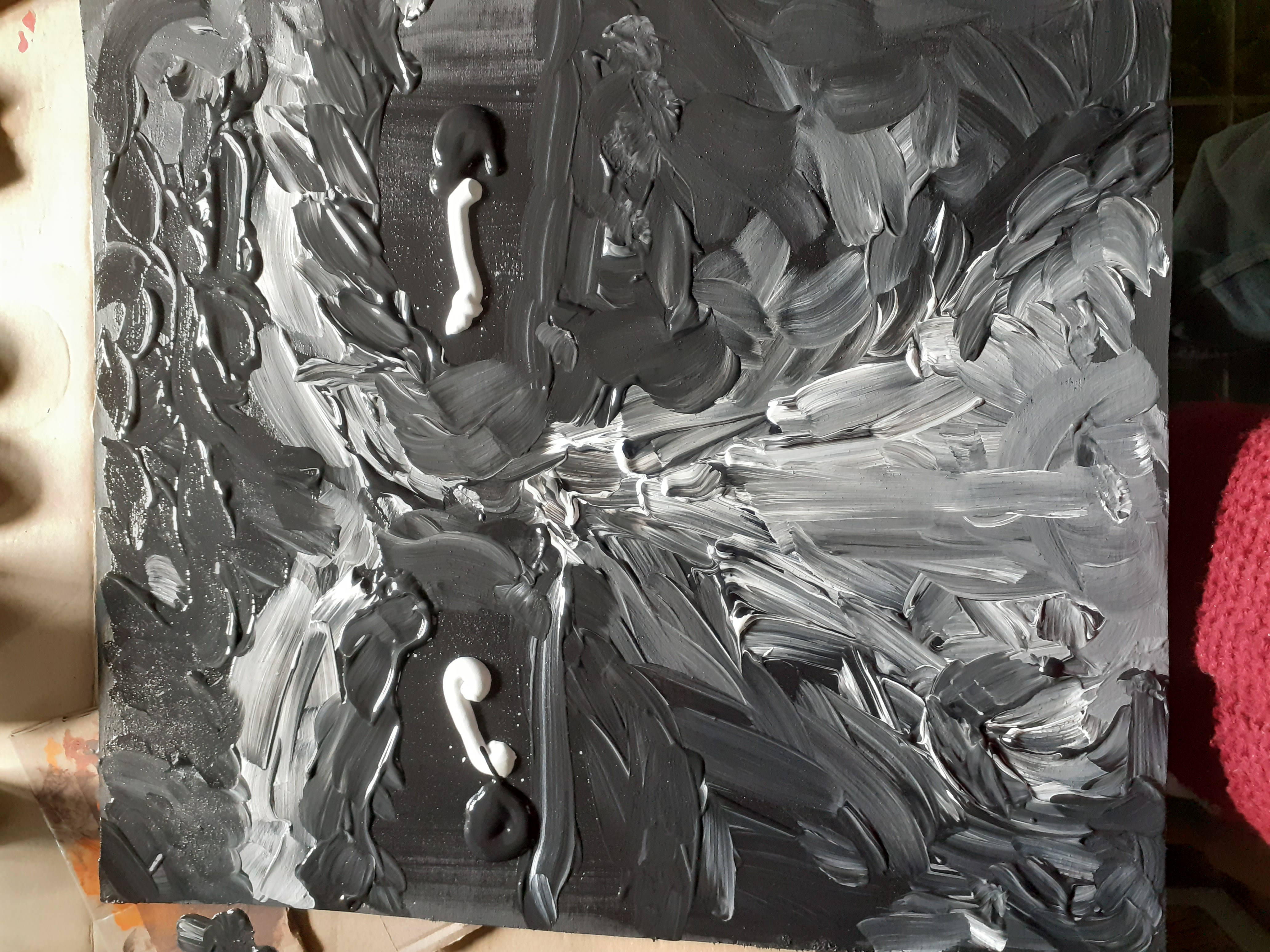 I still need to practise a bit more to turn those blobs of white and black – or perhaps other colours – into something better, but I do enjoy doing this and it’s relaxing. And who knows, if you clear your mind completely for a moment, something completely different might emerge; that’s fine too. It just uses a lot of paint, but what surprises me is how quickly it dries, especially compared to painting, where I use hardly any less paint.