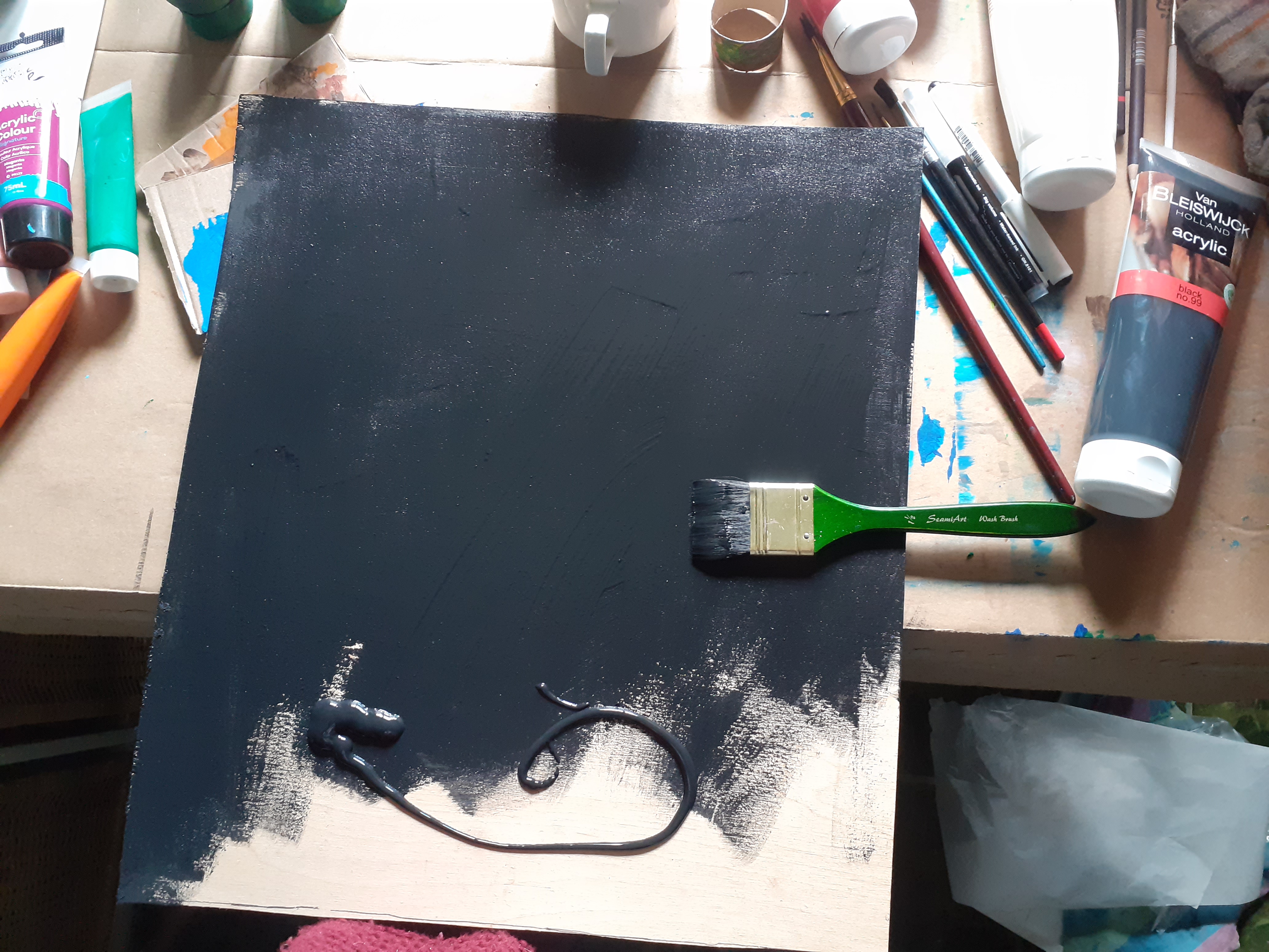 Materials: chipboard, acrylic paint: black + titanium white (Action), flat brushes: 3 cm + Van Eijck #18, bamboo paper