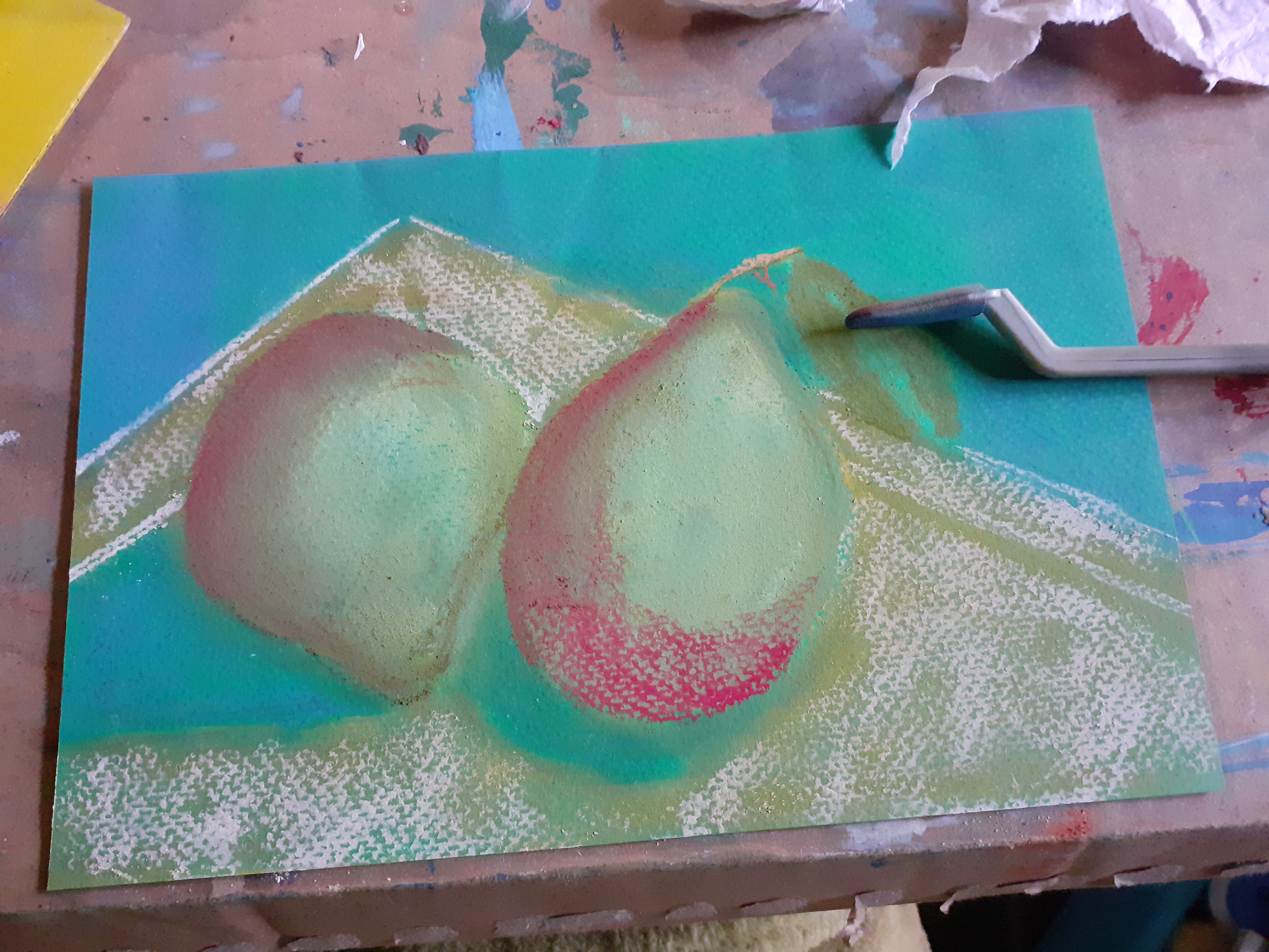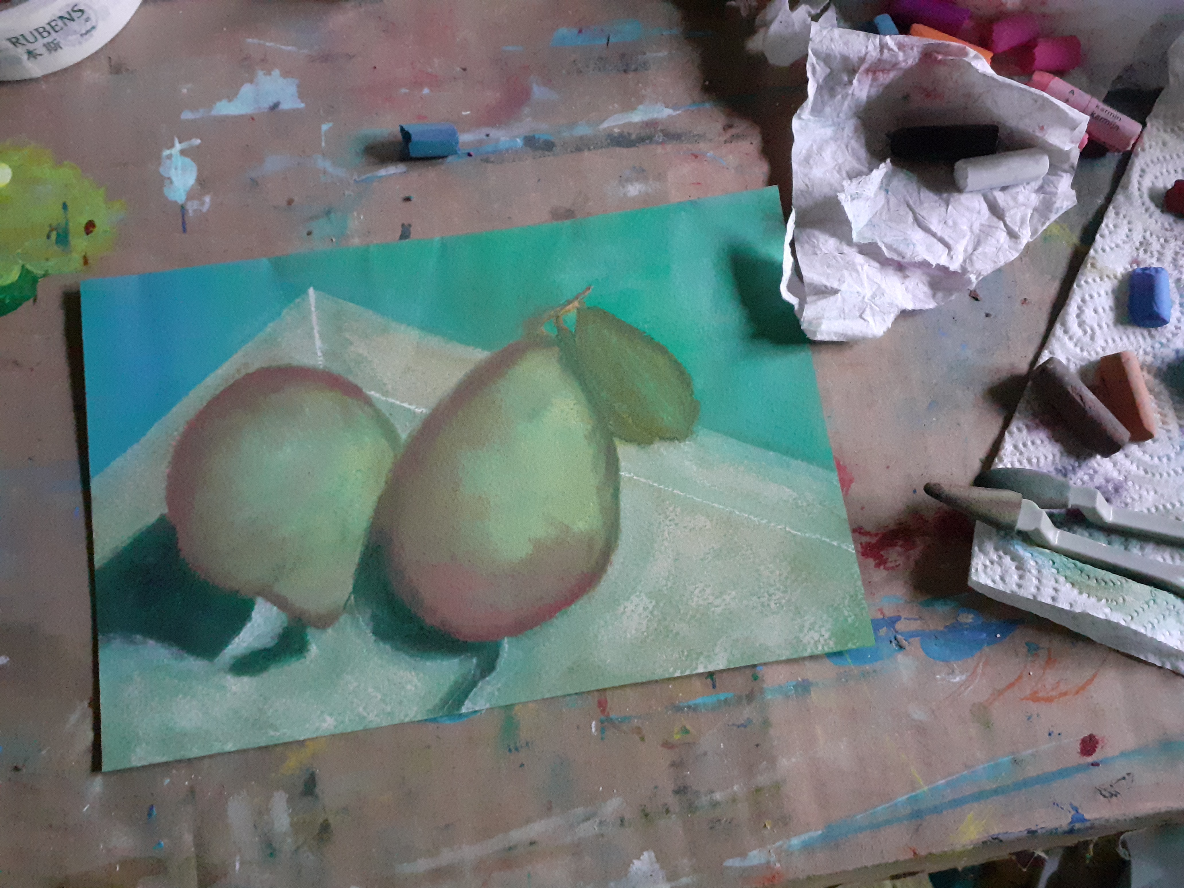 Yesterday I tried my hand at a still life, two pears, also on that green paper. If you look closely, you can see that the paper is still visible even after at least four layers, and don’t even ask how much chalk I had to knock off. I’m going to see if I can manage with much less chalk, as this feels a bit like a waste. Perhaps this paper is best suited to those who work exclusively with pastel pencils.