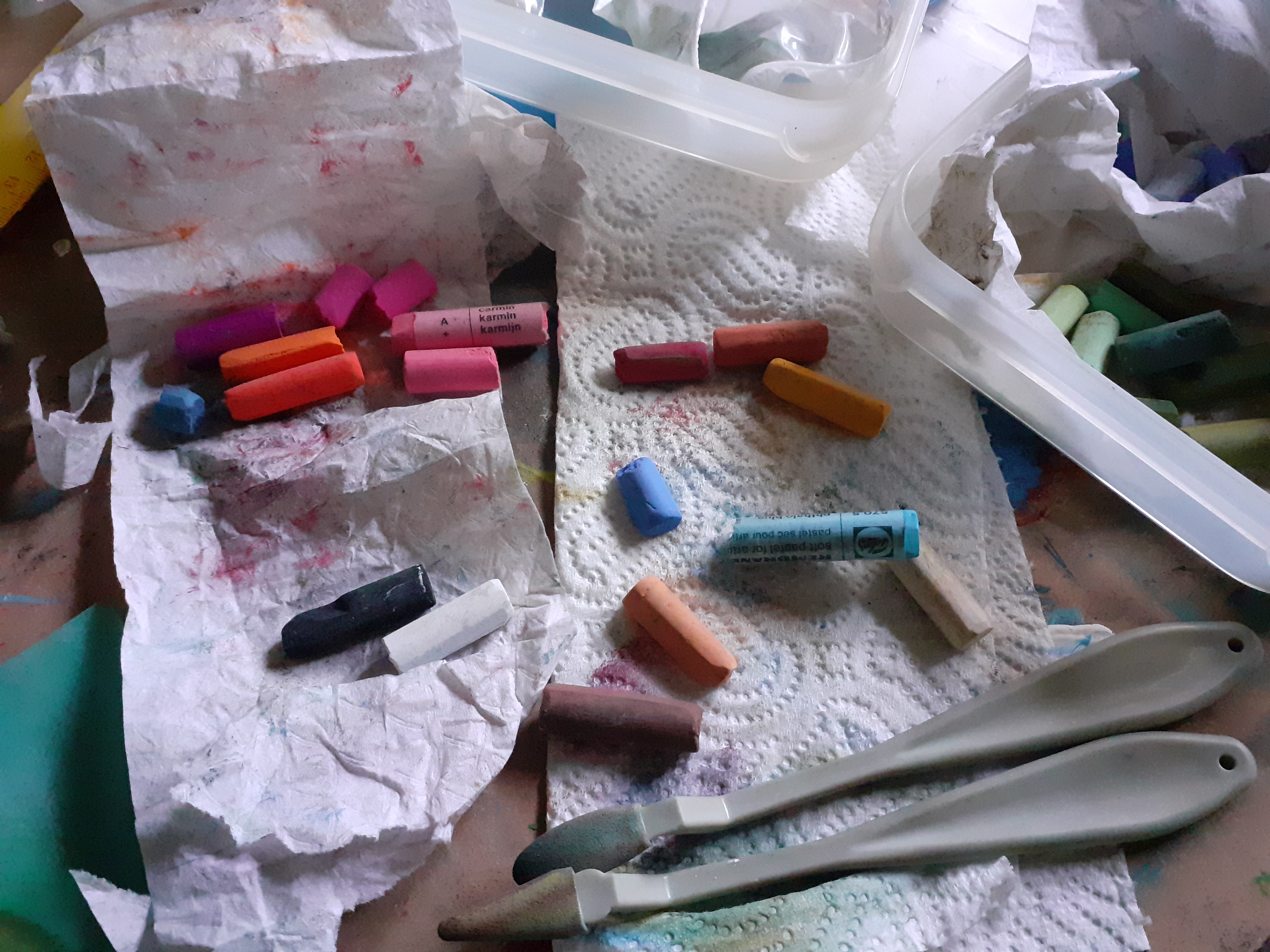 As I travel a lot, I’ve split the Rembrandt pastel chalk in two. I keep it here in a small meat plastic box. The gloves and a few other essentials fit in here nicely too.