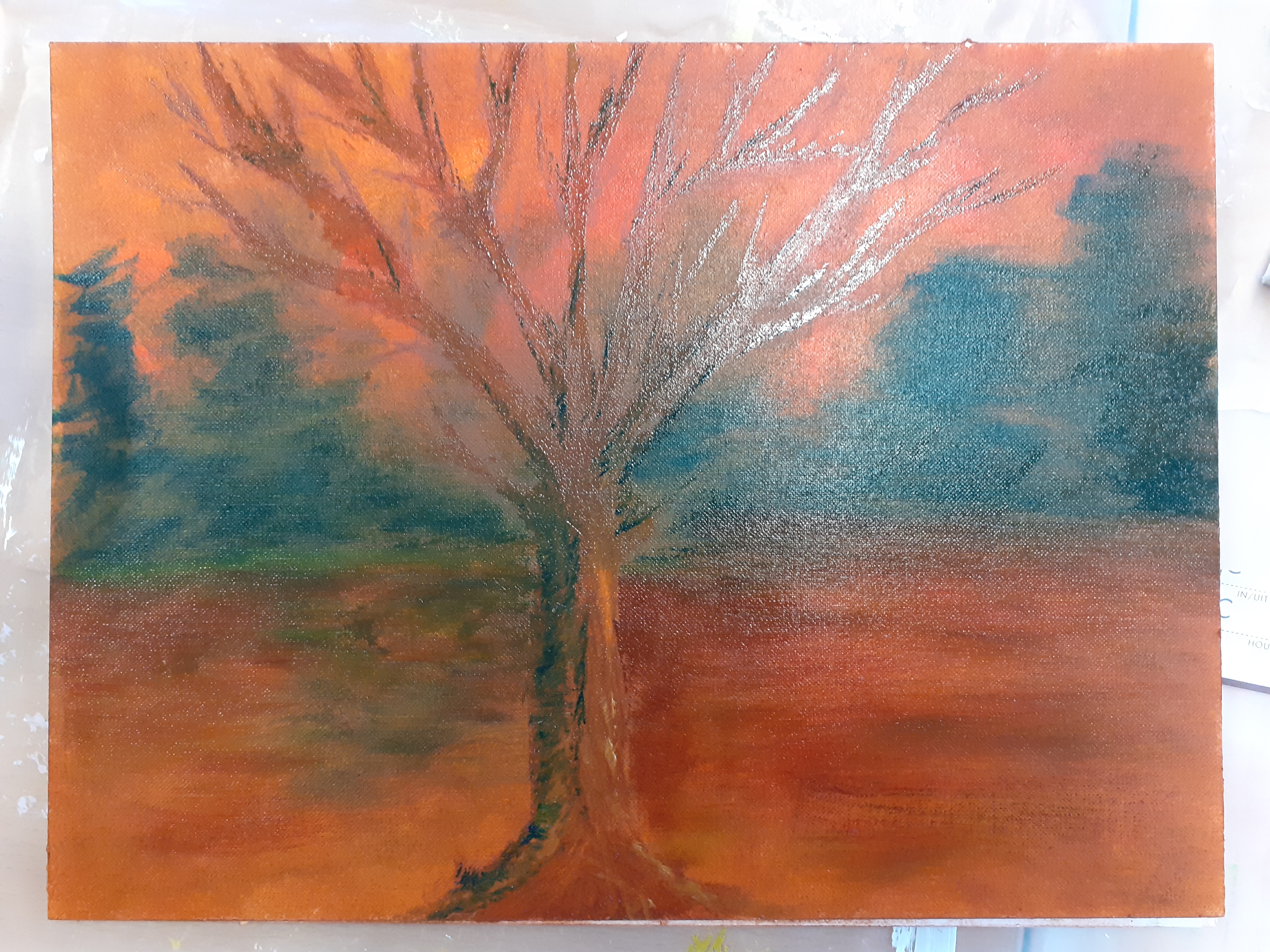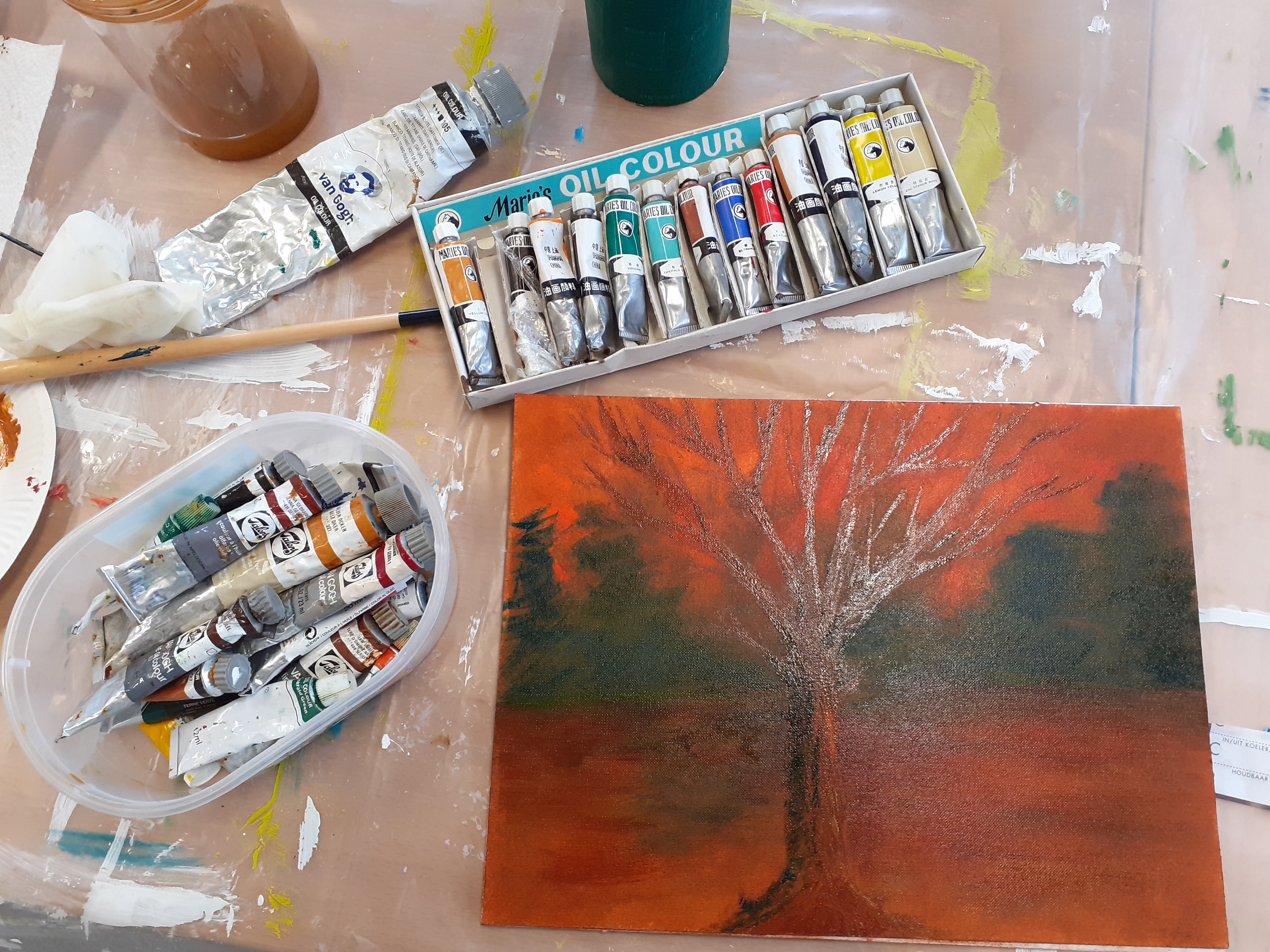 I decided for a tree. This time I noticed there was more oil paint and I decided to use this one. Same story most were hard to open so my colours were limited.