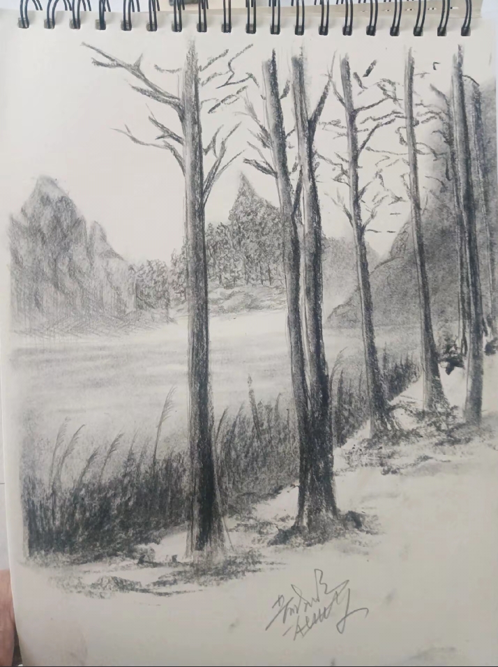 我喜欢铅笔画,但我不擅长素描,所以画画时就随心所欲。我没有太多颜料,就用了现有的三种。我在纸上点上小点油画颜料,然后随意涂抹开来。其实和用丙烯颜料画画差不多。这周我琢磨着还该加点什么,于是就画了那棵树。可惜课程时间不长,时间有限,在颜色方面也没有太多选择。我觉得你的画作非常棒。我认为用铅笔表现不同的色彩层次要困难得多。谢谢你让我看到这幅画