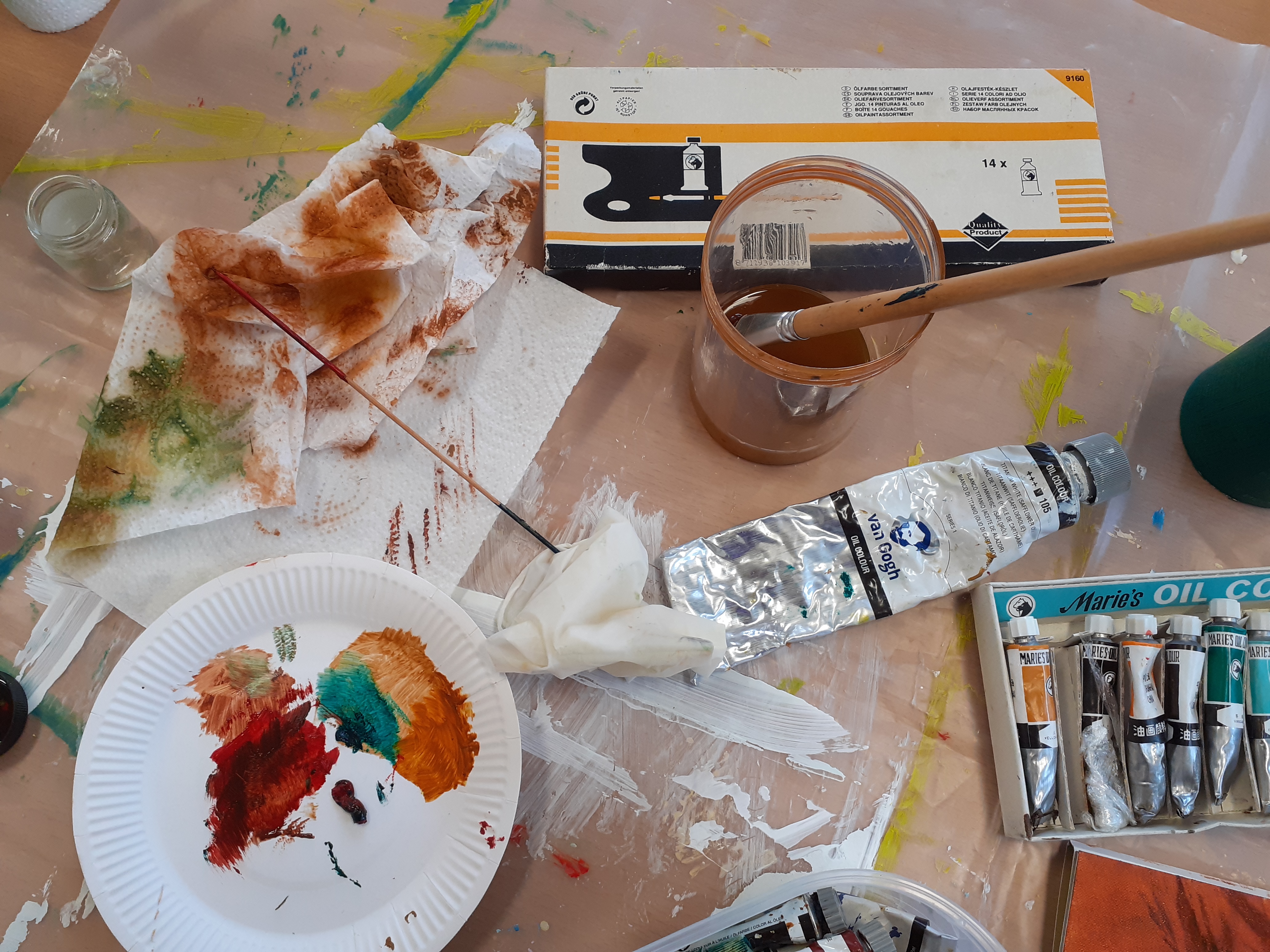 Material: very old tubes of oilpaint (4 colours), 1 brush Van Bleiswijck flat 11 oil to save the brush in and clean my hand, 1 sheet oil paint canvas paper ( no idea what type of).