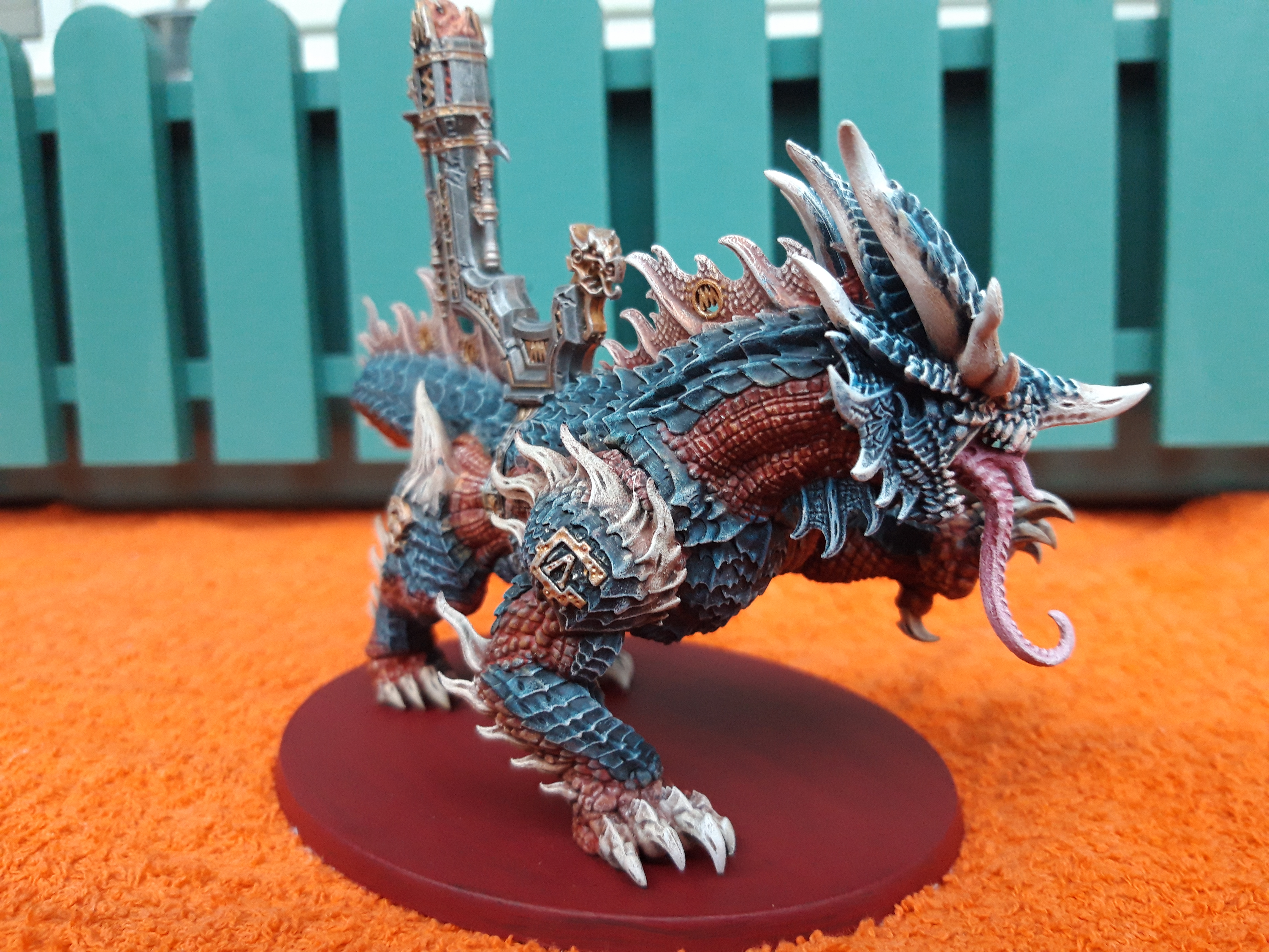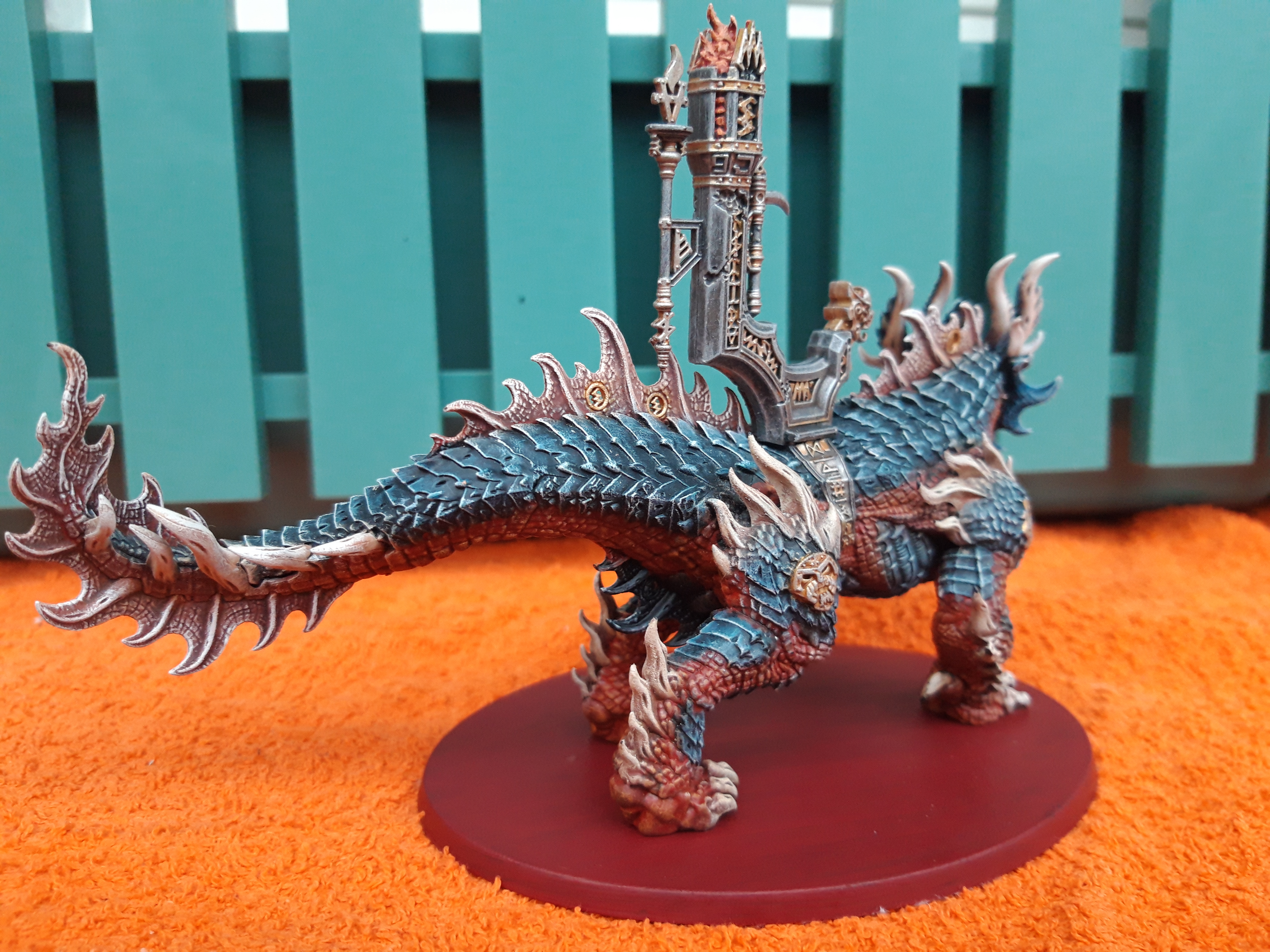 Ich habe beschlossen seine Schuppen in einem dunklen blauen Farbton zu belassen um ihn von der Vulkite Berzerker Einheit abzuheben, welche schon in einem knallig orangenem Farbschema bemalt sind. Sein Bauch ist jedoch orange und der Thron in dem selben rostig silber goldenem Ton belassen um die Zusammengehörigkeit zum Rest der Armee darzustellen