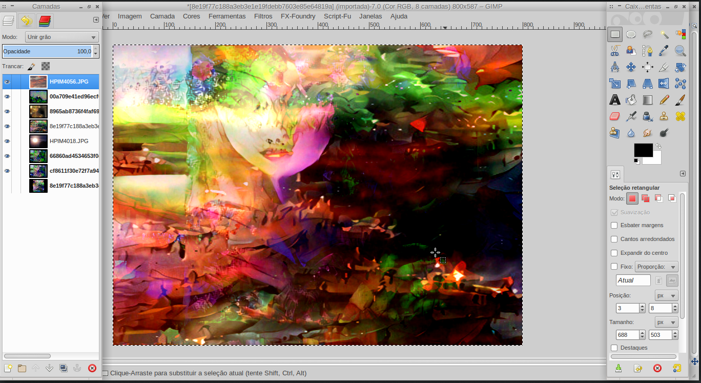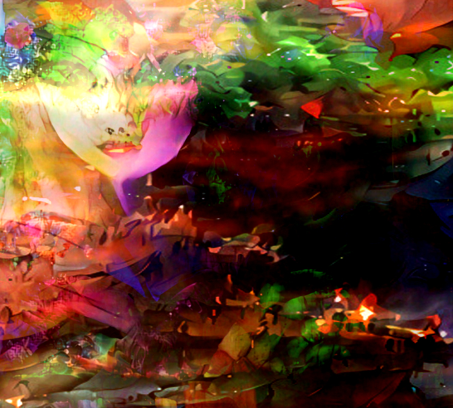 This started as an acrylic on canvas with some embroidery and vinyl collage I began painting last summer and have yet to finish. I took some photos of it and got to work with it on Gimp. Today I mixed it with some sky photos I took and previously sprinkled with DeepDream Generator and here it is one of the many possibilities I've experimented with.