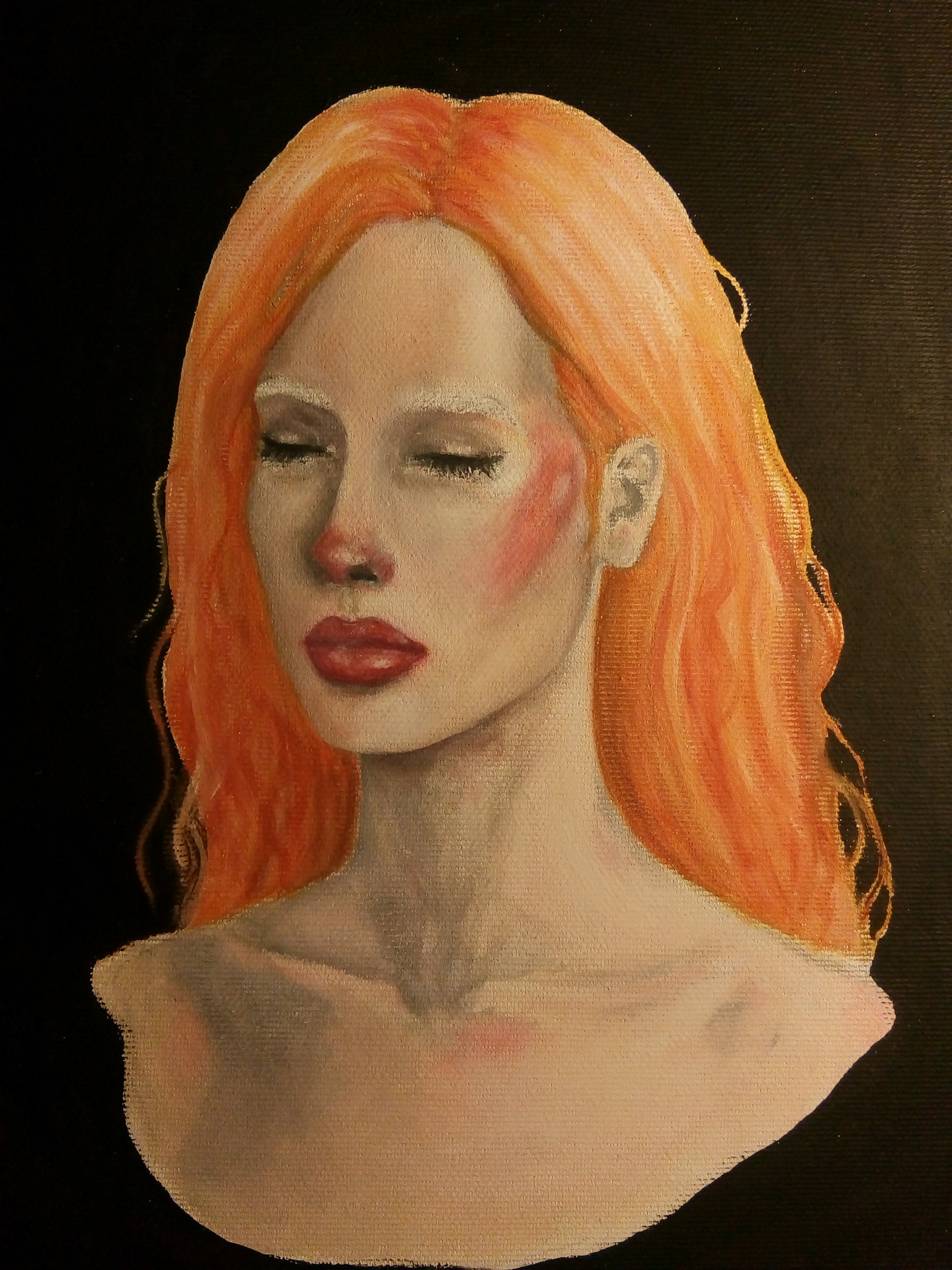 I used acrylic paints and size of canvas is 35x35. The concept is similar to the previous painting ("Luna"). However, I've changed a lot of facial features in this painting. Unfortunately, I did not record the process of formation completely because I was in a hurry. I have only these two photographs that represent the process of creation.