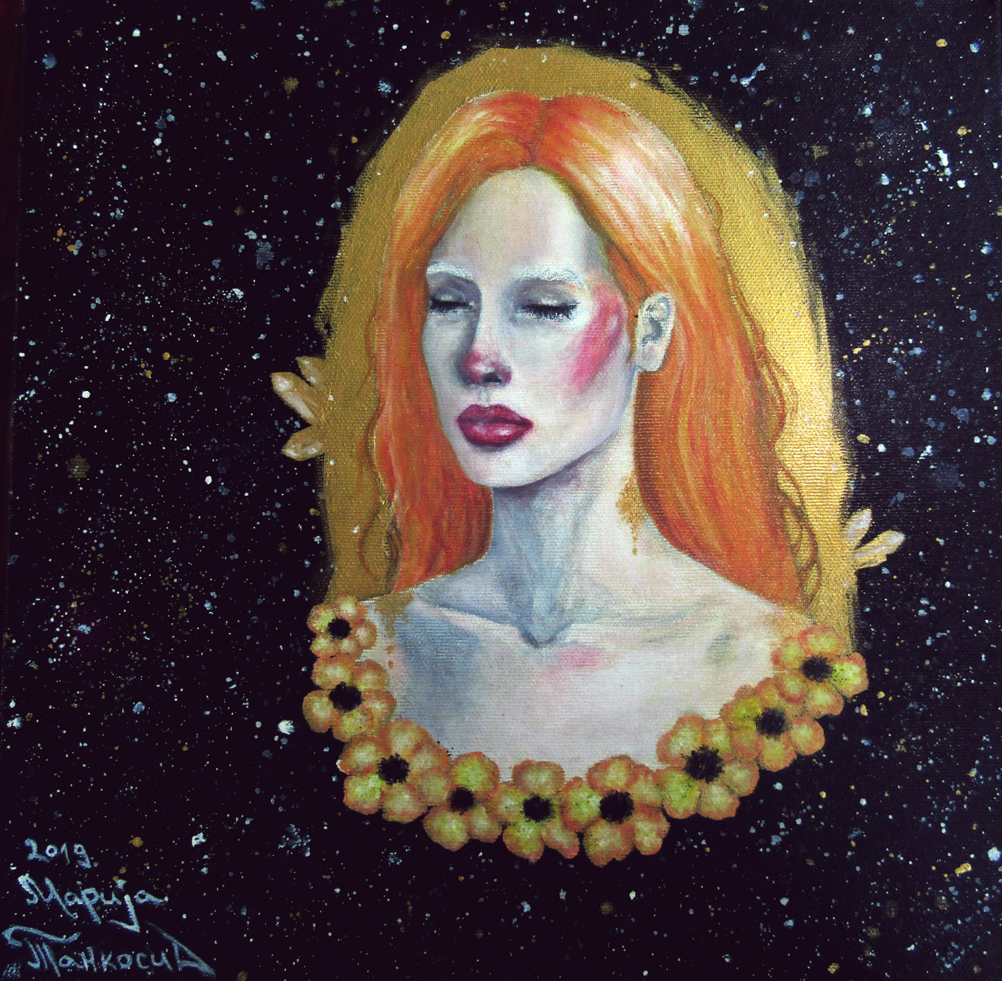 I had the idea to dry and press the flowers, so to paste it on the painting, however, I failed and so I had to paint the flowers. I used a thin brush for facial features, a biger brush for the background, and I protected the painting with lacquer for acrylic paint.