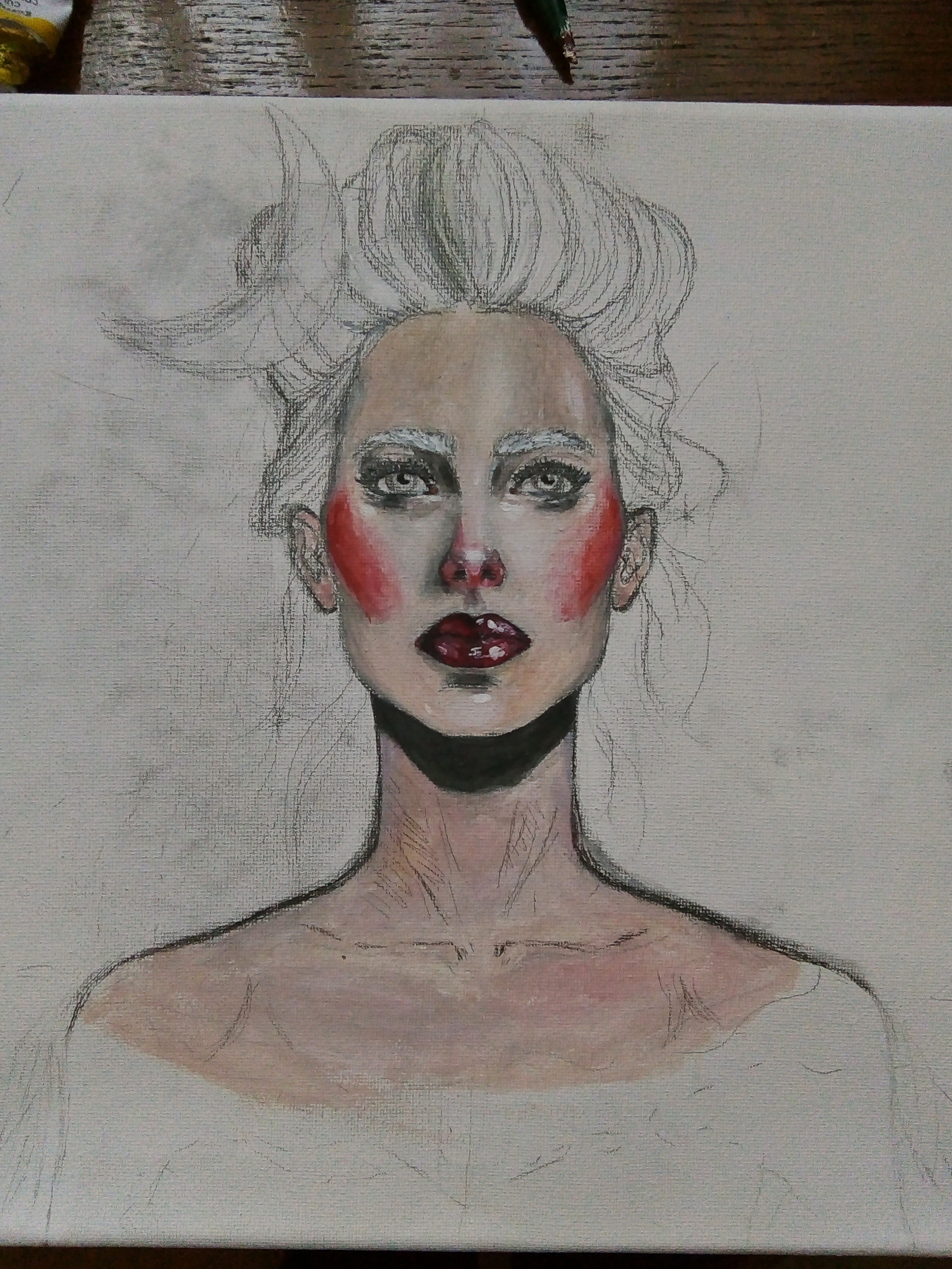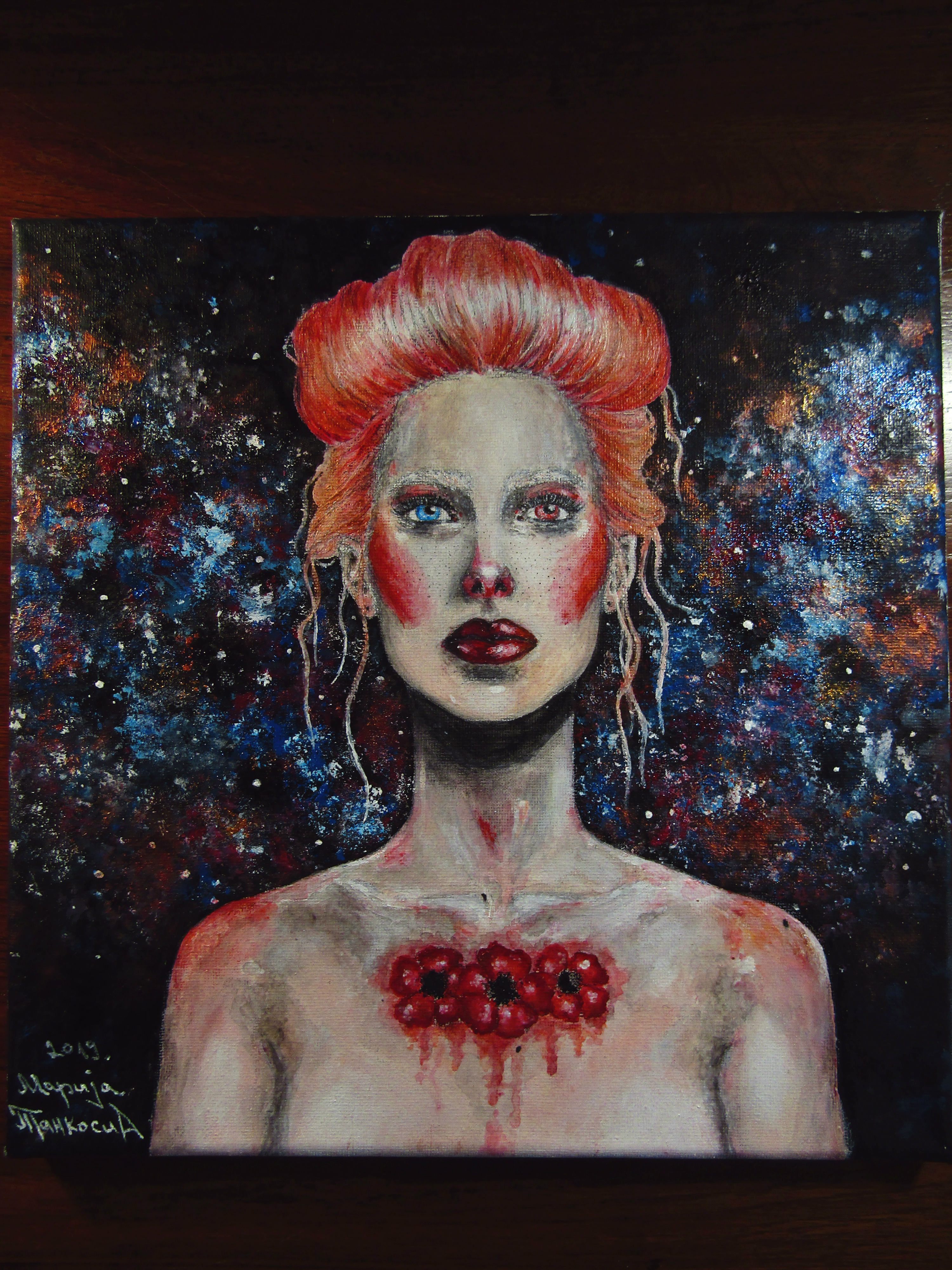 For the background I used a little thicker brush, I achieved the appearance/ impression of the universe by tapping various colors on a canvas with brushes. Also, on the background I added eyeshadow too, tapping it with my fingers on a canvas. For portrait I used really thin brushes, to be more precise. I painted her hair with acrylic paint and eyeshadow.