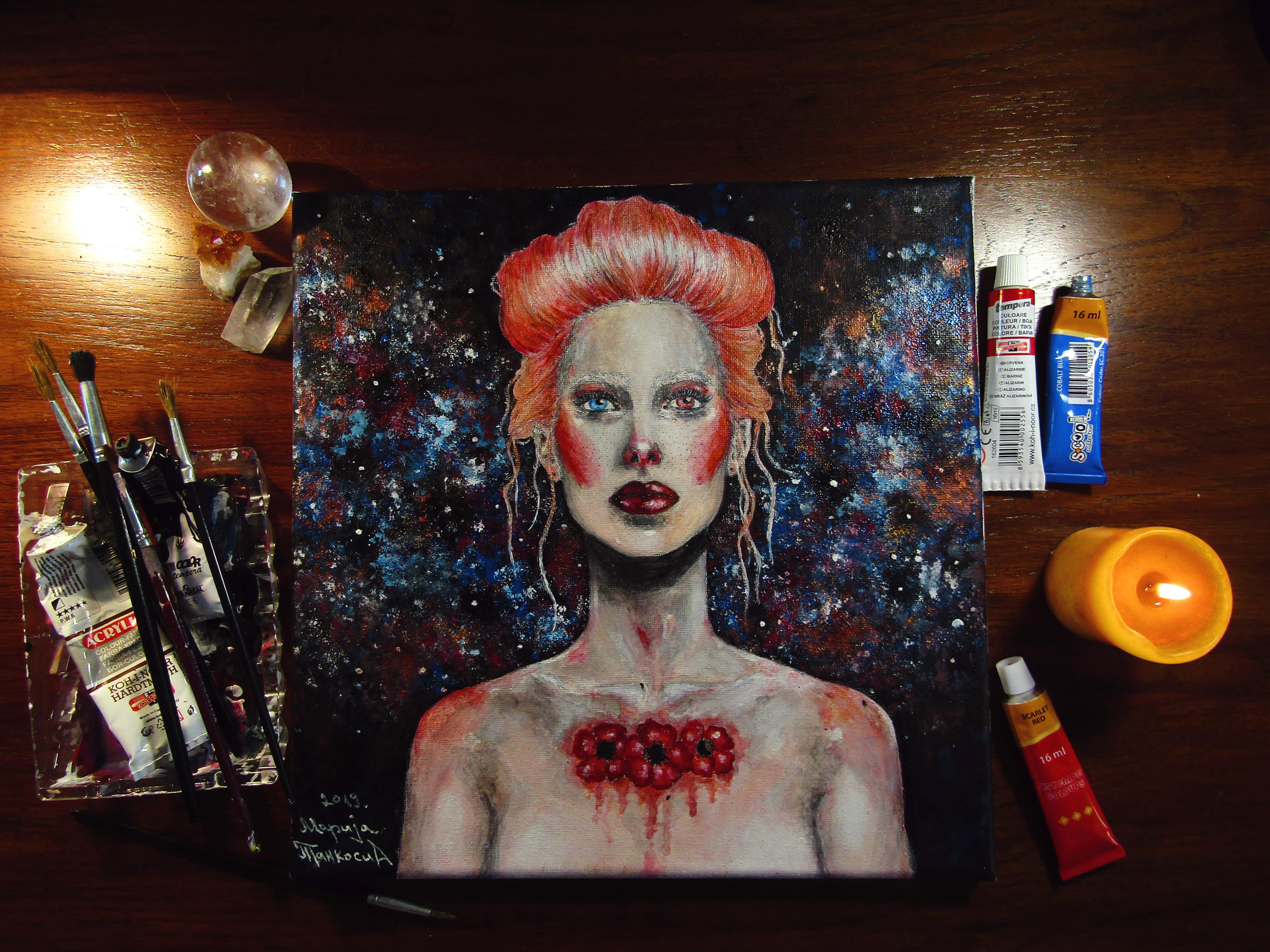 The way she stands so straight and alone, with the bloody flowers on her chest and against the cosmos.... It makes this piece so surreal and interesting <3