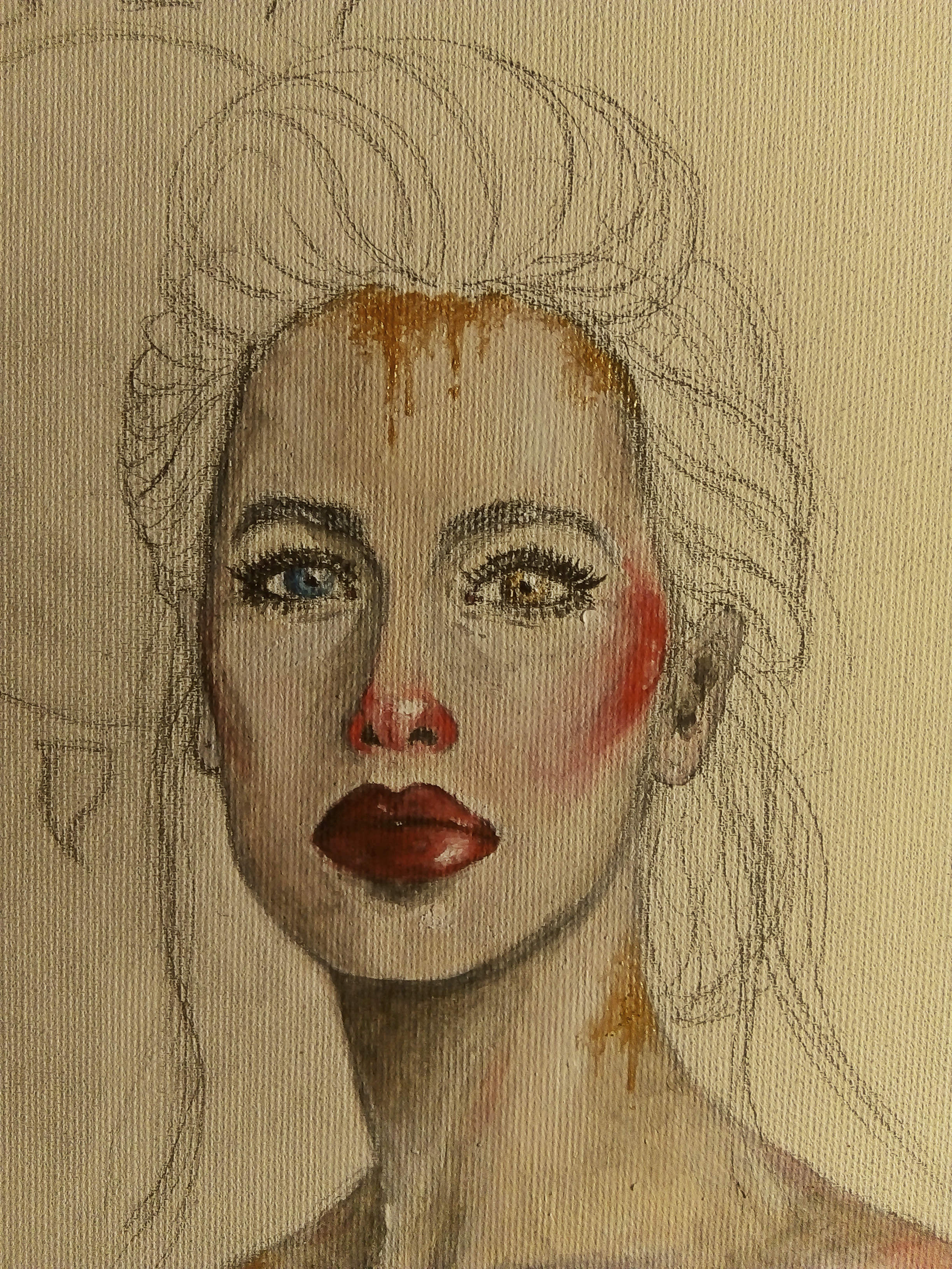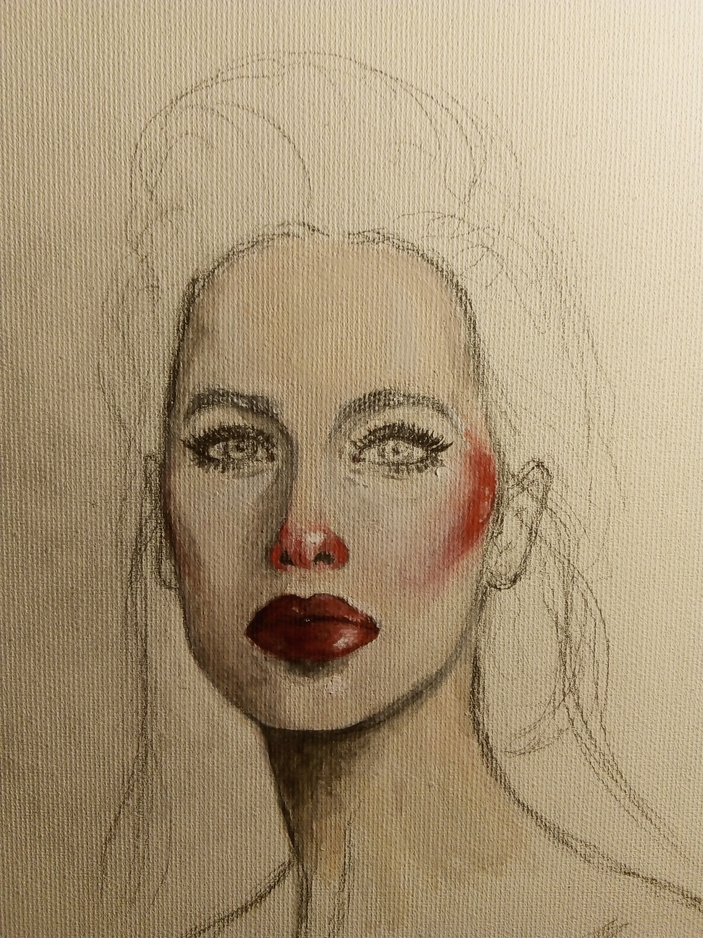 I did not have a well-defined idea of how this painting would look. I can say that it was spontaneous. Still, I did not have a problem with the facial features. Here you can see some initial phases of the painting: