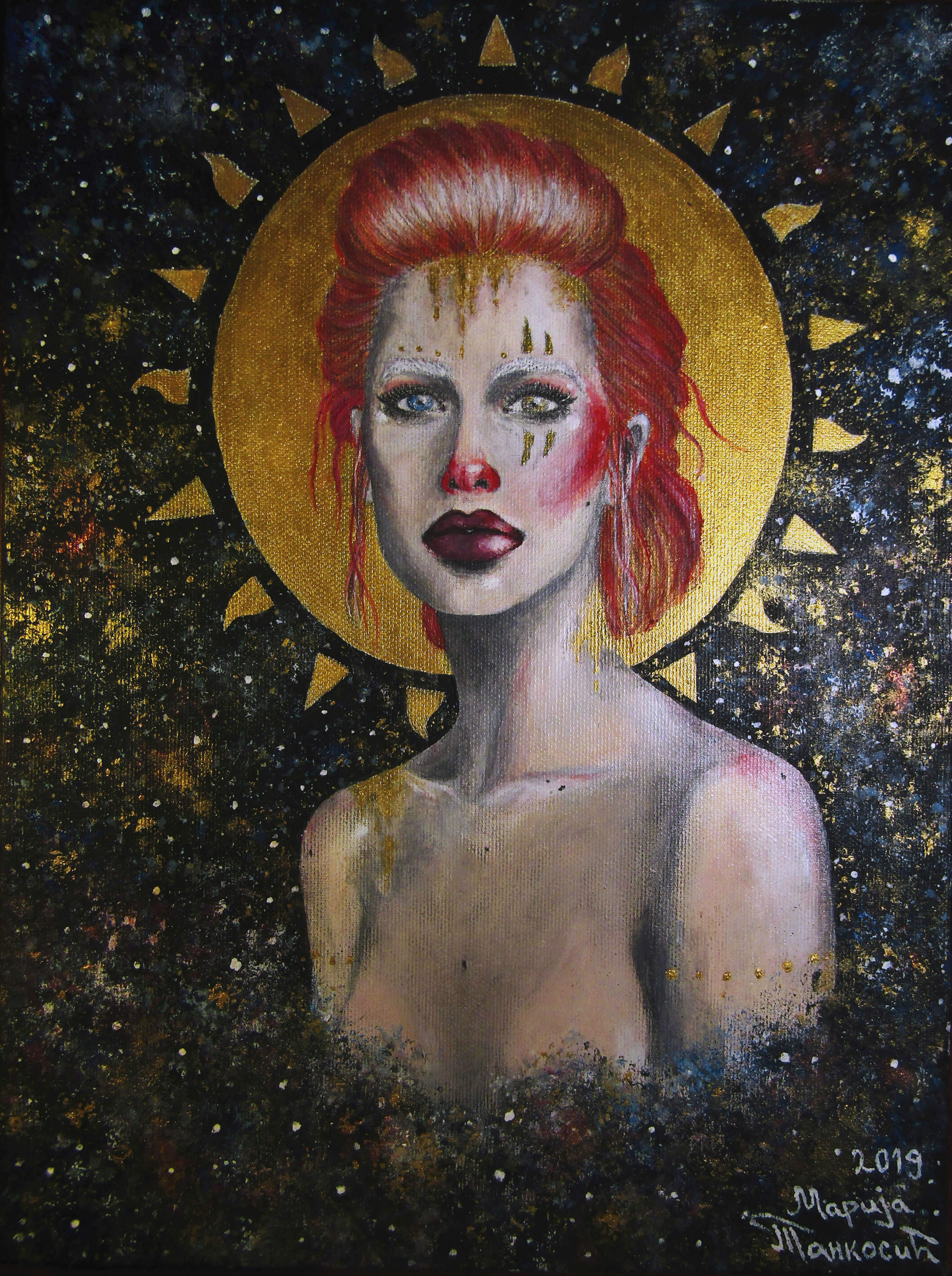 I used acrylic paints and eyeshadow (copper color). For the first time I used a golden acrylic paint and I can say that I'm thrilled. At the end, as I always say, I covered the painting with lacquer. Lacquer really gave beautiful shine to painting and protect colors. For the background I used a thin brush that I taped on a canvas to create the impression of the universe. I also used a thin brush for the face, for precision. Size of canvas is 40x30.