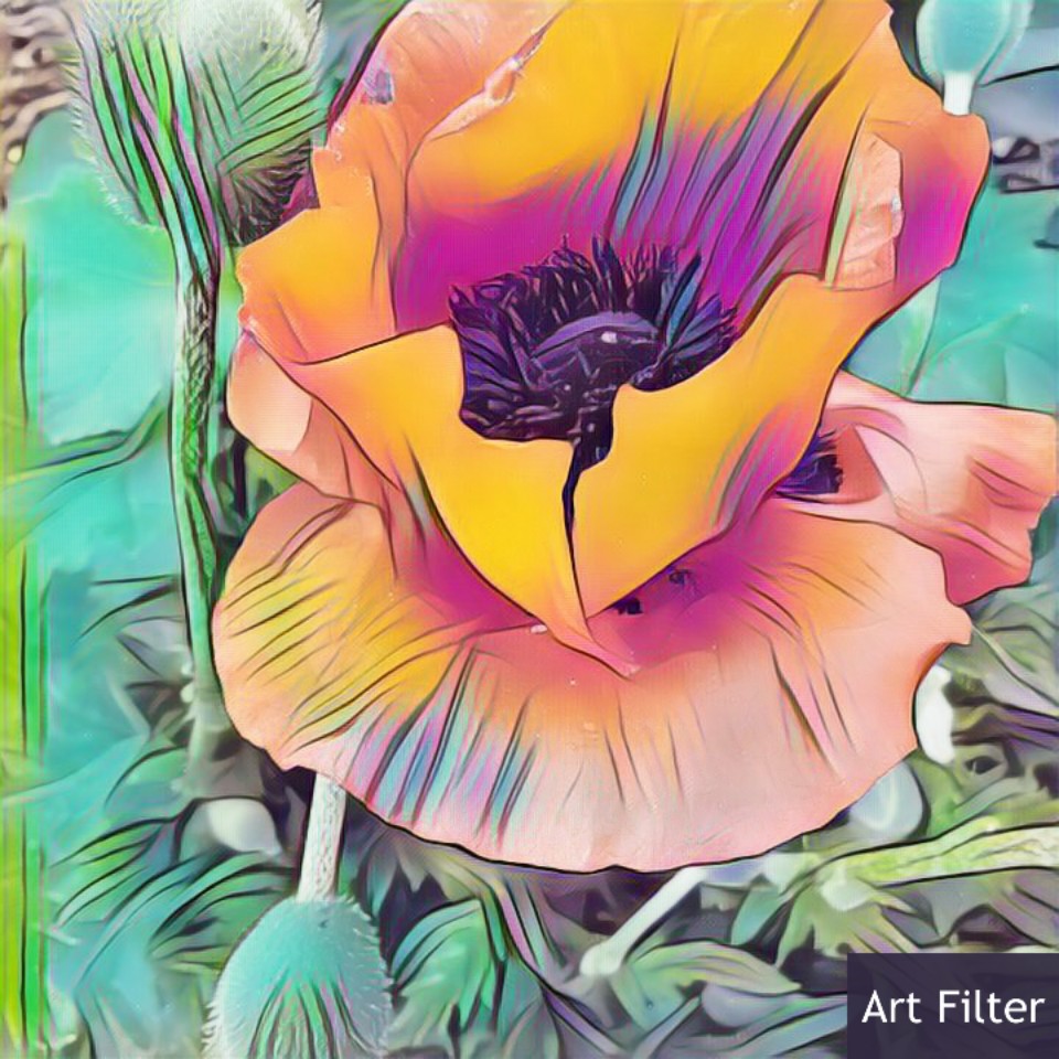 I grew the original poppy in my yard. I took many pictures and decided on this view. I ran it in an app that allowed me to play with the shape and color