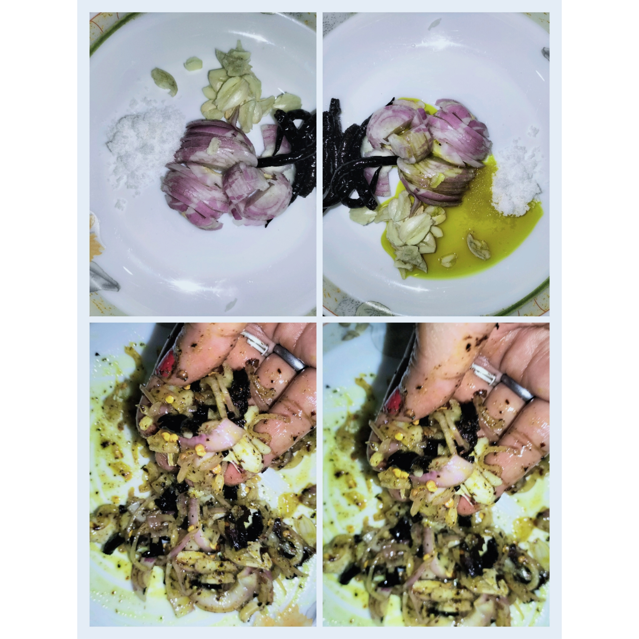 এখন শুকনা মরিচ ভাজা কাঁচা পেঁয়াজ কুচি,থেতানো কয়েক কোয়া রসুন ও সরিষার তেল,লবন একত্রে নিয়ে হাত দিয়ে খুব ভালে করে মেখে নিয়েছি।