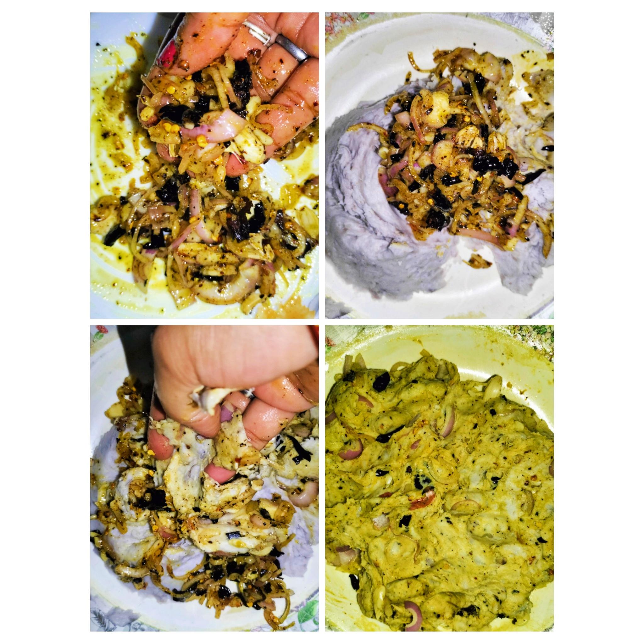 এখন আগে থেকে ম্যাস করে রাখা কচুর ছরা গুলোতে মেখে নেয়া সব গুলো উপকরণ দিয়েছি ও আমারও সুন্দর করে কচুর ছরার সাথে সব উপকরণ দিয়ে মেখে নিয়েছি।