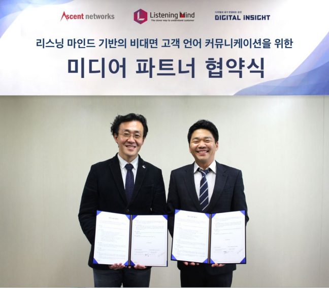 ㈜어센트 네트웍스와 ㈜와이어링크(이하 양사)는 글로벌 마케팅 데이터 플랫폼 ‘리스닝 마인드’ 프로젝트에 대한 미디어 파트너 협약을 체결했다고 밝혔다.