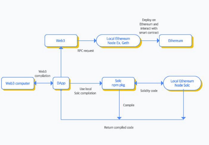 위의 순서도는 DApp '의 구체적인 실행 과정을 자세히 보여줍니다. 로컬 이더 리움 노드와의 상호 작용은 로컬 또는 Web3에서 컴파일 된 견고성 코드를 사용하여 RCP 프로토콜을 통해 수행되며 스마트 계약 형식으로 이더 리움의 메인 체인에 배치되어 수정이나 변경이 허용되지 않습니다.