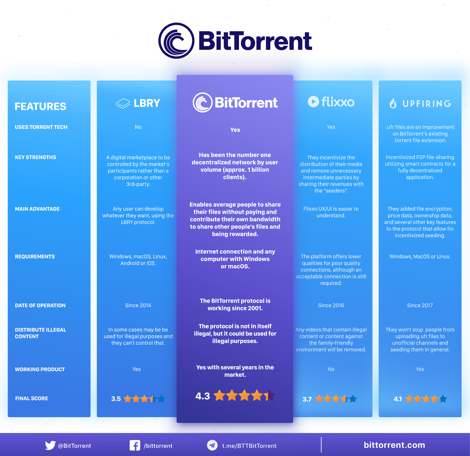 •Unify strategies aimed at reducing structural shortcomings of the BitTorrent protocol: Primarily, the issue being tackled by the BTT project is the need to provide its users with a variety of market-driven incentives so as to improve their partnership. The mutual focus is to have both the developers and users work in unison towards boosting and extending the duration of BitTorrent swarms.