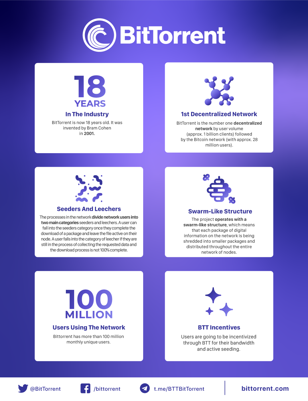 BitTorrent, with over 100 million users across 138 countries, aims to tokenize the decentralized file-sharing protocol with their cryptocurrency token. The token, BTT, was unveiled on January 20, 2019 as a TRC-10 utility token built on the TRON blockchain. The unveiling came after the acquisition of the project by TRON as part of a $140 million deal.