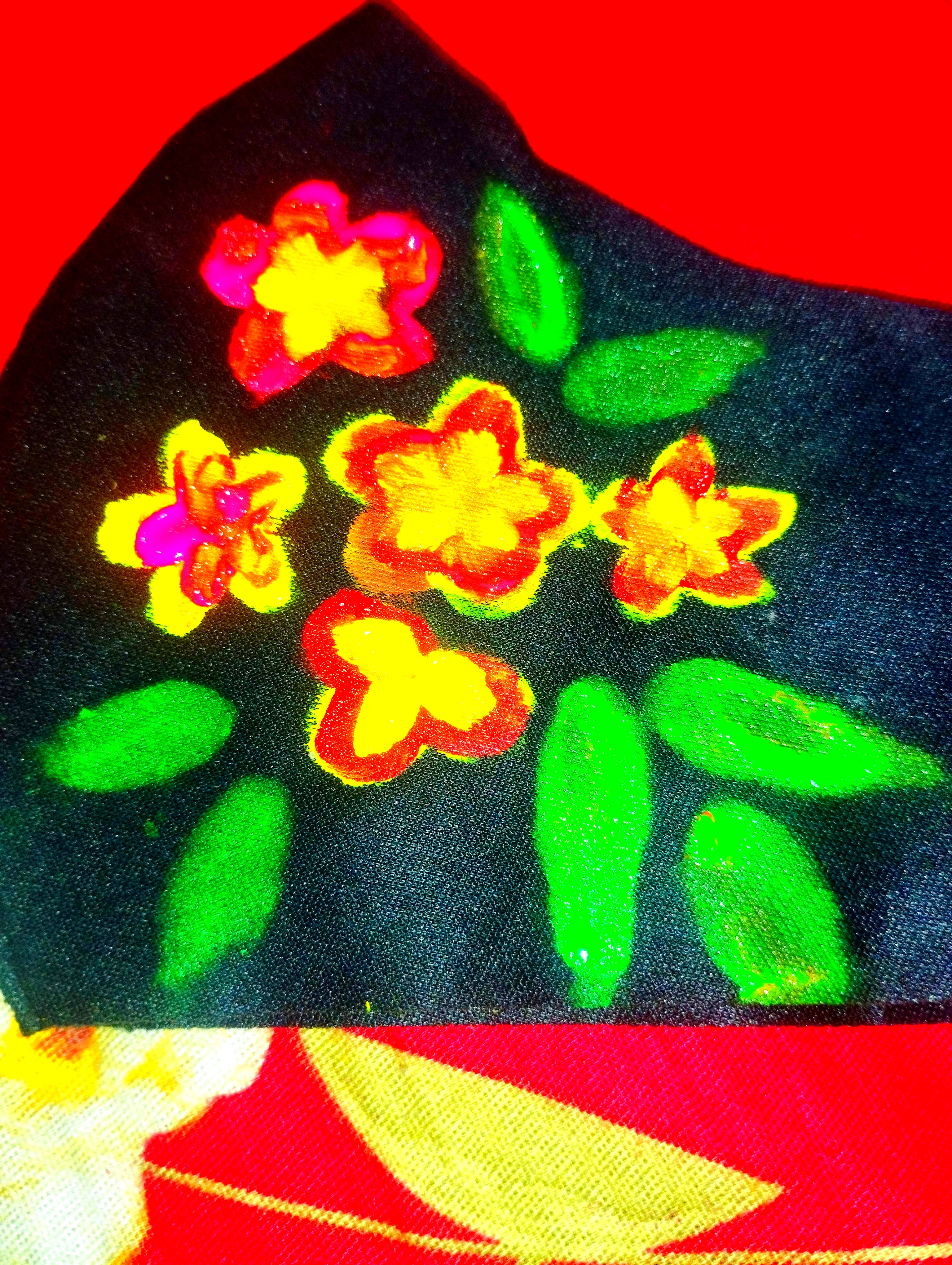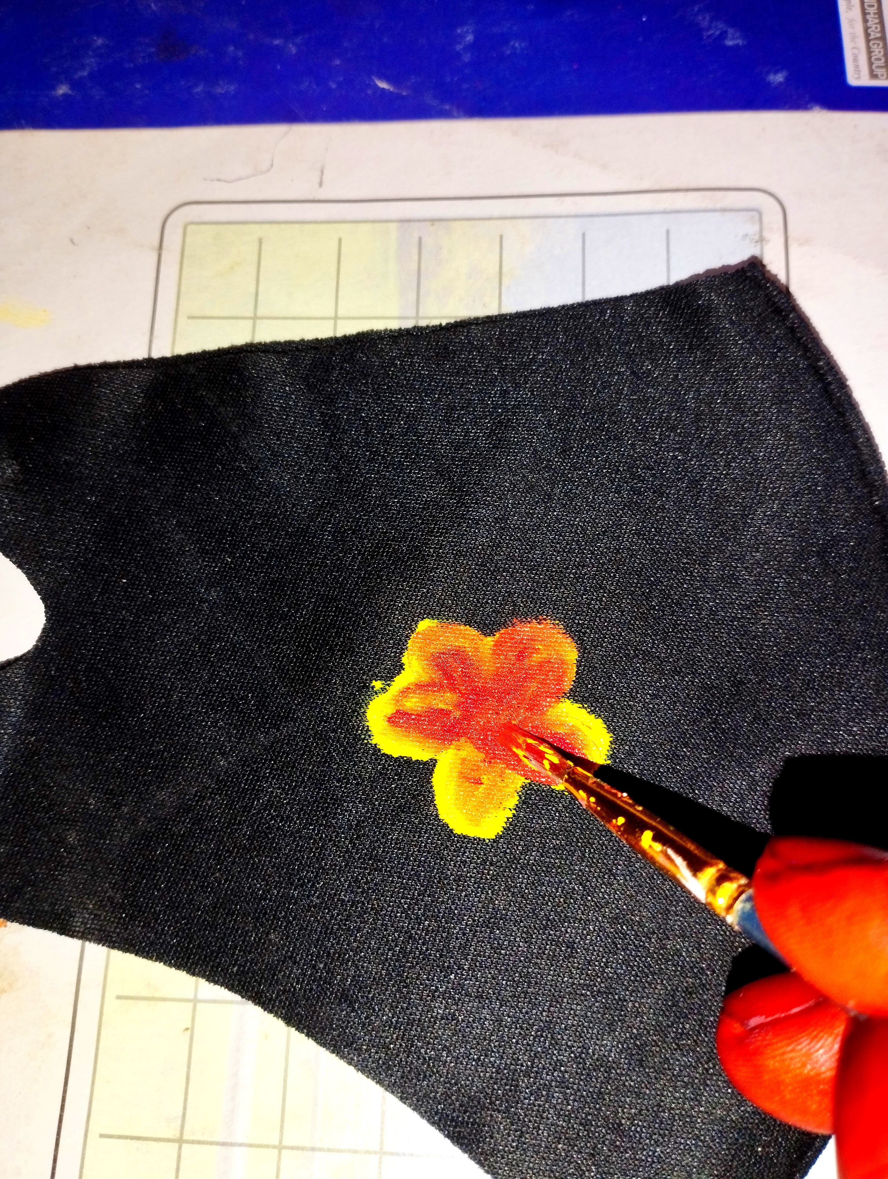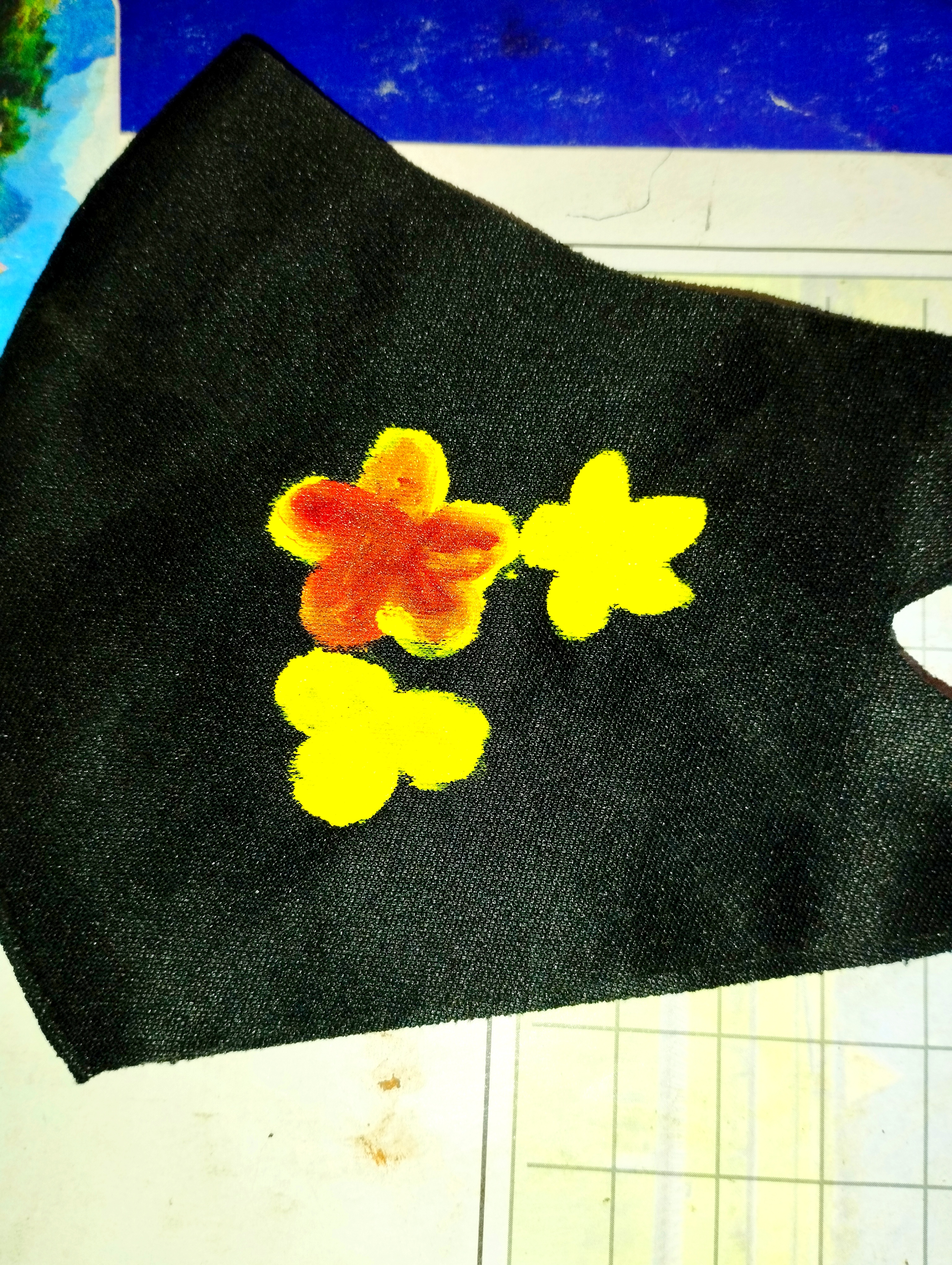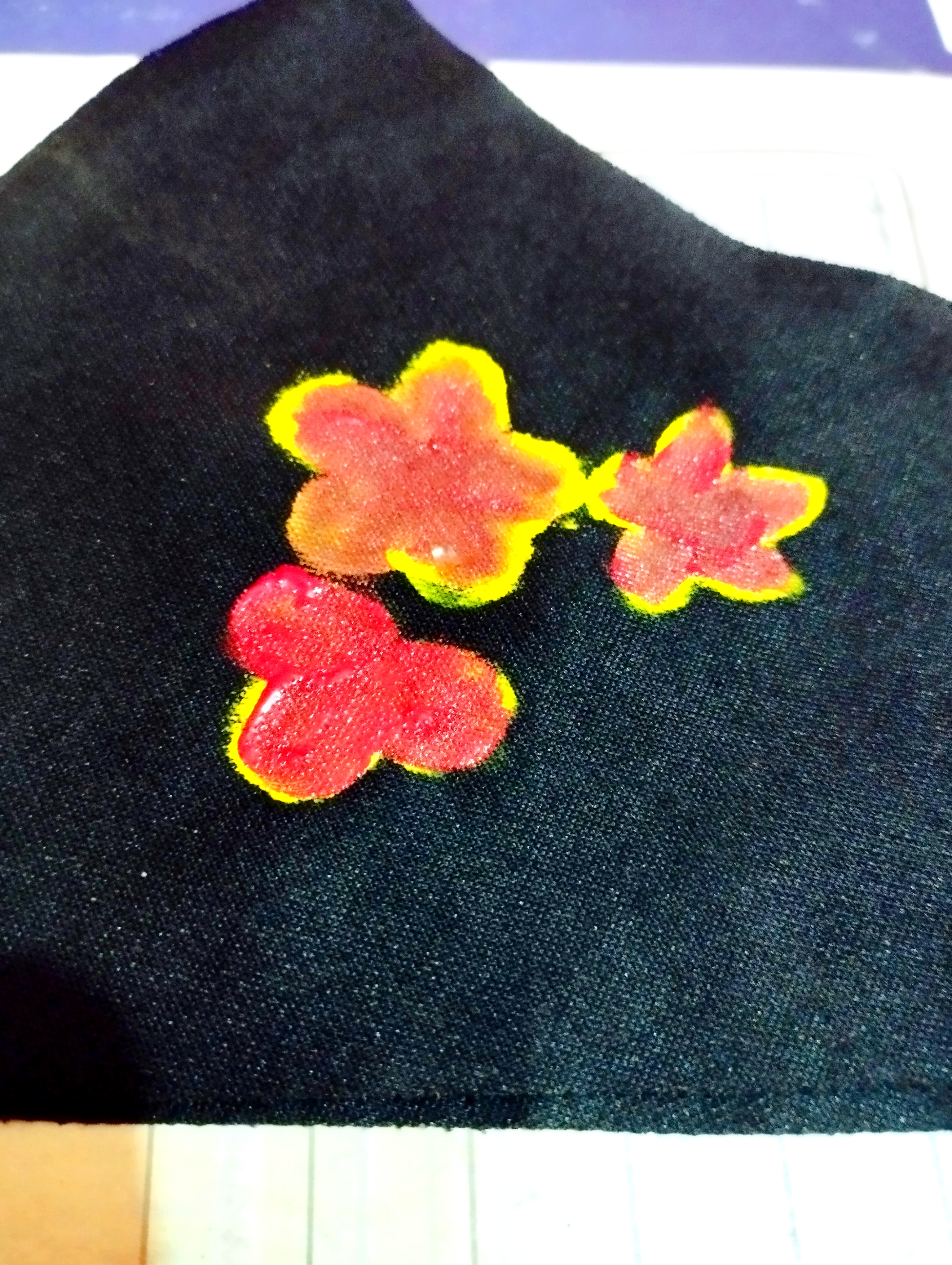 প্রথমে আমি একটি কালো কাপড়ের মাক্স নিয়ে নিয়েছি। এবার মাক্সের উপর হদুল রঙ দিয়ে ৪-৫টা পাপড়ি দিয়ে একটু ফুল তৈরি করে নিয়েছি।