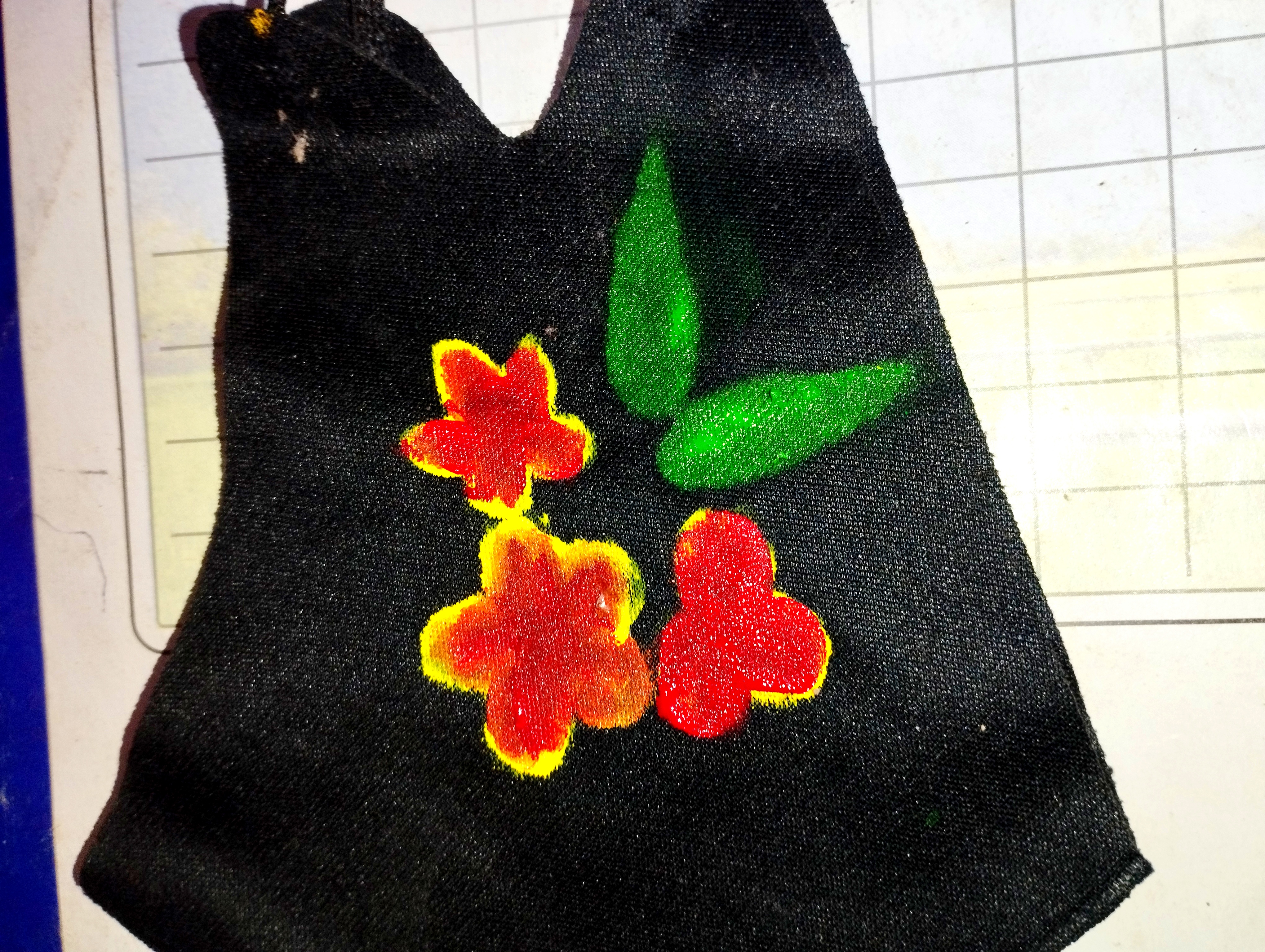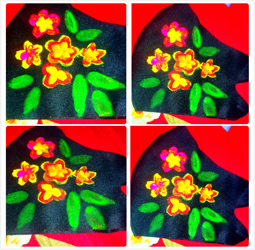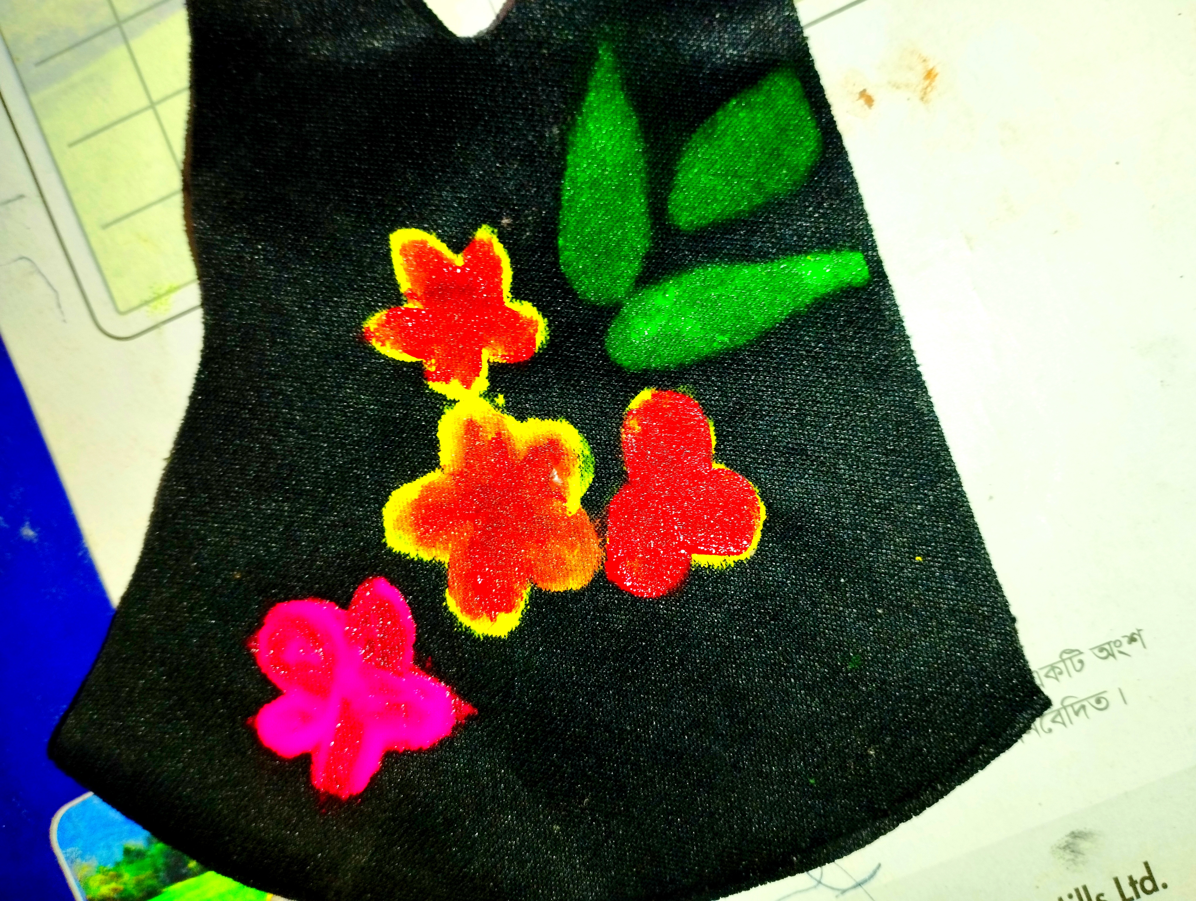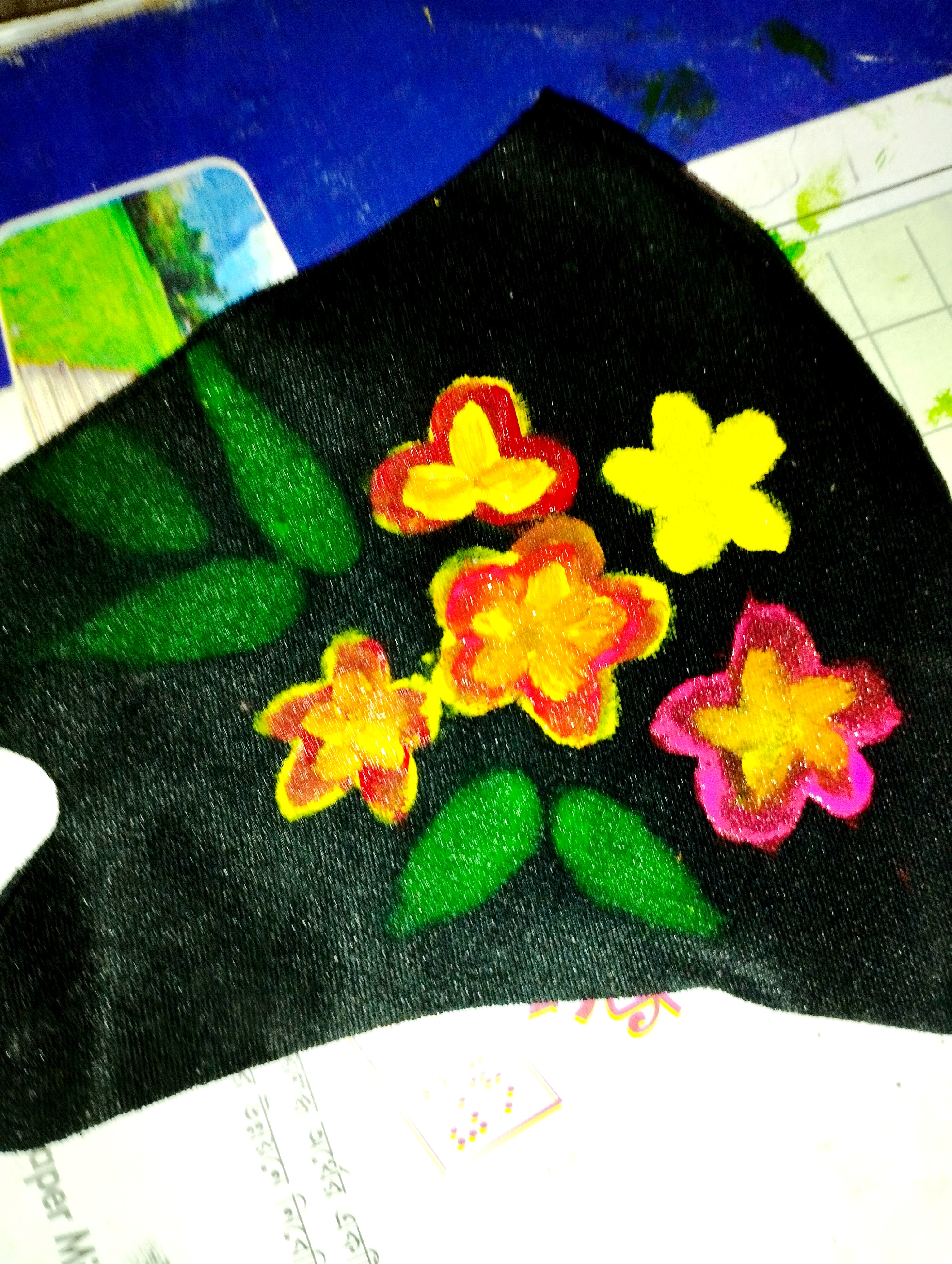 প্রথমে আমি একটি কালো কাপড়ের মাক্স নিয়ে নিয়েছি। এবার মাক্সের উপর হদুল রঙ দিয়ে ৪-৫টা পাপড়ি দিয়ে একটু ফুল তৈরি করে নিয়েছি।