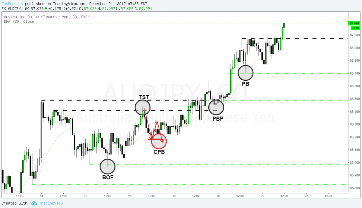 AUDJPY在处于紧张状态时,人性的决策制定和行为的可预测性大大提高,一般会表现得更加不顾一切,更加充满紧迫感.这恰好是我们正在探询的东西.供需失衡实际上不一定意味着一方的数量较多,而是绝望或紧迫感的失衡. 想像在海边,所有游客的行为,位置,行走路线 基本上是不可预测的...从集体来看,所有的游客行走路线及正在做的事看起来是随机的... 如果突然发生海上警报,不论是海浪还是鲨鱼来袭...此时他们的心理状态及行走路线开始变得容易预测 通过分析,我们能够辨识出大群交易者处于极度紧张状态的区域,他们被迫以一种合理的可预测的方式操作 這些也就是YTC PA 的理論基礎~ 在YTC PA的所有架构背后有两大主要思想-1.反弱势2.反被套交易者 找出弱势.找出被套交易者.反弱势入场,成为触发圈套的订单流的一部分. 致力于在图表上找出其他交易者们正与市场观点相抗争的位置. 我们找出他们认识到自己错了,被迫离场的那些区域 图表内容为5种架构的展示 测试架构( TST -1.09% ),突破失败架构( BOF -0.93% ),突破回撤架构(BPB),回彻架构( PB 2.16% ),复杂回彻架构( CPB -0.42% )