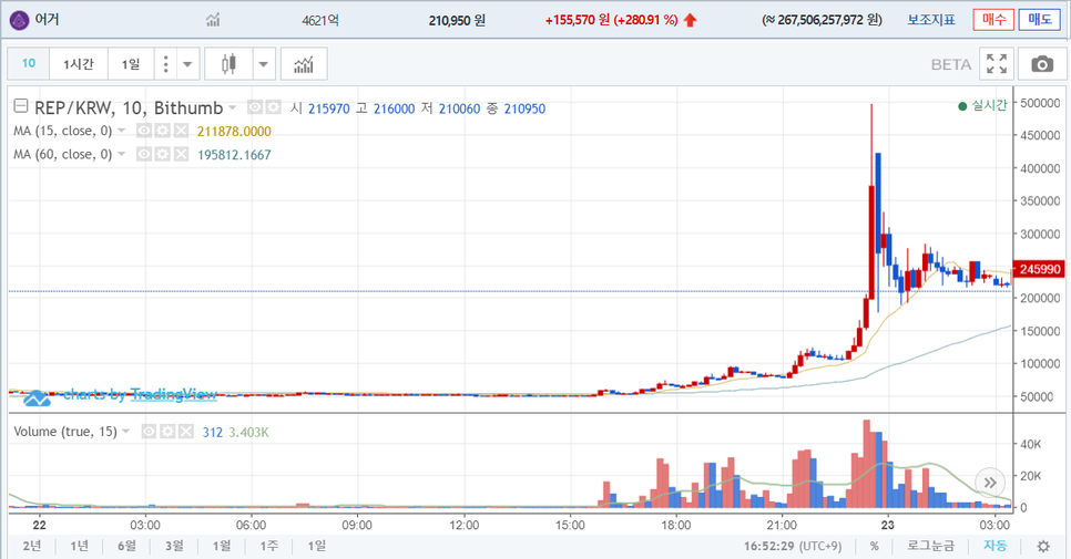 빗썸에서 하루만에 5만원 정도를 유지하고 있던 어거가, 50만원을 터치하고 왔습니다.