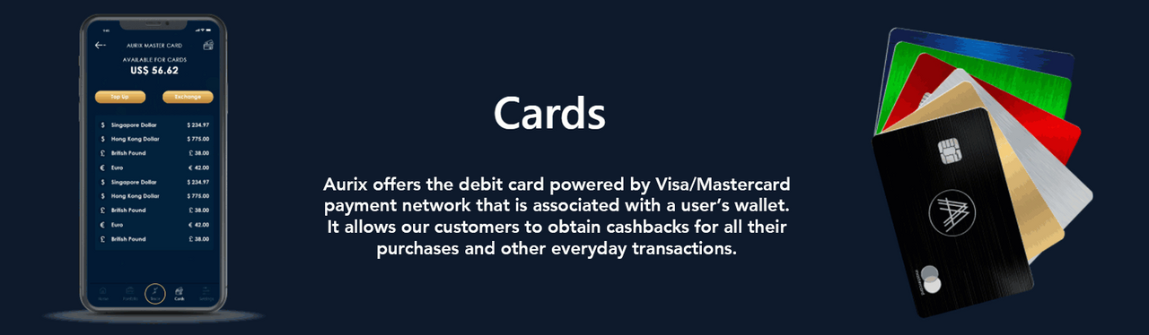 Aurix offers the debit card powered by Visa/Mastercard payment network that is associated with a user’s wallet. It allows our customers to obtain cashbacks for all their purchases and other everyday transactions.