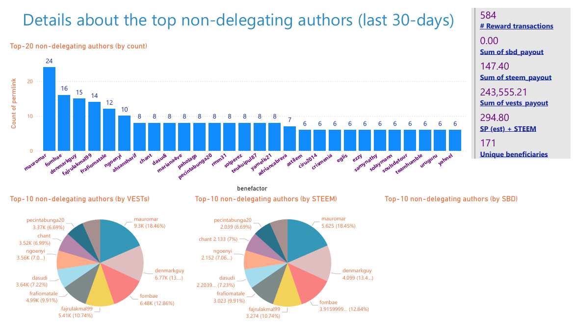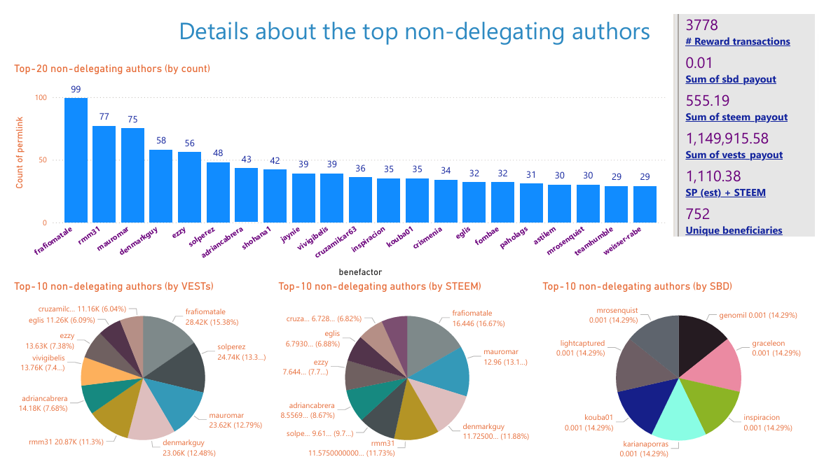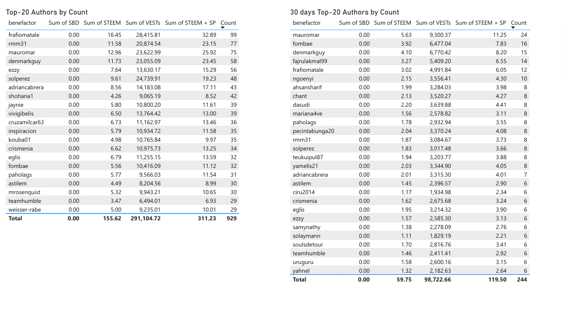 Details about beneficiary rewards to the top authors (by count) / 30 days