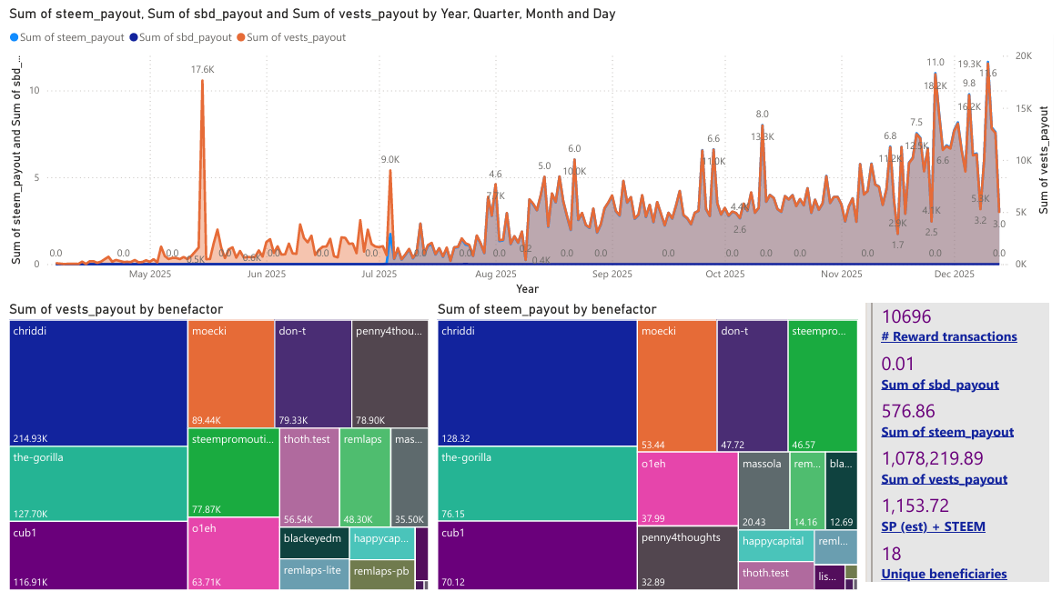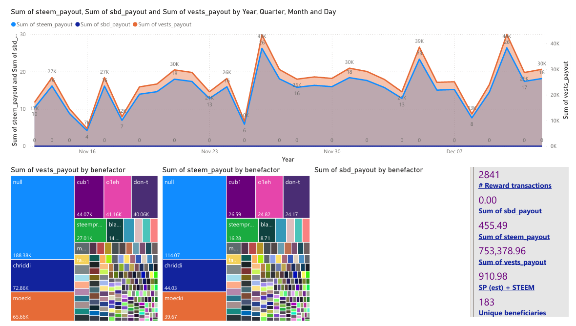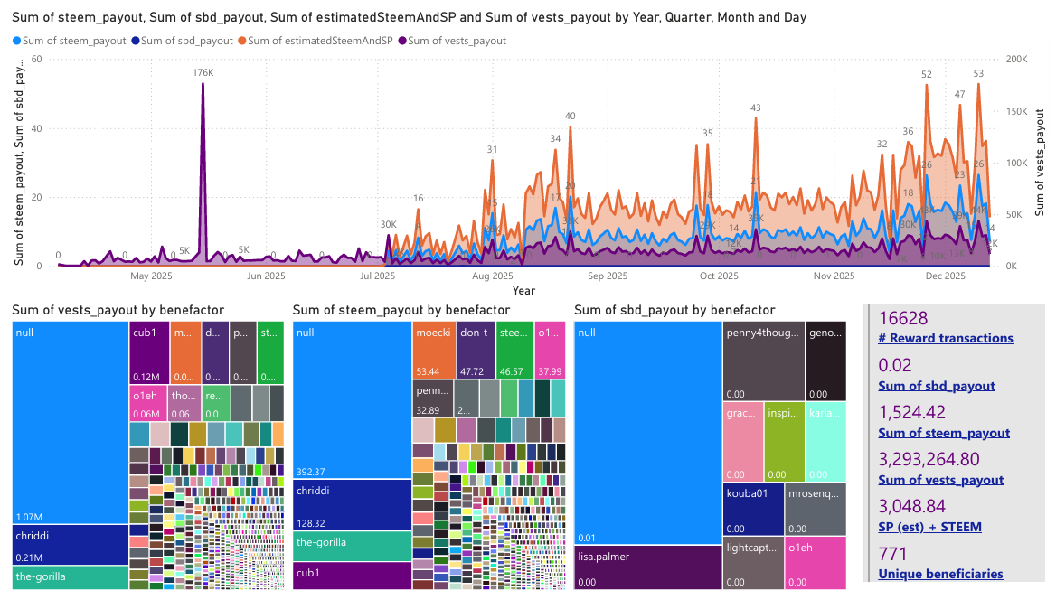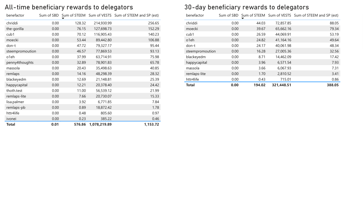 | Total beneficiary payouts (STEEM * 2 ) | 3,048 STEEM | 910 STEEM |