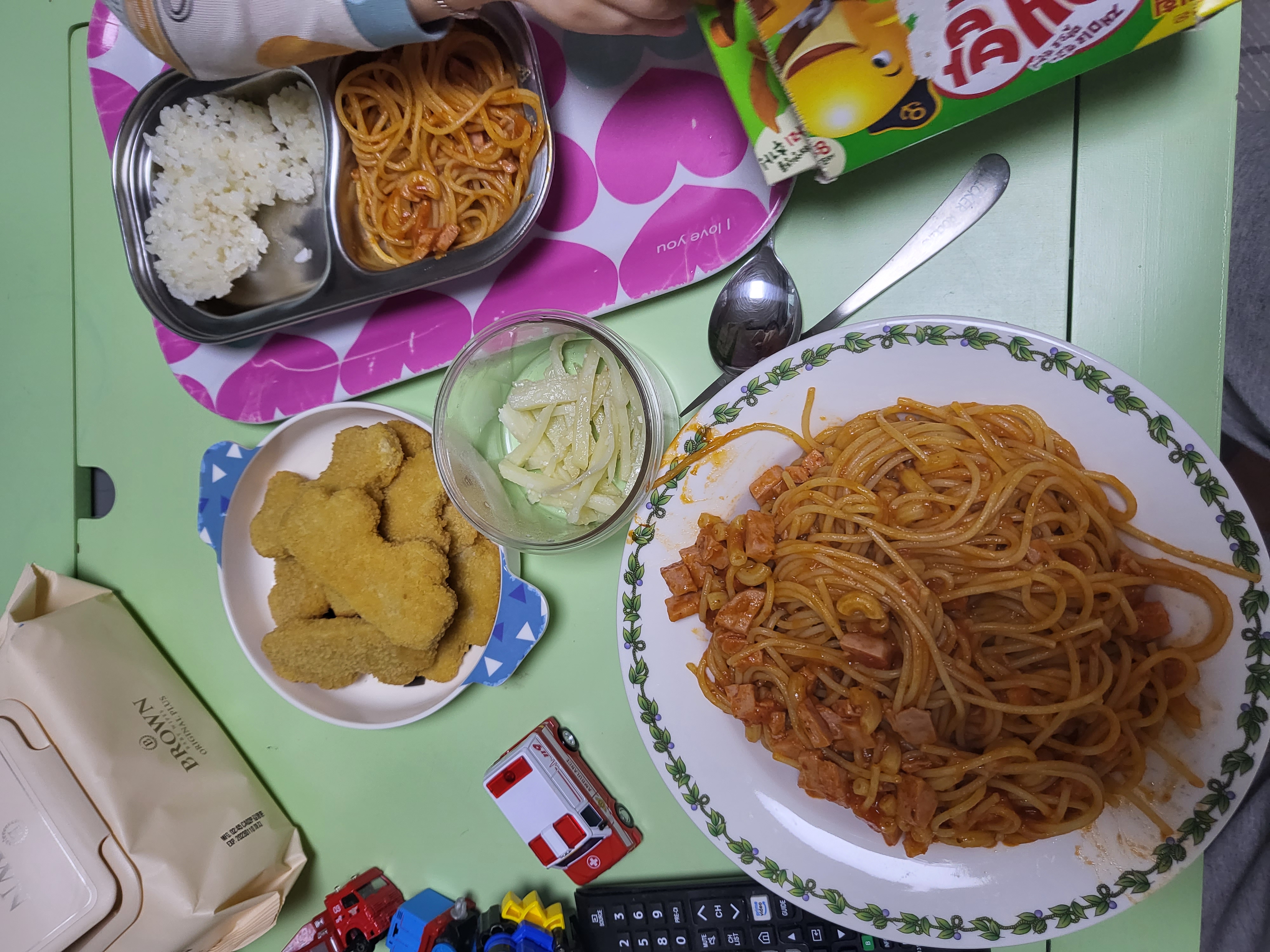스파게티 먹기~dudska11 (62)in Avle 여성 육아 • 4 years ago 집에서 스파게티를 해먹지는 않았는데 얼마전에 얼집 간식으로 나온 스파게티를 잘먹었다고 하여 하원후 스파게티를 만들어 봤어요 양조절실패로 양이 엄청많네요 ㅋ 접시에 전 가득 ~ 아들은 타요 치킨너겟이랑 밥 스파게티주었네요 혹시 스파게티 안먹으면 치킨너겟이라도 먹일려고 ㅋ 스파게티는 먹지 않고 너겟먼저 잡은 아들 ㅋ 스파게티 반 협박으로 먹였네요 ㅋ 담에는 스파게티 안 하는걸로 다짐했어요 ㅋ #kr #momscafe #krsuccess